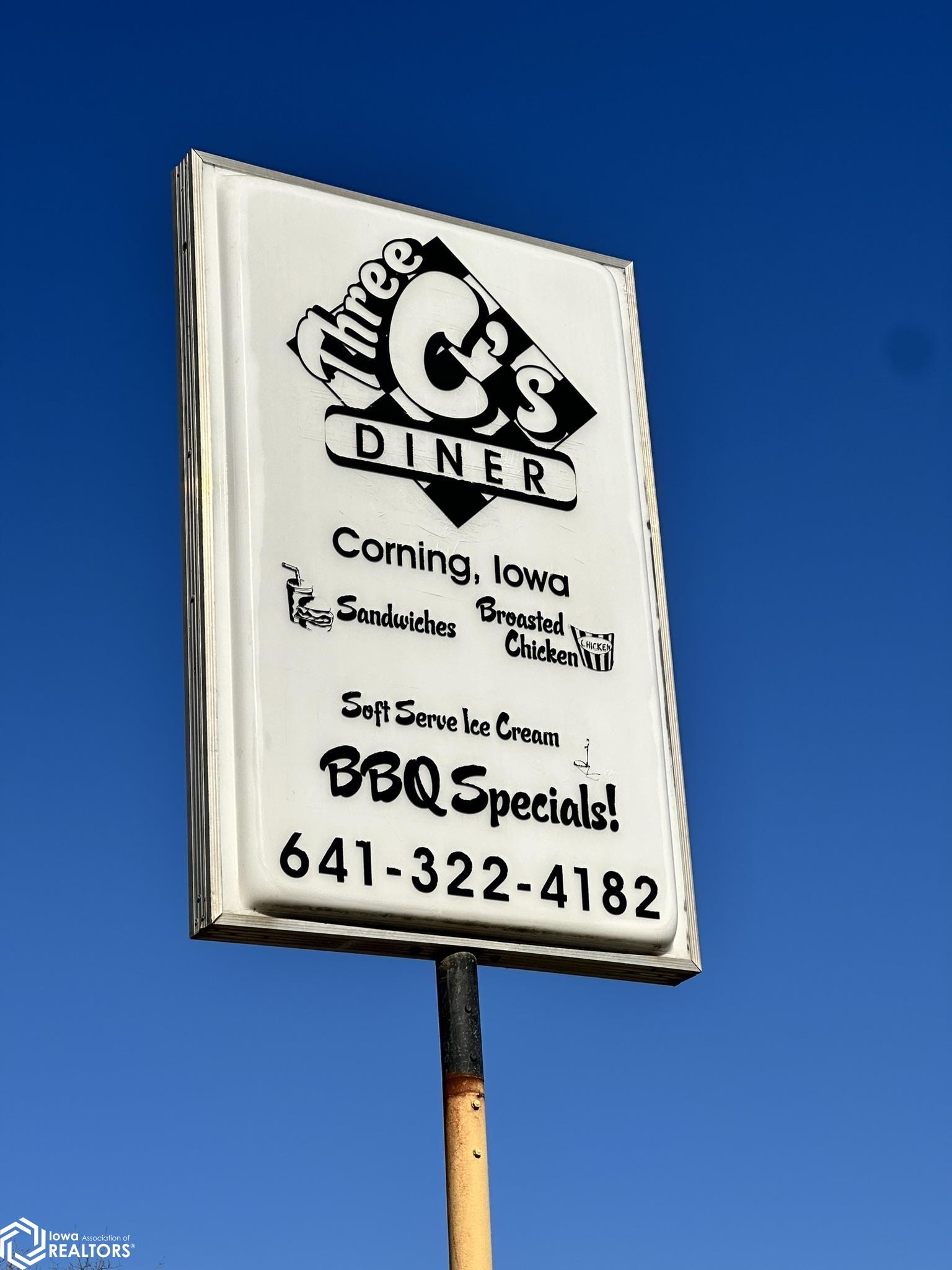 Seize this unique opportunity to own the renowned Three C's Diner, celebrated for its prestigious title of Iowa's Best Breaded Pork Tenderloin in 2018. This thriving establishment is a cornerstone of the Corning community, offering a profitable business model with multiple revenue streams. With a strong customer base, acclaimed menu, and included assets, this business offers immediate income potential as a turn-key operation with opportunities for growth in both dining and catering services. The sale includes all restaurant equipment (excluding perishable inventory), ensuring a seamless transition for the new owner. Benefit from an established catering segment complete with specialized equipment, a smoker for authentic barbecue offerings, and a dedicated catering van. The property features an adjacent home, providing a convenient space during off-peak hours or comfortable on-site living accommodations. The property features an office space ideal for administrative tasks and business operations, a fully equipped kitchen, a loft bedroom, 1 bath, and laundry. You'll receive 3-for-1: an established restaurant, catering potential, and an office/home site. Don't miss the chance to own this celebrated dining establishment!