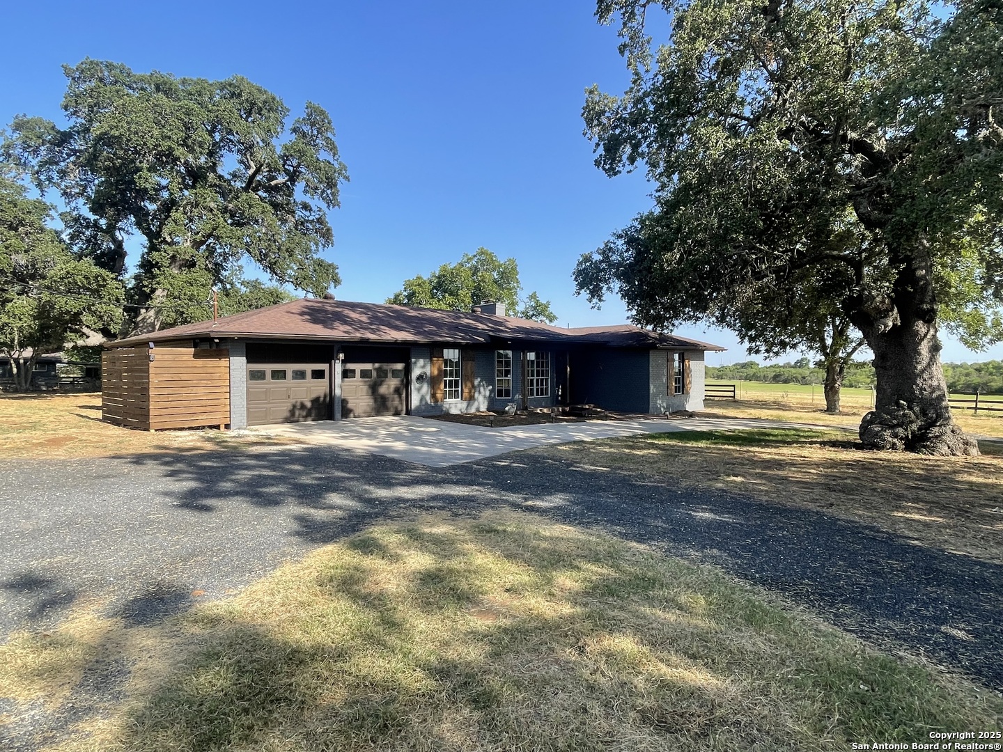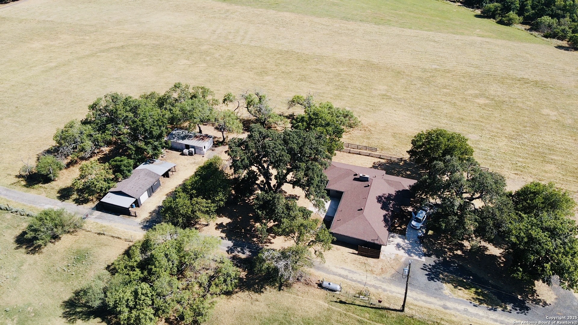 A Distinctive Estate in China Grove. Set on 3.33 acres beneath a canopy of mature oak trees, this property offers a rare opportunity to own a piece of China Grove s history. Originally built as the private residence of a noted San Antonio restaurant entrepreneur, the home blends farmhouse character with timeless comfort. Uniquely, the estate is bordered on nearly all sides by the expansive Blanco X Ranch-approximately 400-500 acres of pristine farmland-providing an exceptional sense of privacy and open views. With quick access to IH-1604 and Loop 410, the location is just 20 minutes from San Antonio International Airport, Downtown, the AT&T Center, and the Alamo Dome. The 2,193 sq. ft. residence offers 3 bedrooms and 2 bathrooms. The open floor plan features a sunken living room anchored by a striking rock-wall fireplace, along with durable flooring ideal for both everyday living and entertaining. The primary suite comfortably accommodates a king bed and oversized furnishings, with a private bath that includes a large walk-in shower, soaking tub, and dry sauna. Recent renovations have enhanced the home while preserving its original charm. Both bathrooms have been tastefully updated, and key systems-including the HVAC, ductwork, and roof-have been modernized for long-term peace of mind. Property highlights include: * HVAC system replaced in 2020 full ductwork updated in 2023 * New architectural roof installed in 2025 with transferable warranty * Flat, usable acreage suitable for additional improvements, outbuildings, or recreational use Positioned at the rear of the lot for maximum privacy, this property combines history, tasteful updates, and future potential in one of the area s most desirable settings.