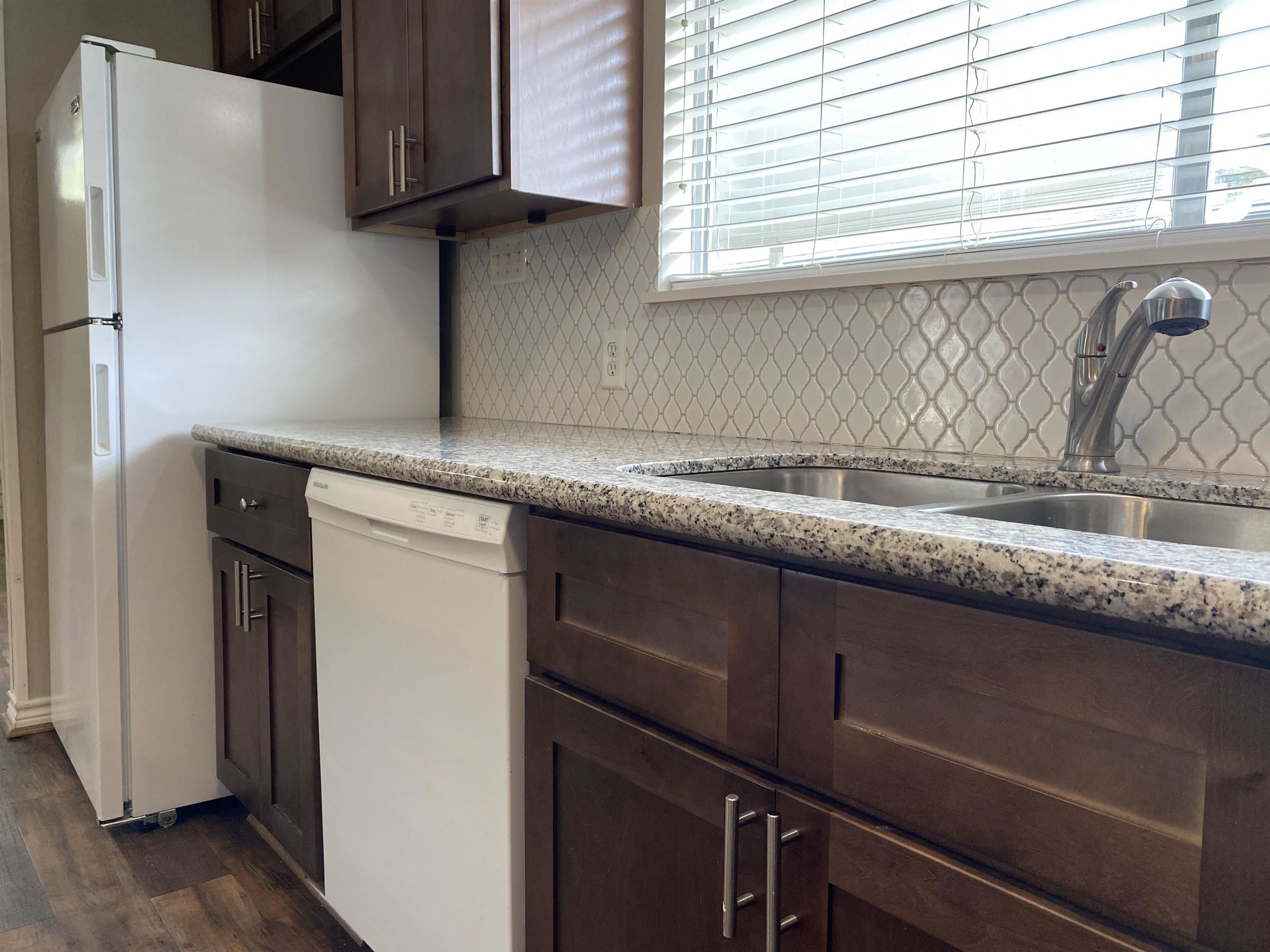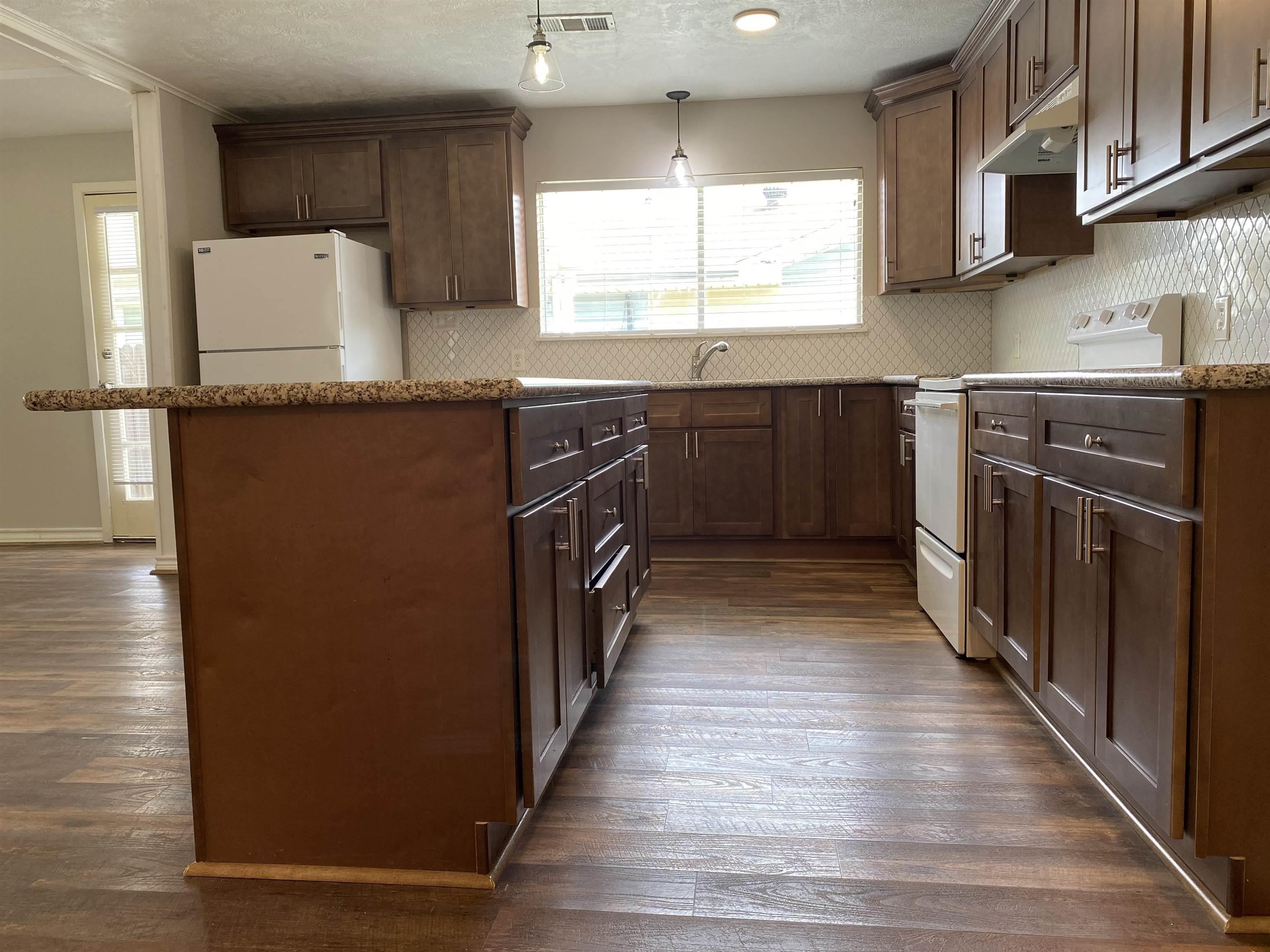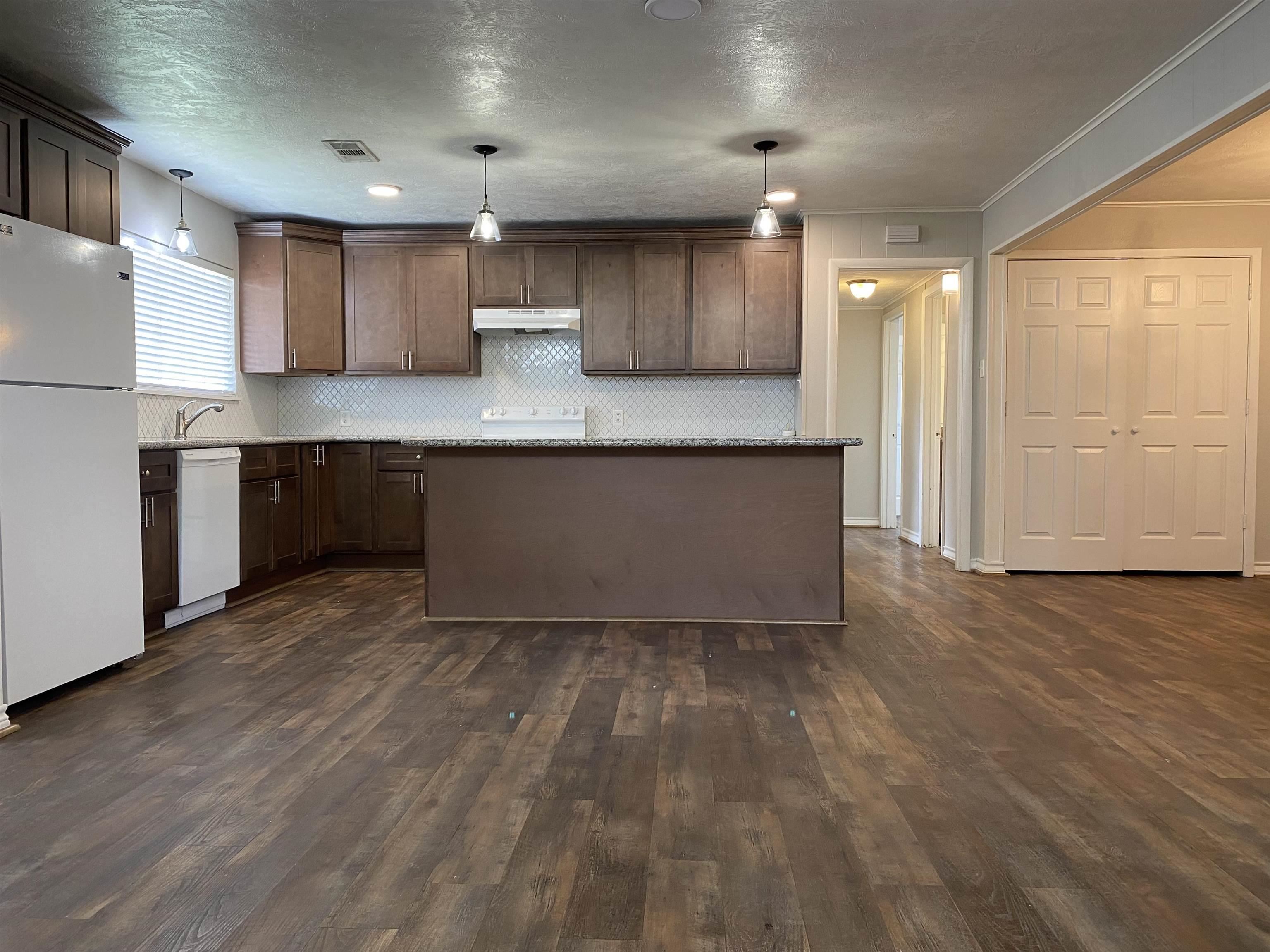 Adorable and beautifully updated home ready for immediate move-in! This spacious 2-bedroom, 1.5-bath home features thoughtful updates throughout and a functional layout designed for comfortable living. The inviting living room showcases a cozy wood-burning fireplace and flows seamlessly into the kitchen, creating a warm and open atmosphere. The kitchen is a standout with granite countertops, a large island, and modern finishes, perfect for cooking, gathering, and entertaining. Just off the dining area, youll find a versatile office or craft space complete with built-in cabinetry, ideal for working from home or hobbies. Step outside to enjoy the covered patio off the living room, offering a great space for relaxing or hosting guests. Call to schedule your showing today!