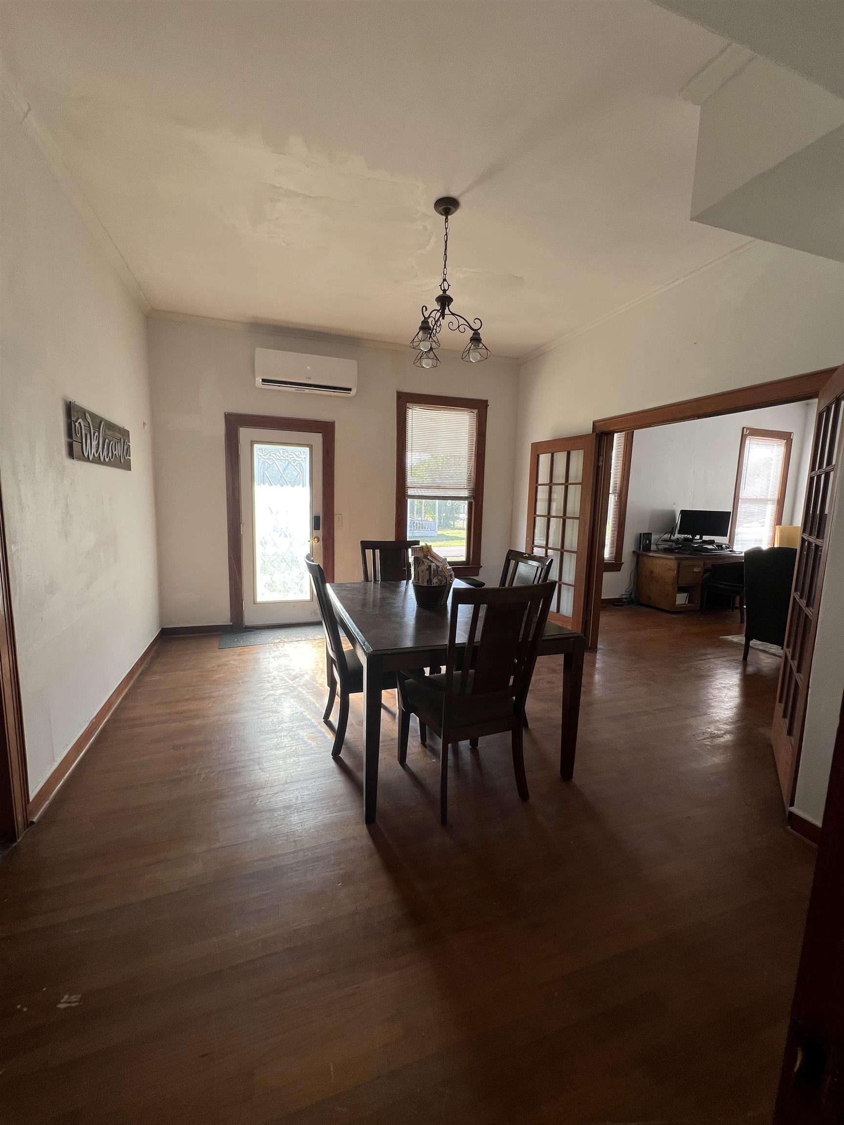 Two-story home in downtown Kirbyville. This home has 3 different rental spaces. This rental includes 4 bedrooms and 2 bathrooms. There is a Living Room and Den, which could easily be made into an office space. Featuring a breakfast room and Formal Dining. One Bedroom suite located downstairs with sitting area off the bedroom. Split AC/Heat units installed downstairs. Climb the preserved wooden staircase to find 3 Bedrooms and 1 bath with and efficiency kitchen. Large Balcony upstairs to sit and relax. Currently renting the efficiency kitchen, 1bedroom/1 bathroom upstairs that is attached with the main home as a rental unit with its own outside entrance. Also renting the 1 bedroom 1 bath garage apartment. You will need to provide your own portable ac/window units for upstairs if you find they are needed. This listing Main home renters will be responsible for upkeep of the yard. Furniture not included. $1700 Deposit $1700 month plus utilities.
