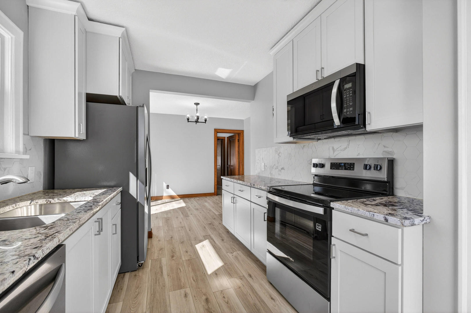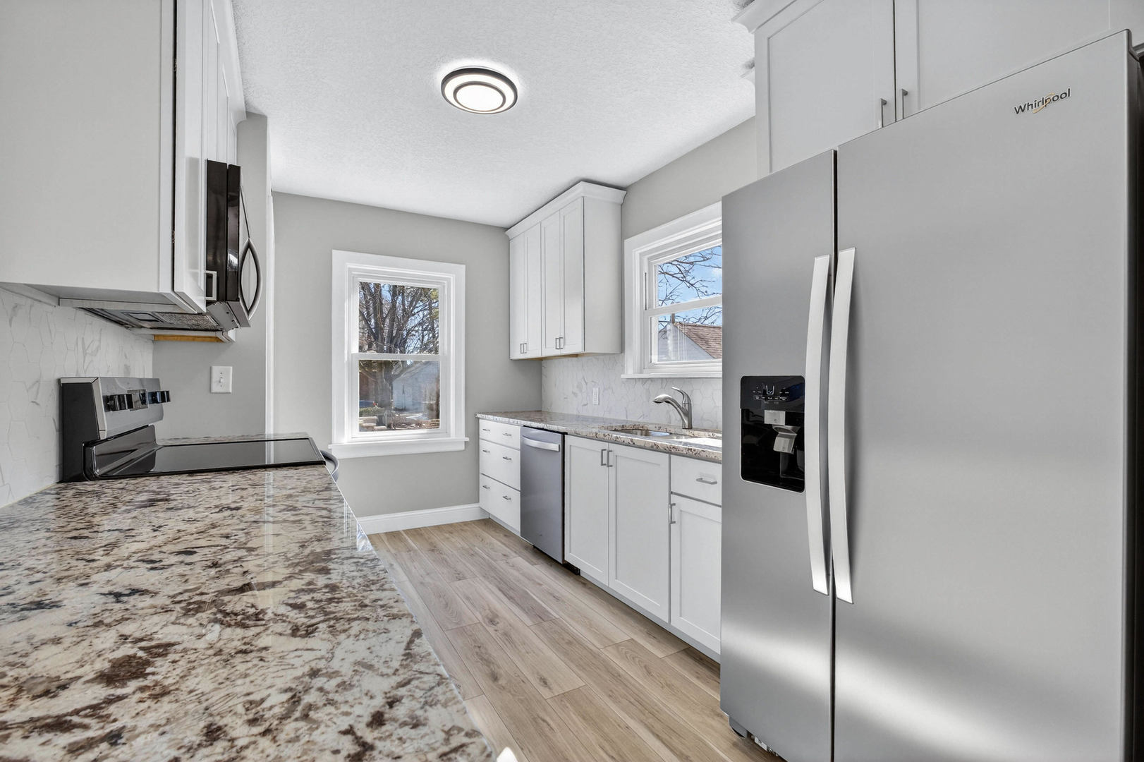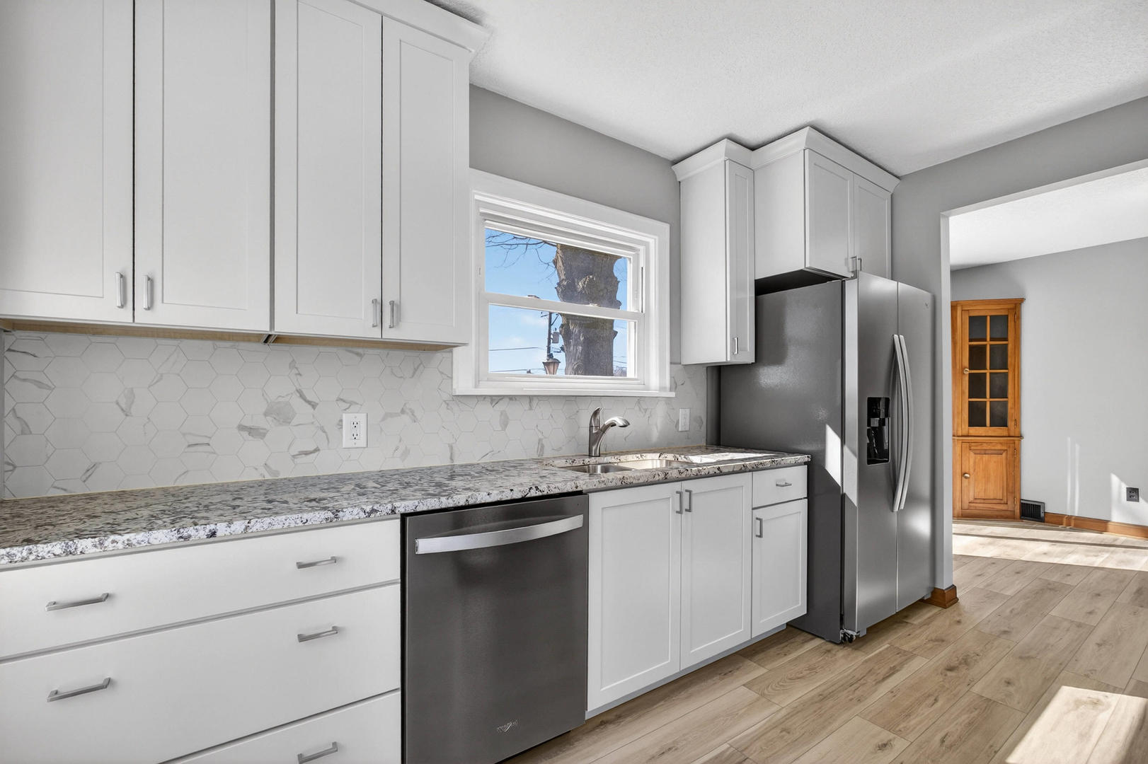 Adorable 1.5-story home remodeled by HammerTime Construction and move-in ready! Spacious living room with gas-log fireplace, new carpet, and original woodwork. Charming dining room features corner curio cabinets. An all brand new kitchen with stainless steel appliances, granite countertops and backsplash. Offers 3 bedrooms, 2.5 baths, and a primary suite with full bath and a large flexible space which could be used as a walk in closet, an office or even a nursery. This sweet home offers an abundance of natural light and built-ins throughout. The basement is a blank slate with a new half bath, updated lighting, and fresh paint. 2-car garage and prime location near North Scott Schools!