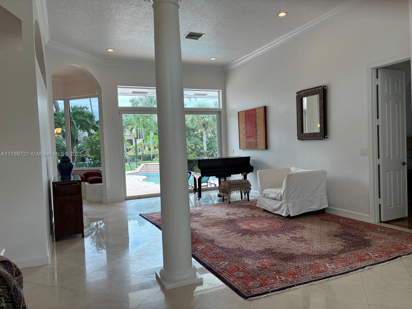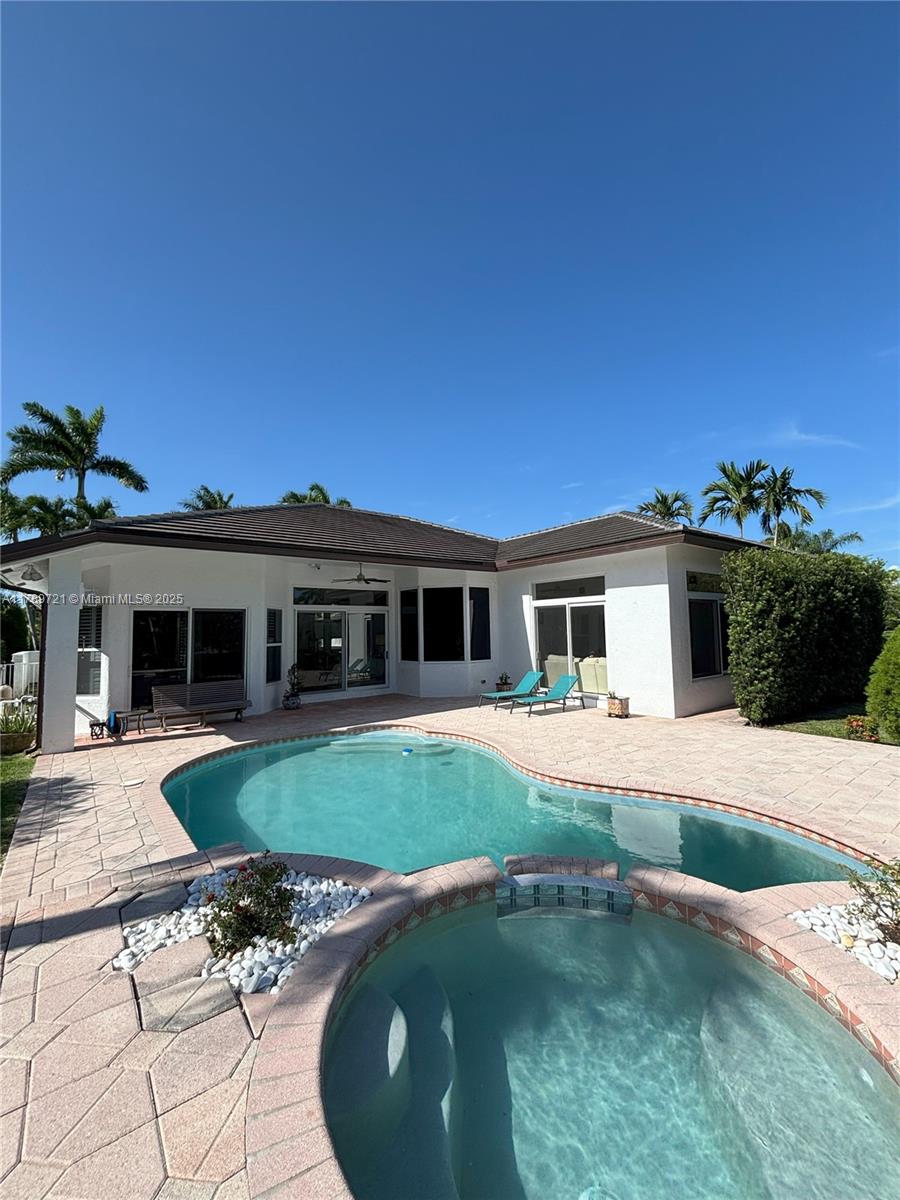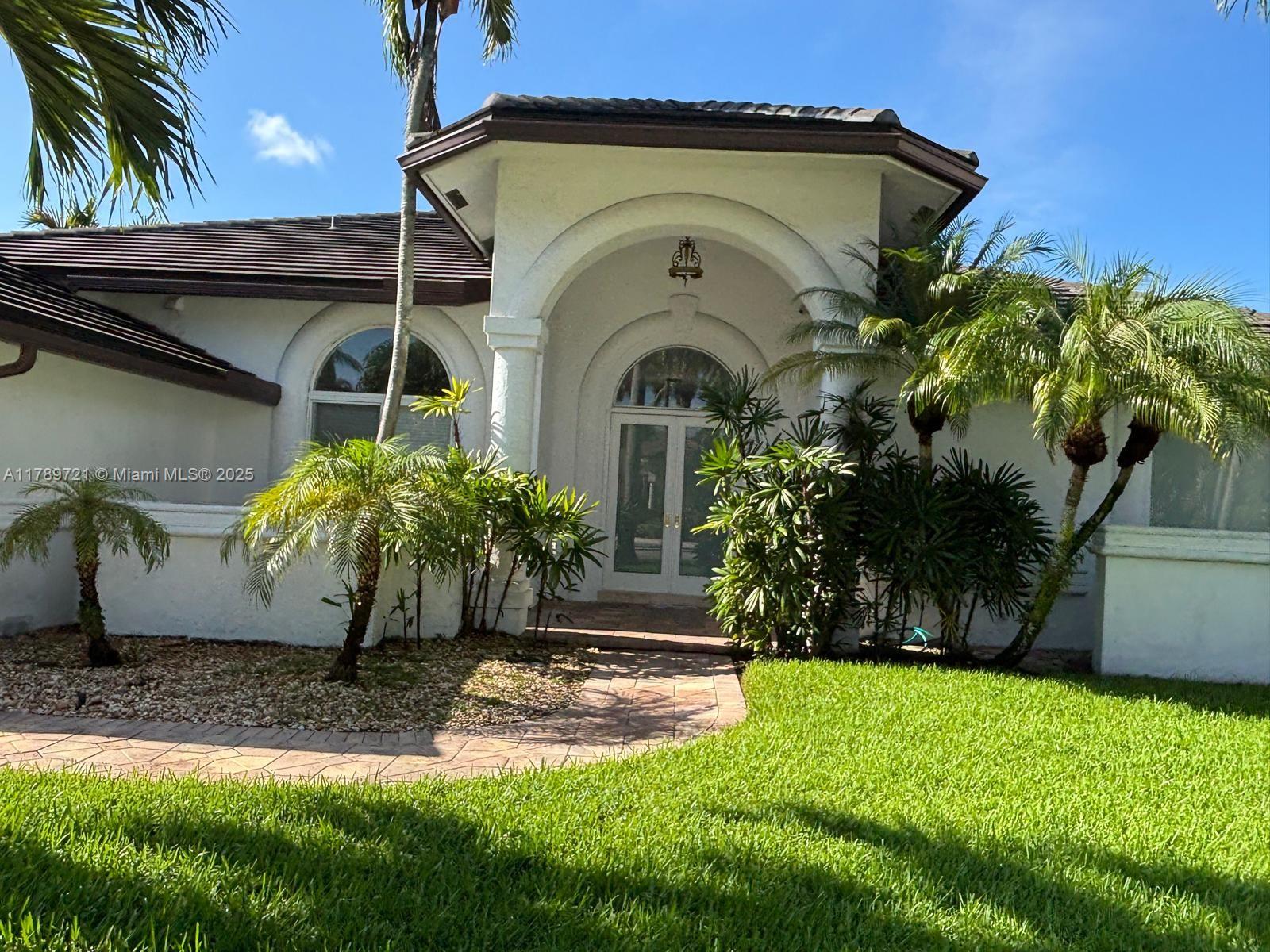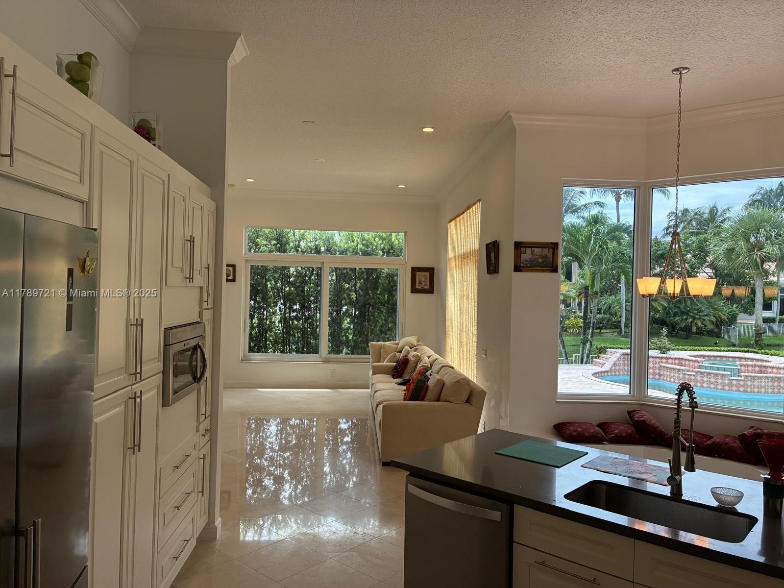 STUNNING LAKEFRONT ESTATE IN MOST DESIRABLE CUL-DE-SAC. This beautifully single-story home sits on 135 feet of pristine waterfront with unobstructed lake views. Recent upgrades include a 2021 roof installation and impact glass windows for protection and insurance savings. The open floor plan showcases marble and hardwood floors, 4 spacious bedrooms and 3 full bathrooms. The gourmet kitchen features white cabinetry, quartz countertops, and high-end appliances. The master suite overlooks the water with direct pool access. Outside, the saltwater pool and professionally landscaped grounds offer privacy and spectacular views. Enjoy exclusive access to the clubhouse with fitness facilities, 7 Har-Tru tennis courts, spa services and 24-hour security. Move in ready with luxury finishes.