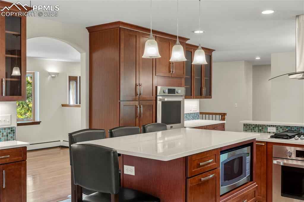 Fully remodeled kitchen in this well-maintained rancher in desirable Crystal Hills! Short walk to a "locals only" trailhead, accessing Red Rock Canyon Open Space. Kitchen upgrades include quartz countertops, gas stove, two ovens and an elevated island, perfect for entertaining. Four very large bedrooms and two family rooms. The owner's suite has a walk-in closet, adjoining bathroom with a double vanity and plenty of large windows. Beautiful wood floors throughout most of the main level. Perfectly functioning wood-burning fireplace and sliding glass doors in the main level family room. Amenities include: brand new roof, new driveway, hot water heat, 300 square foot, secluded deck, whole-house evaporative cooler, radon system, 200 amp service and a large, secluded, level rear yard. Manitou Springs School District 14 school bus stops close by!