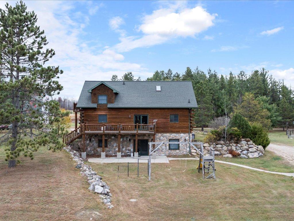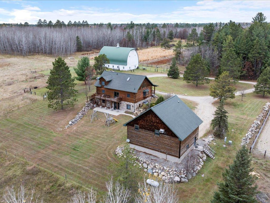 This well-built log home sits on over 10 beautiful acres bordered by 100 acres of state land, ideal for trail riding and hunting. A covered porch welcomes you into an open floor plan featuring vaulted ceilings and a kitchen with custom maple cabinets, stainless steel appliances, granite countertops, and a maple butcher block island. The cozy living room offers a gas fireplace, office nook, and ample storage. The main-level primary bedroom includes a walk-through bath with a jetted tub and tile shower, while log stairs lead to a loft bedroom with a private deck overlooking the pasture and barn. The lower level contains a safe room/library, a bedroom, full bath, living area with epoxy floors, and laundry. The detached garage is split into a heated two-stall section and a single-stall area leading to a two-bedroom plus loft apartment, currently adding $1600 per month in rent. The property also features a working hay elevator in the barn, 10 oak stalls, a tack room, and more leasable pasture acres available from neighbors. Amazing ATV and snowmobile trails are nearby, with Crystal Lake public access less than 1 mile away and 120 lakes within a 10-mile radius.