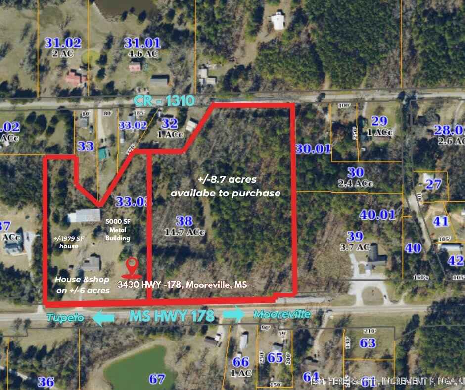 You must see this cute 3/2 house on +/-6 acres. This house has a large den and large laundry room. You will enjoy the oversized bedrooms. In addition to the house, this property comes with a 5000 SF shop. It is conveniently located to I22, Tupelo and Mooreville.The property is not zoned. *All information is subject to verification by the Buyer.