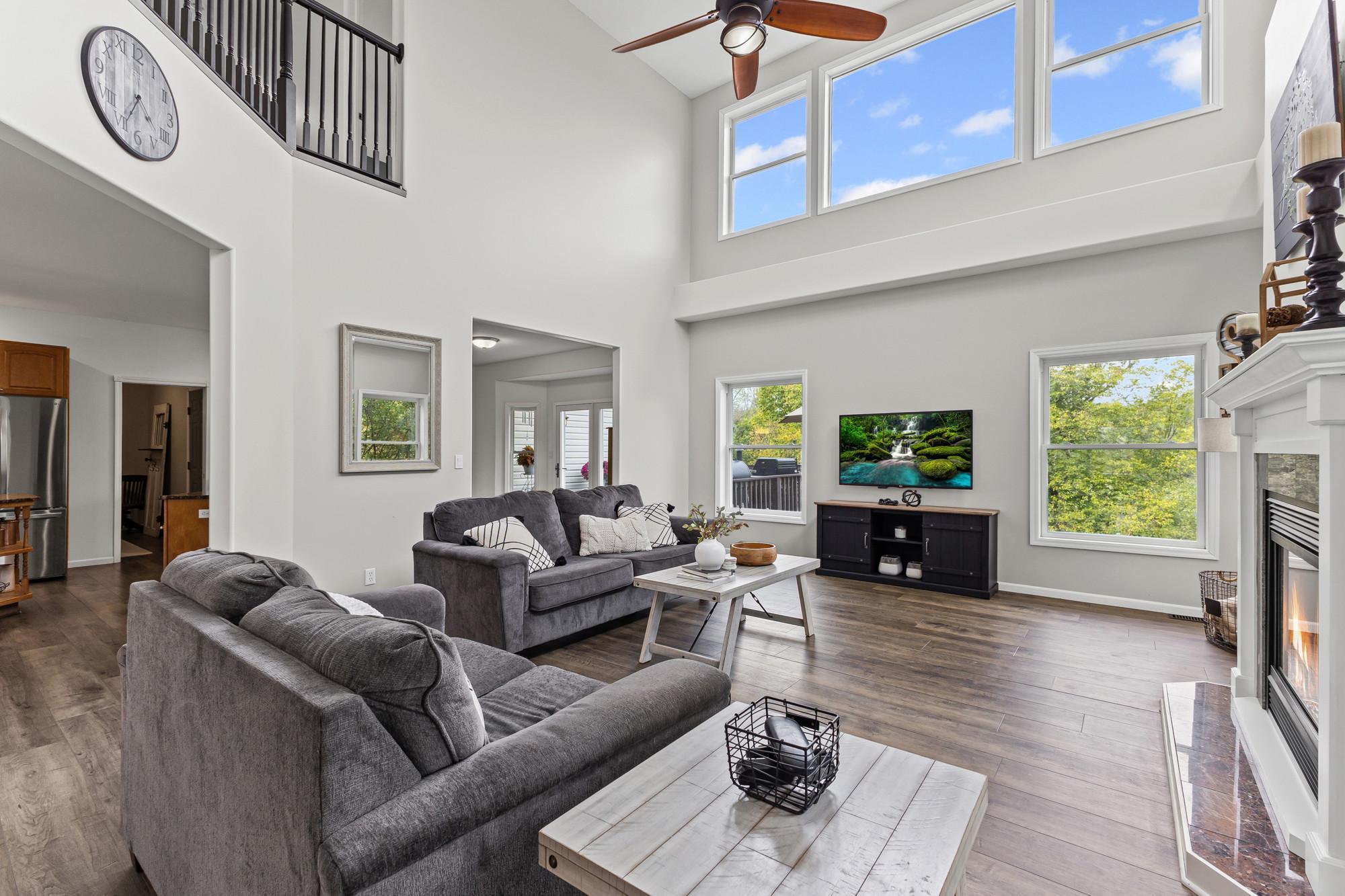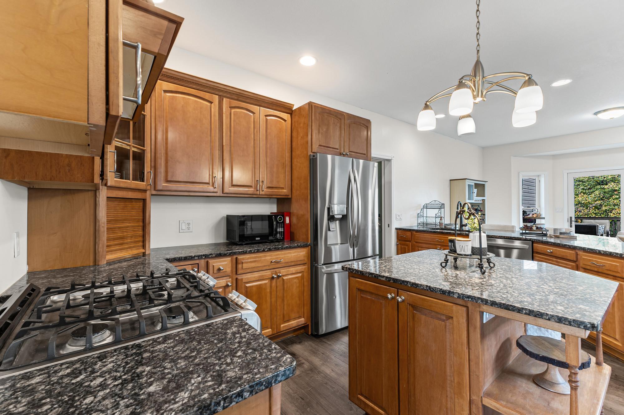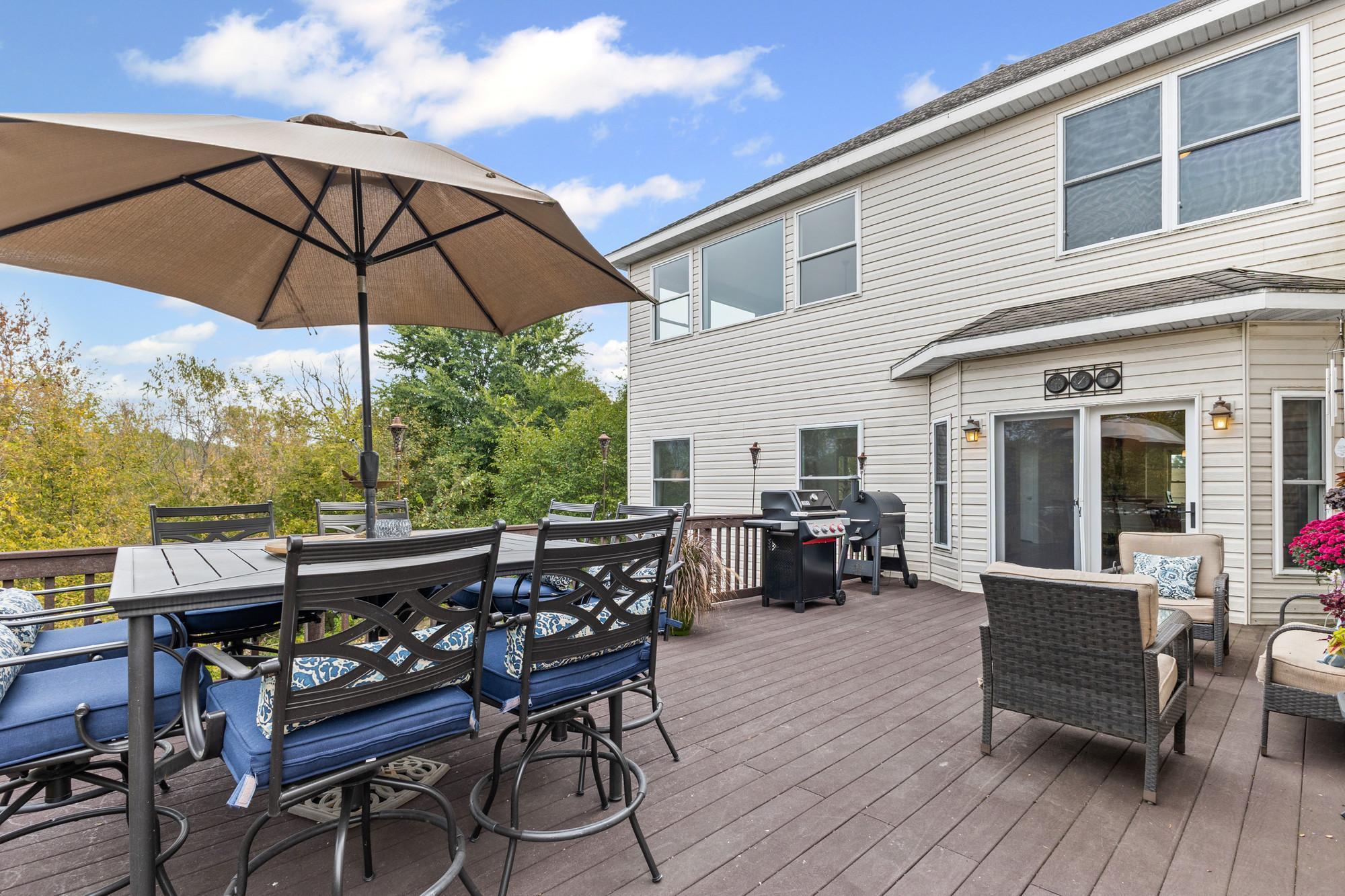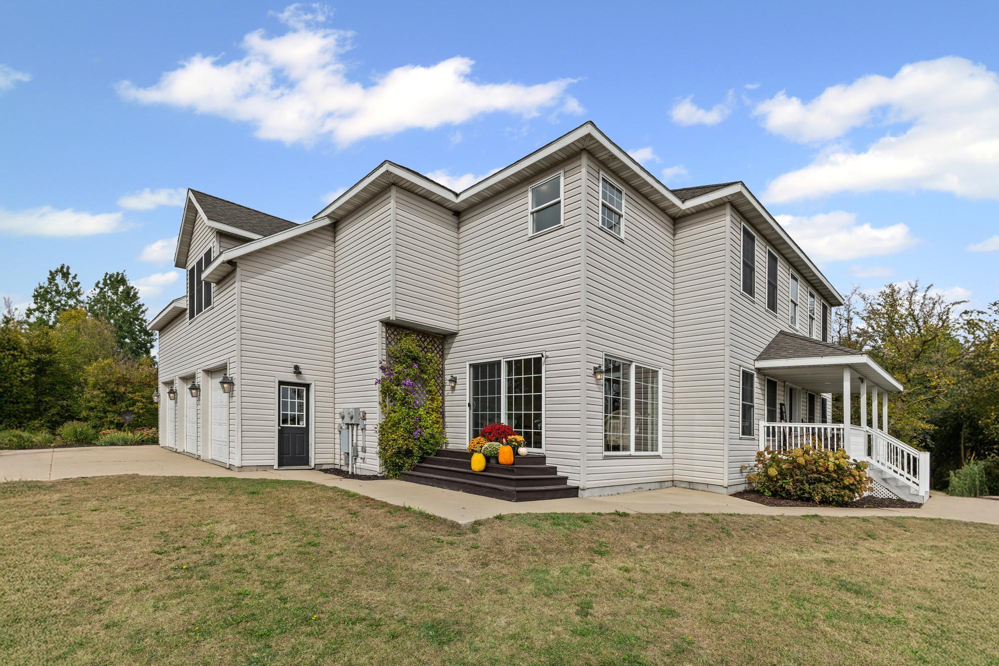 Spacious 4-bed, 4-bath home on a private lot with tons of updates and features! The main level boasts high ceilings, granite kitchen countertops, newer stainless steel appliances (2021), hardwood-style LVP flooring, and a bright sunroom. The massive primary suite offers 500+ sq. ft., his-and-hers closets, and a newly remodeled bath with walk-in shower. The fully finished walkout basement includes a kitchenette, patio access, in-floor heating, and a lower level easily converted to rental space or an in-law suite. Recent updates: new furnace (2025), fresh paint, and new flooring throughout.Outdoor living shines with multiple decks, porches, a sun room and a 30-ft above-ground pool with its own deck. The 3-stall insulated garage adds convenience and storage. With dual heat sources (electric + propane) and beautiful indoor/outdoor spaces, this home blends comfort, function, and recreationperfect for everyday living and entertaining!