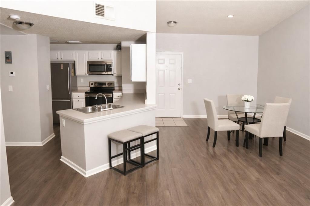 Welcome home to this 2nd story 1 bedroom 1 bathroom unit in the gated community of Emerald Forest. Cathedral ceilings give this home an open and airy feeling. Enjoy the welcoming covered porch at front entrance and relaxing covered balcony that has a storage closet just off of living room. Kitchen has stainless steel appliances and a counter height seating area for two. Bedroom features walk in closet and direct access to bathroom.Vinyl wood plank flooring throughout the whole unit.Community features resort style swimming pool, club house, library, gym. Seller offering to prepay 6 months of condo dues at Act of Sale with acceptable offer.