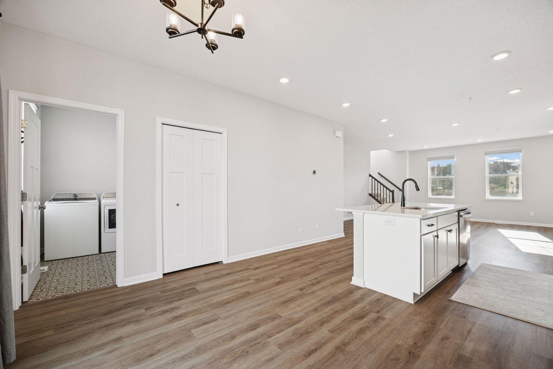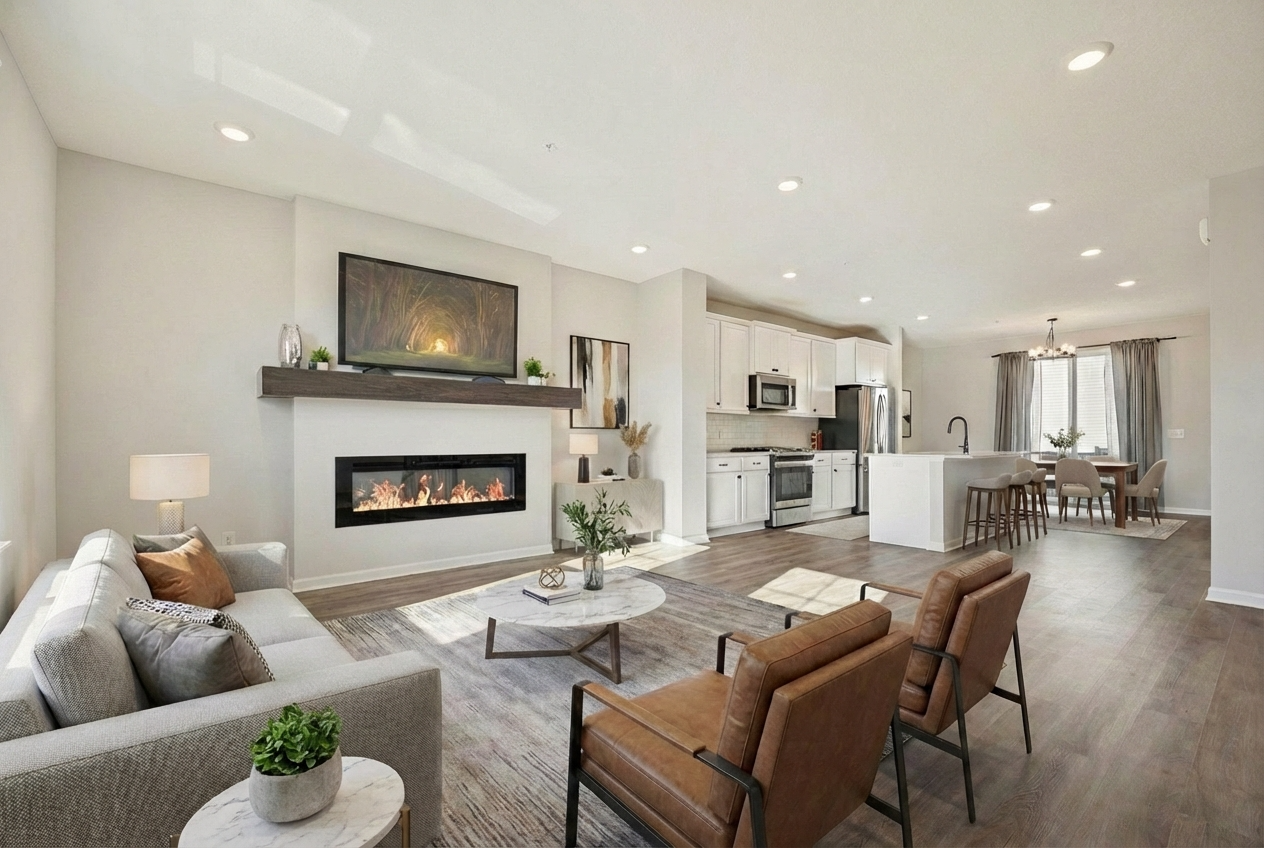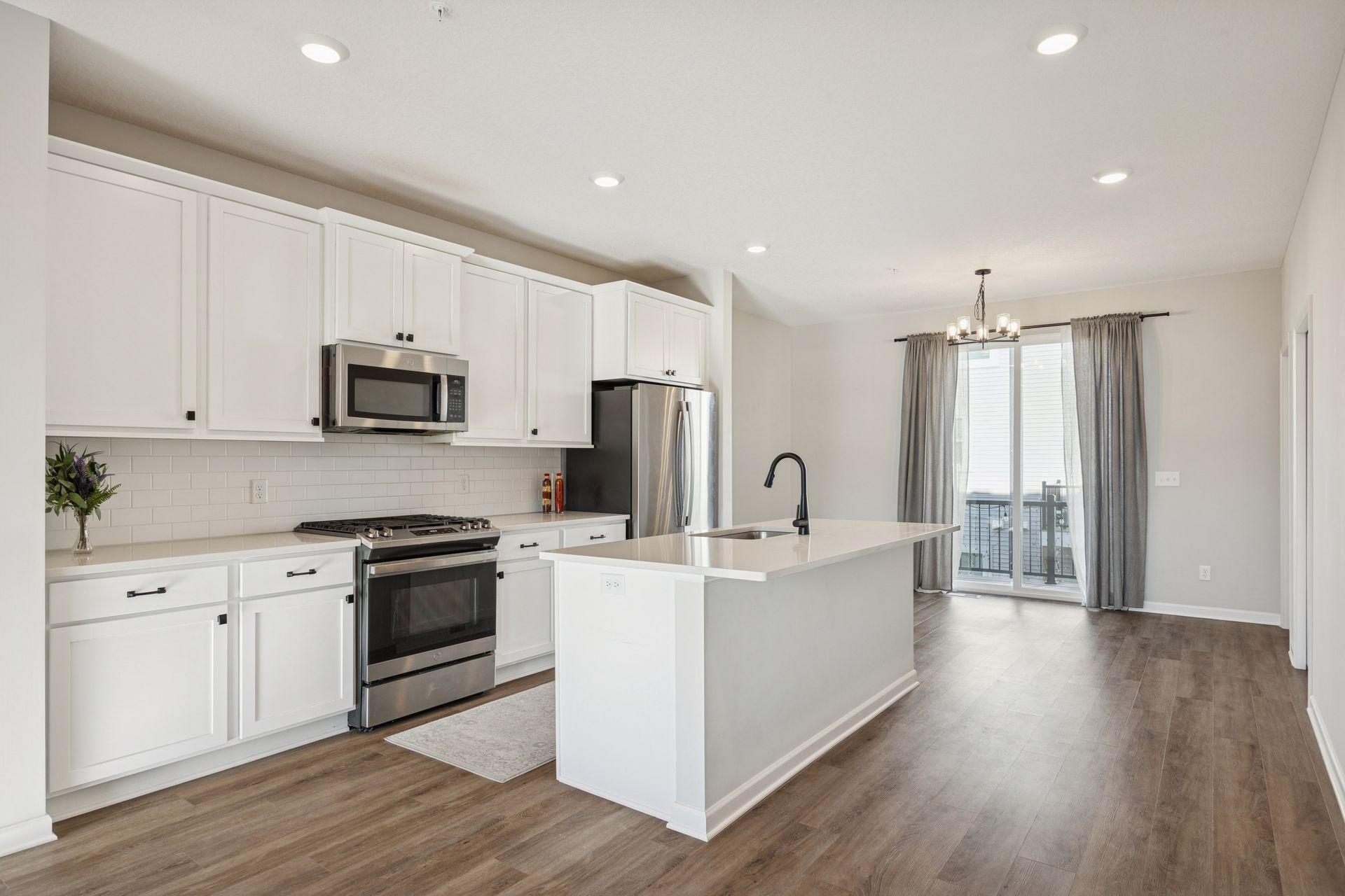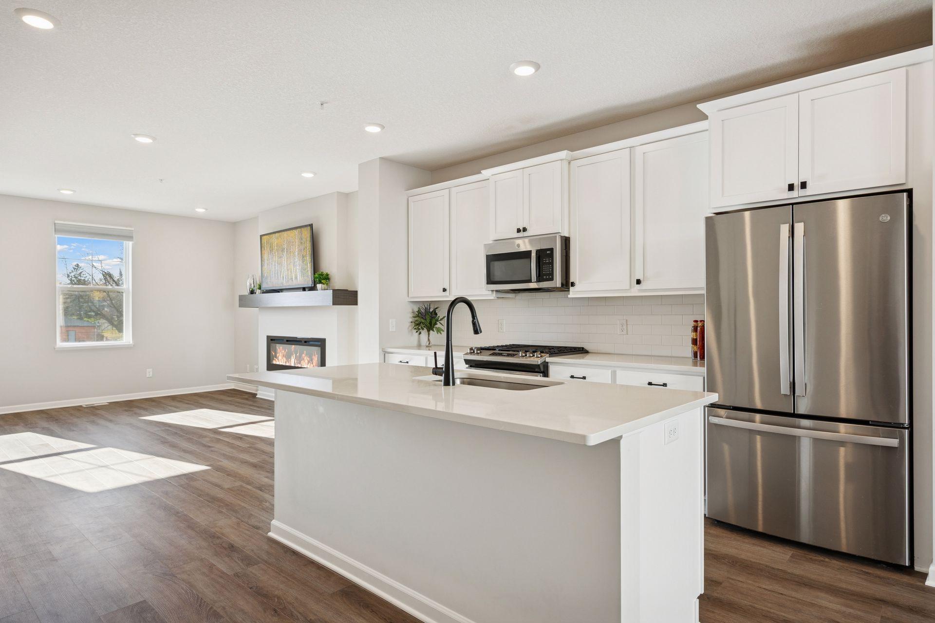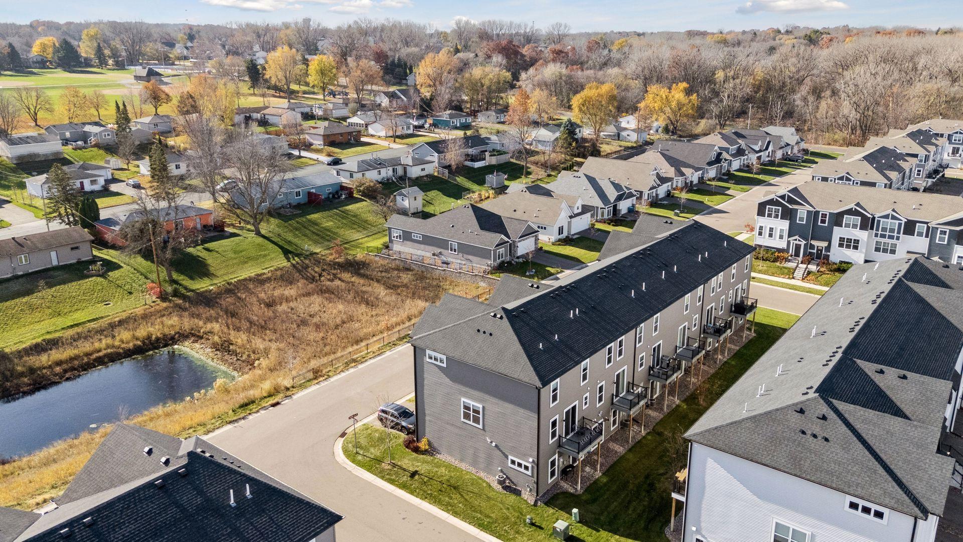 Welcome to this beautiful modern townhome offering 3 bedrooms, 3 bathrooms and an open floor plan with stylish finishes and plenty of natural light throughout. The main level features a bright living room with a modern fireplace, a dining area with access to the deck, and a beautiful kitchen with white cabinets, solid surface countertops, subway tile backsplash, stainless steel appliances and a large island with seating. The laundry room is also conveniently located on the main level. The upper level includes three comfortable bedrooms, a full bath, and a private primary suite with a double sink and a walk-in shower. The lower level adds flexible living space with walk-out access to the backyard - perfect for an office, gym or guest area. A spacious 2-car garage provides extra convenience and storage. Enjoy low-maintenance living in a newer community close to South Valley Park, riverfront trails along the Mississippi River and easy access to major routes including Highway 55.