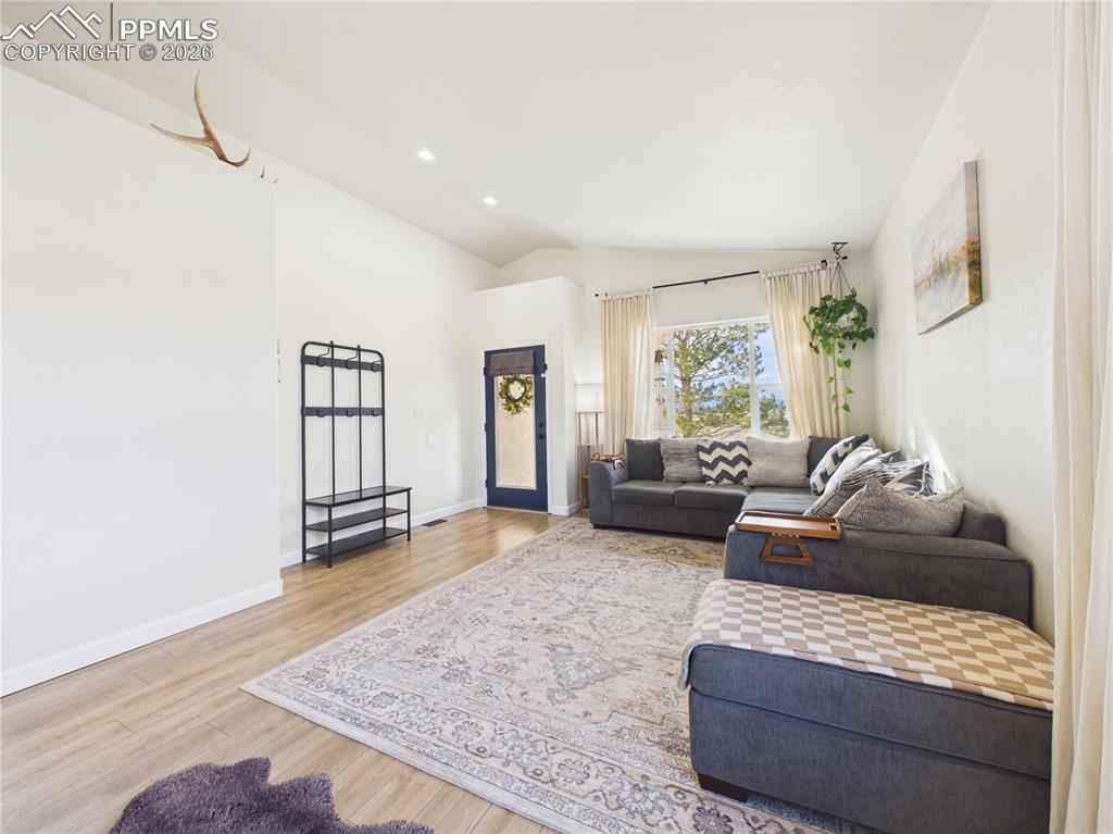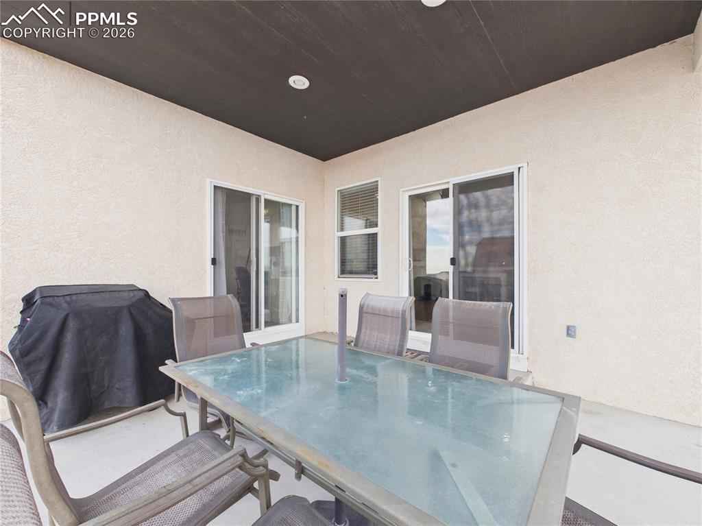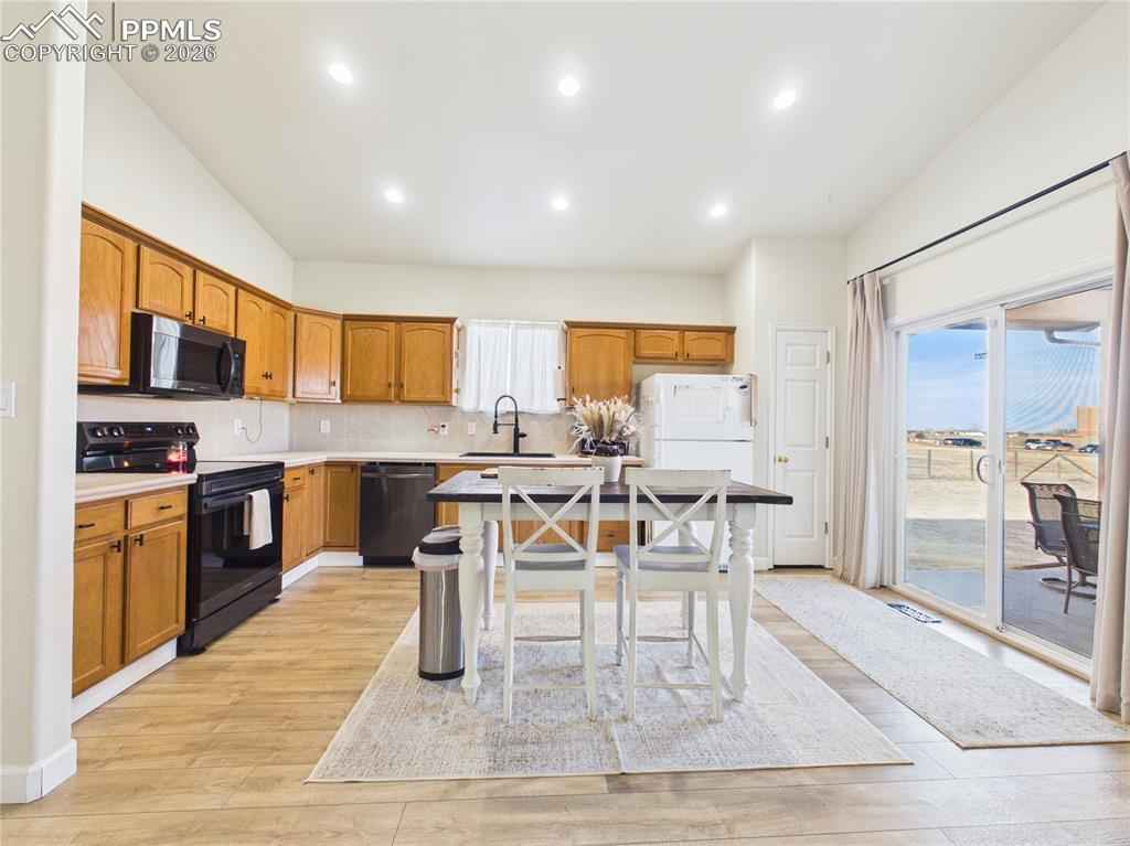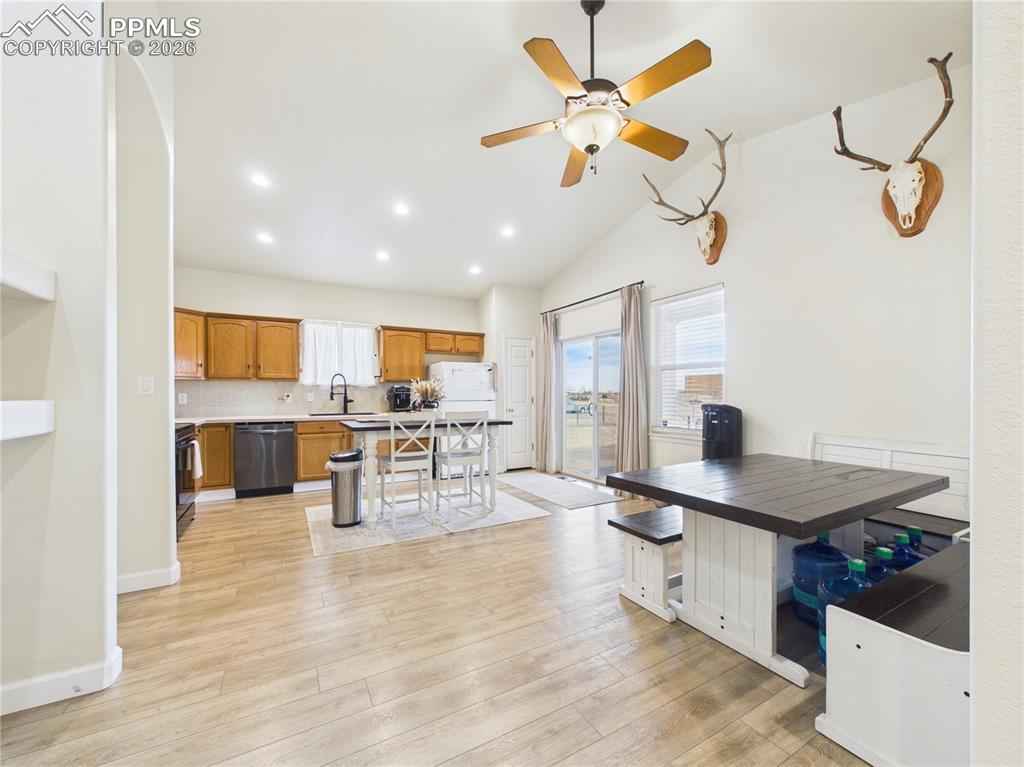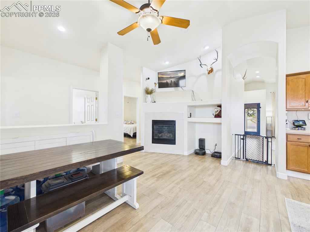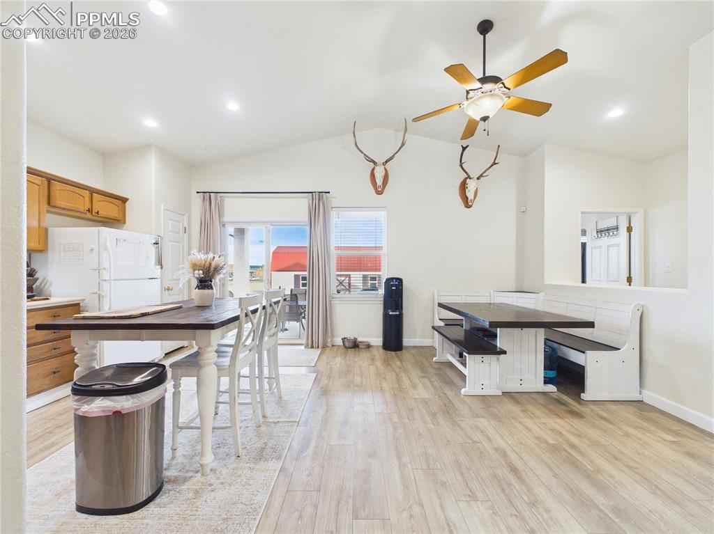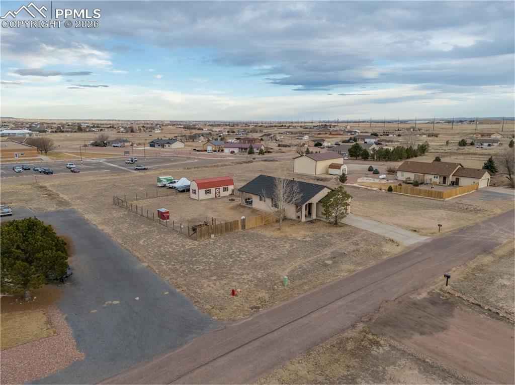 This charming 3-bedroom, 2-bathroom home in Pueblo West features a 2-car garage and is situated just one block from Prairie Winds Elementary. Inside, enjoy tall vaulted ceilings, recessed lighting, and durable LVP flooring throughout, complemented by a whole-home humidifier for comfort. The bright living room boasts large windows, flowing seamlessly into the kitchen and dining area which is anchored by a cozy gas fireplace. The area includes stainless steel appliances and a charming dining nook. The primary bedroom offers convenient outside patio access, a full ensuite bathroom with a private water closet. Outdoor living is a delight with a covered back porch perfect for evening meals. The backyard is entirely fenced and features raised garden beds and a massive 12x32 storage shed. Out front, the covered front porch is ideal for enjoying Colorado sunsets. Schedule a showing today!