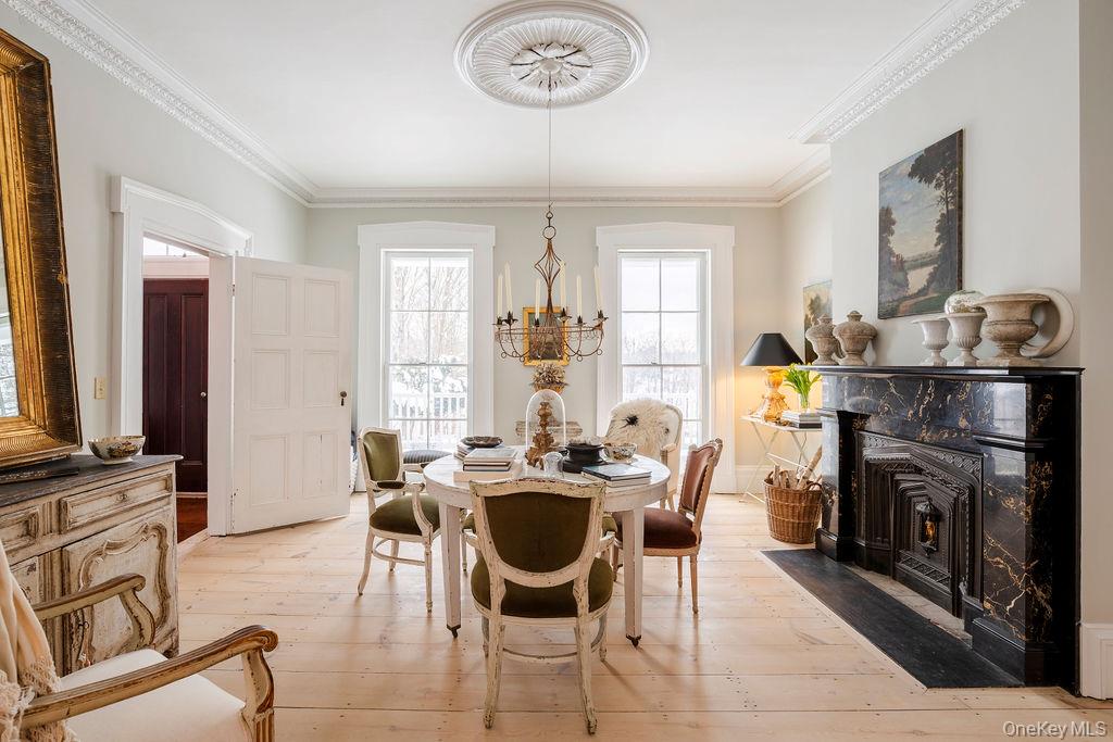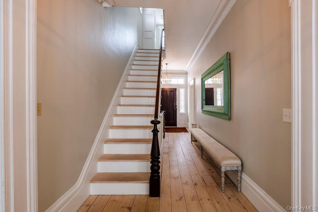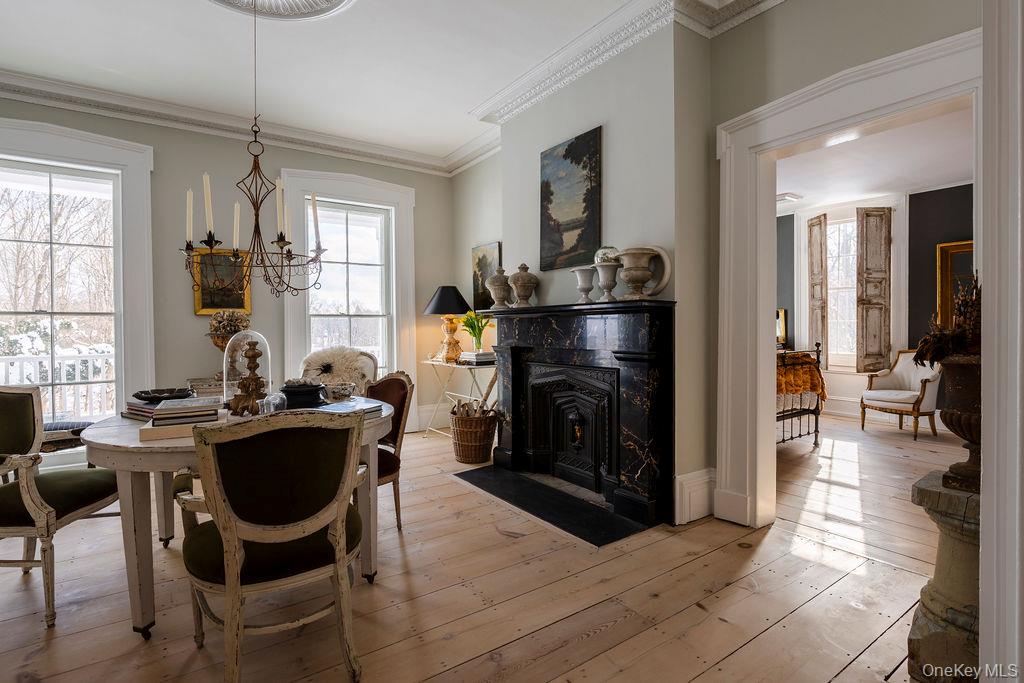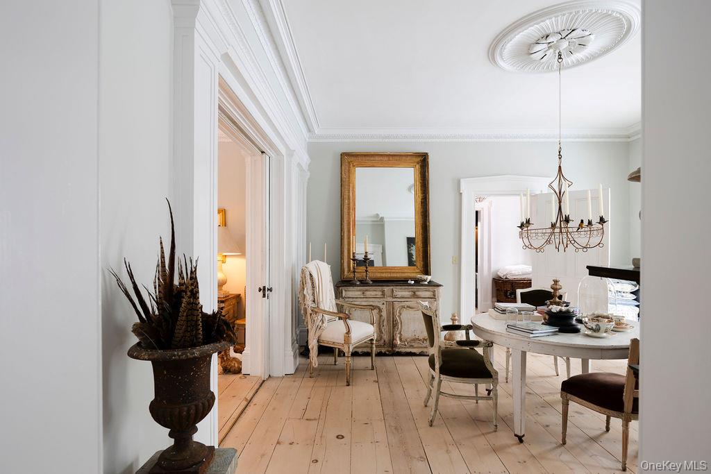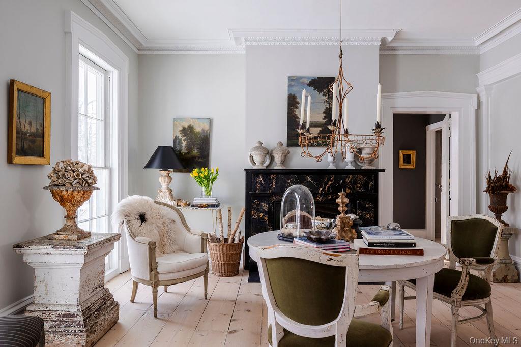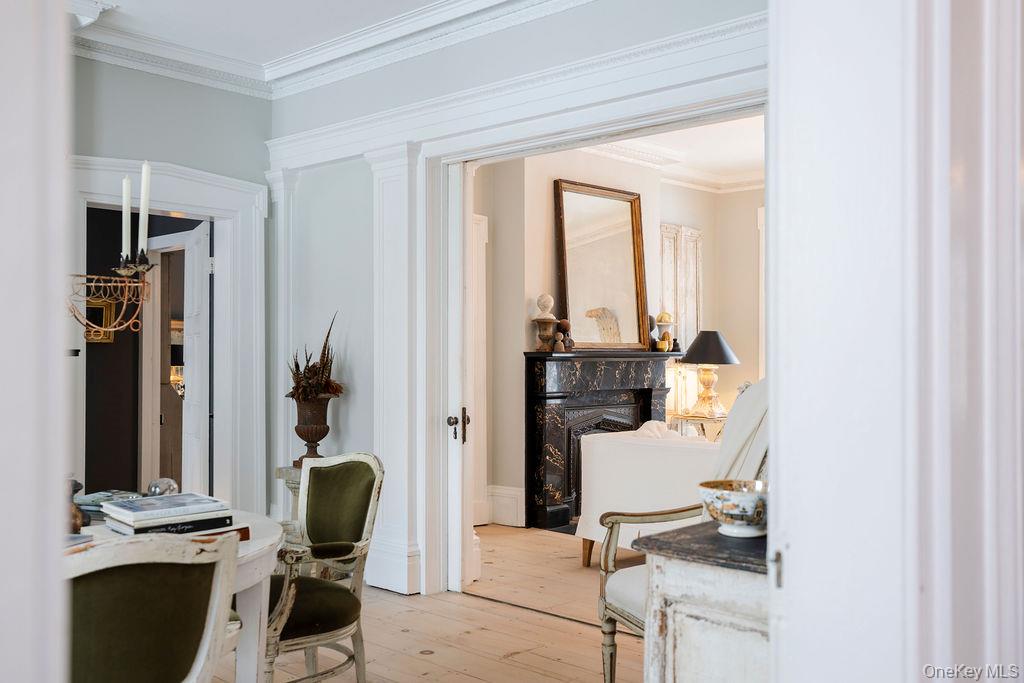 Maple Lawn, a landmark Greek Revival home in the heart of Stone Ridge, offers a rare combination of architectural pedigree and village-scale livability. Built in 1843 as both home and workplace for Dr. Jacob Louis Hasbrouck, the house remains one of the clearest expressions of classical Greek Revival design in the Hudson Valley, distinguished by its six Ionic columns and balanced proportions. Set on almost an acre within the charming hamlet, the property overlooks conservation-protected land, providing open views despite its central location. Inside, Maple Lawn features five bedrooms and four fully renovated bathrooms arranged across three levels, each floor incorporating sleeping quarters and baths. Three working fireplaces anchor the interiors, adding warmth and historical continuity to spaces that have otherwise been modernized. On the walk-out ground-floor level are a bluestone-floored gourmet kitchen and two gracious keeping rooms, each with its own working fireplace, plus a bedroom and bath. The main ''piano nobile'' living level features 11-foot ceilings, wide-board hardwood floors and pocket doors, with symmetrical front and back parlors adjoining a bedroom and an oversized bathroom. Upstairs are 2 additional large bedrooms and another fully renovated bathroom. Verandas span both the front and rear façades, extending the living space outdoors and reinforcing the home's formal symmetry. The multi-year restoration yielded a long list of impeccable improvements, including upgraded electrical service, zoned HVAC systems, a standing-seam metal roof, historically accurate clapboard replacement and sound-proofing storm windows. To the rear of the property, a raftered barn and carriage house provide flexible additional space--suitable for storage, studio use, or future pool house --while maintaining the estate-like feel that distinguishes Maple Lawn from other walk-able village homes.