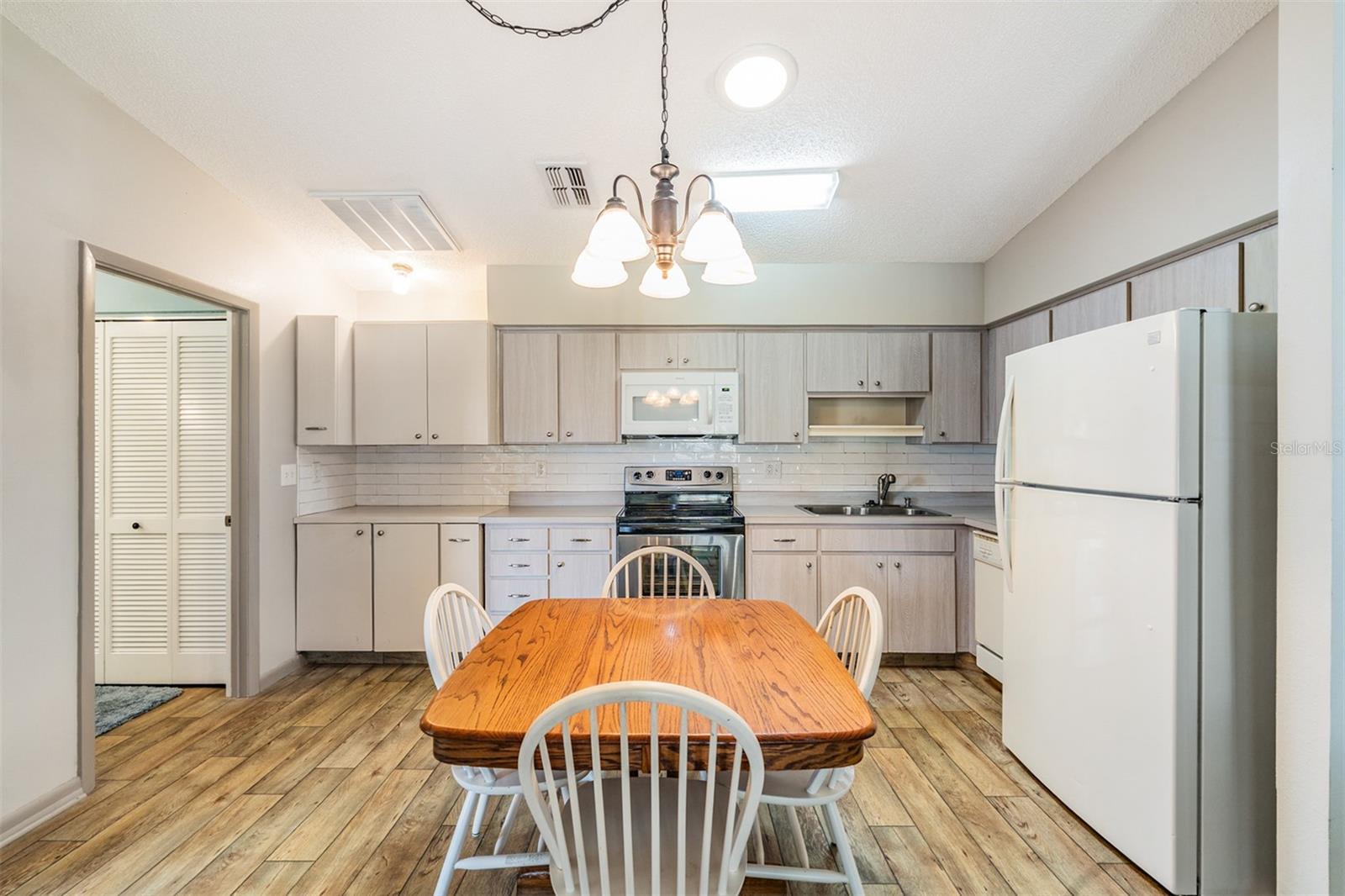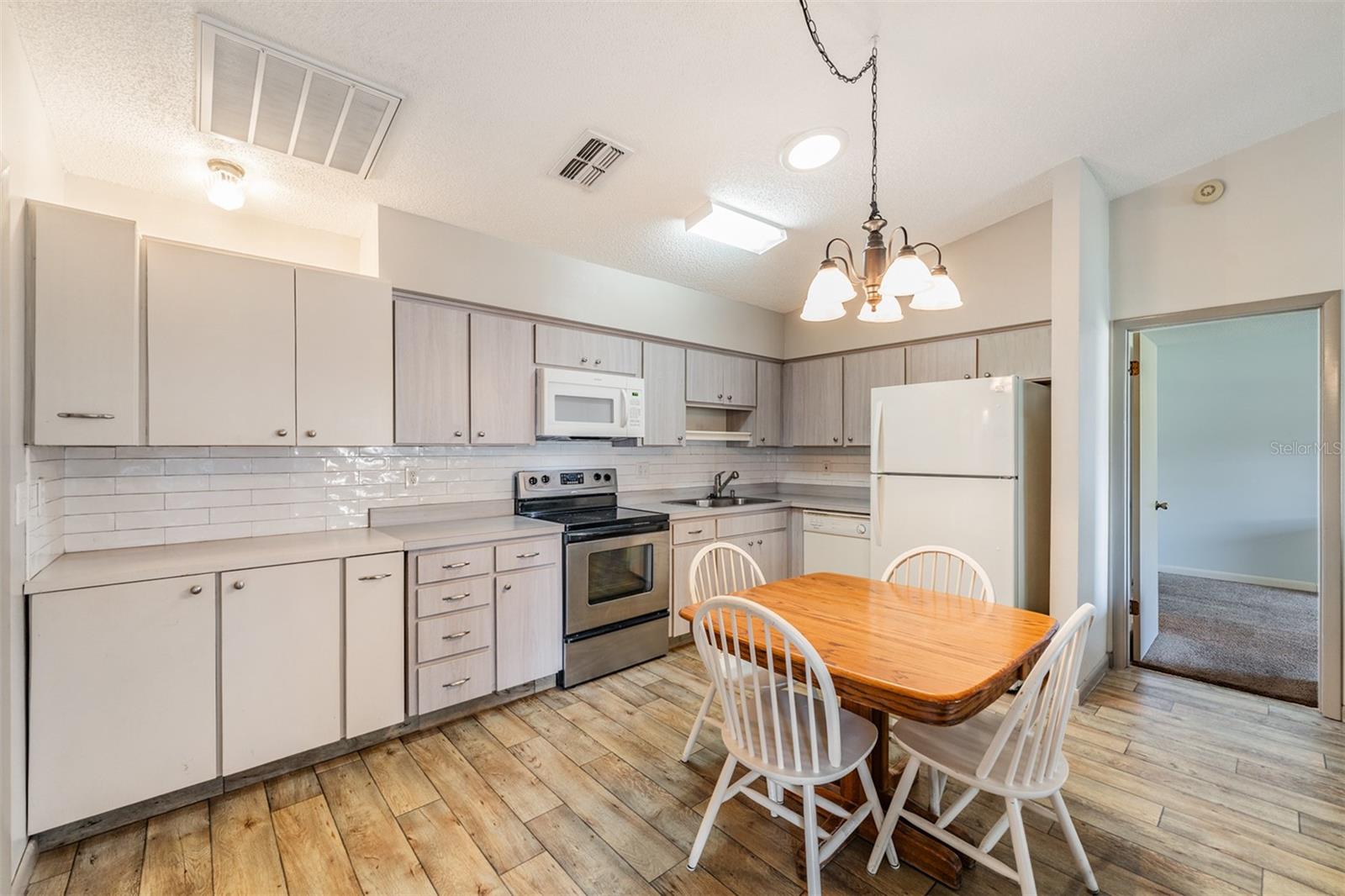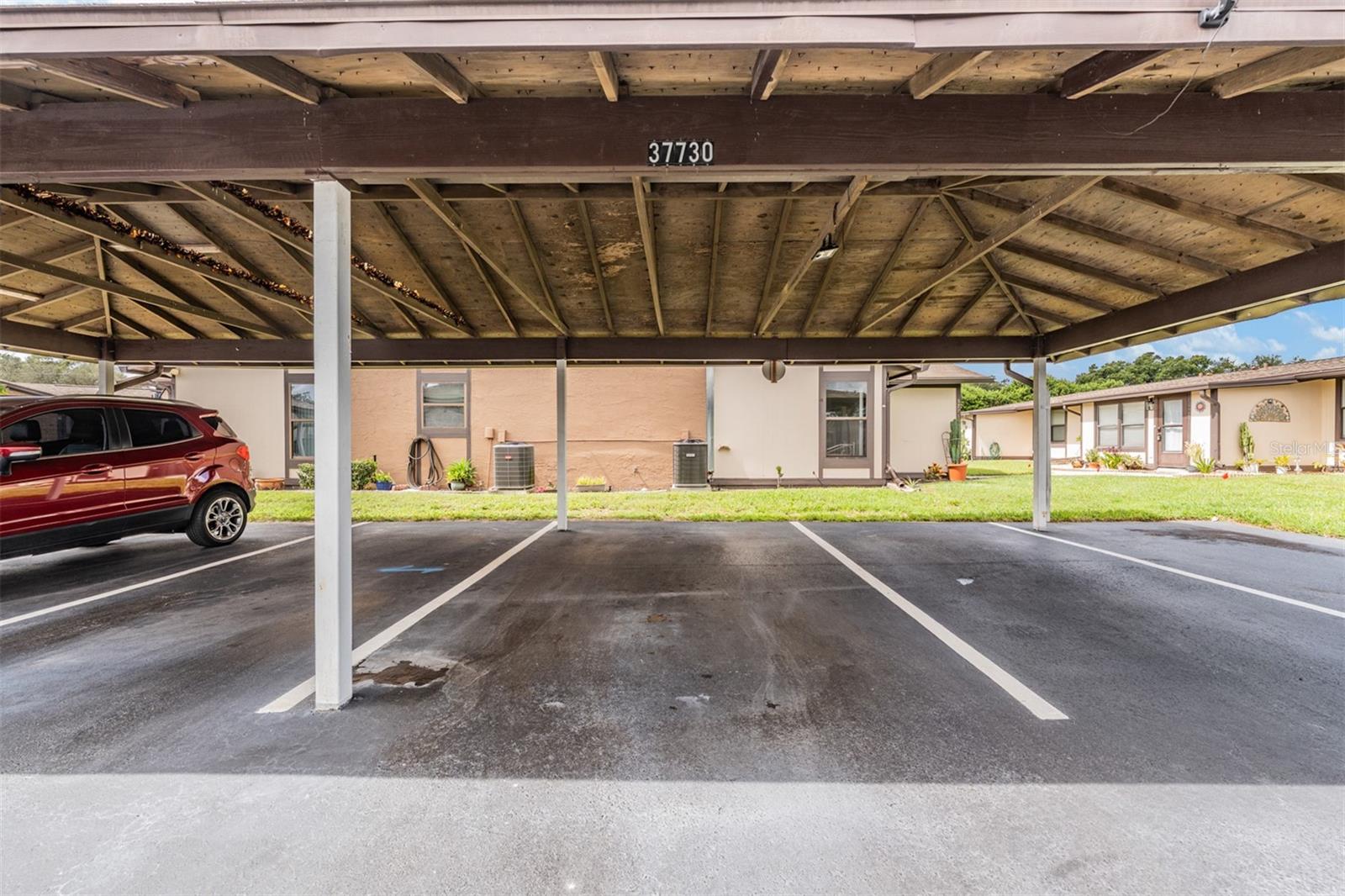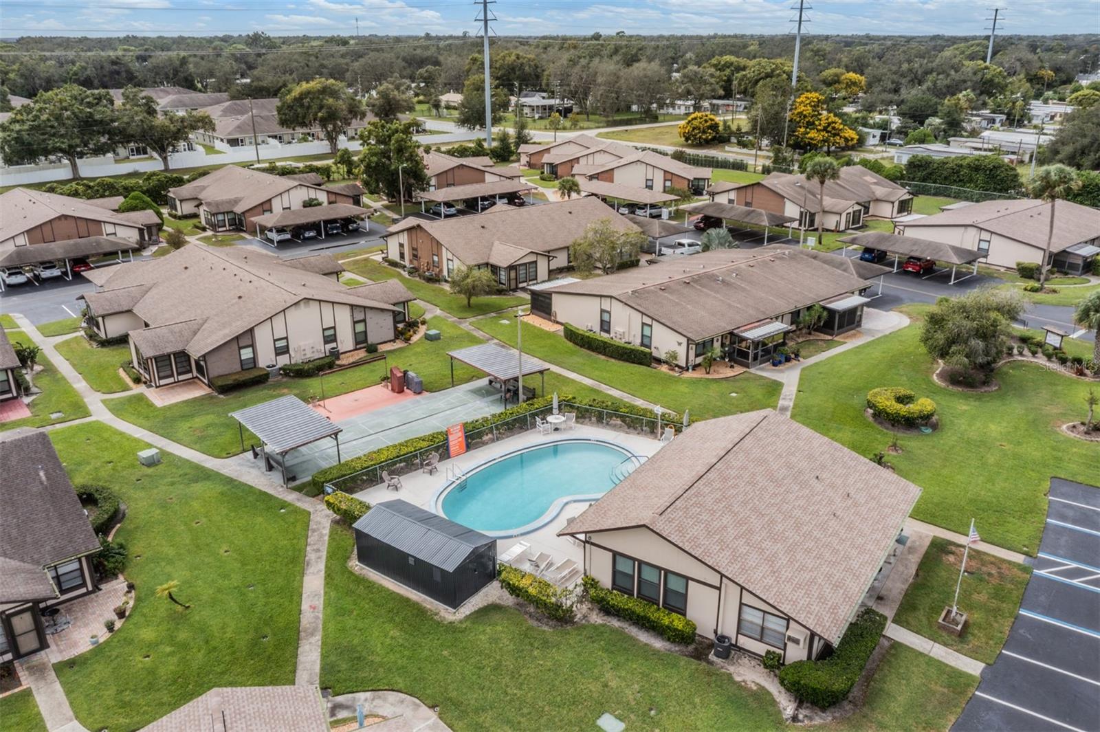 This home is in the Orange Blossom Ranch, 55+ Gated Community. New Roof Feb 2026! AC 2025! This property features a well-designed layout with tile, laminate and carpet in the bedrooms, 2 Bedrooms/2 Bathrooms ONE level Condo, with the kitchen and family room in the middle, while the sunroom boasts laminate flooring and abundant sunlight with a ceiling fan for comfort. There is also a storage closet located in the sunroom. The open kitchen includes amenities such as a subway tile backsplash, microwave, dishwasher, range, and refrigerator, all included with the property. Additionally, there is a washer and dryer in the laundry closet located by the master bathroom. The home offers high ceilings that enhance the spacious feel. Both bathrooms have been updated with elegant vanities. Convenient covered parking is available right in front of the unit. The property is situated in a private gated community with a low homeowners association (HOA) fee of $368/month. Included in the HOA fee: exterior upkeep, Roof, lawn maintenance, and community features. Conveniently close to Medical offices, Shopping, and parks. You are very close to Zephyrhills, and about 45 minutes to Downtown Tampa. No CDD fees:)