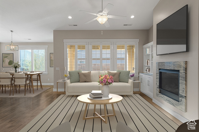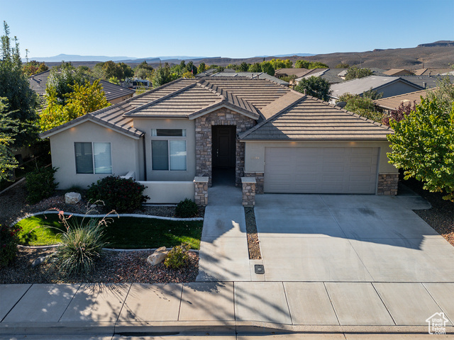 Charming single-level home in Santa Clara. This ideal location is walkable to restaurants, stores, & a park. Inside, this beautiful home features a gas fireplace, built-in entertainment center, plantation shutters, vaulted ceilings, 8-foot tall doors, cased windows, ceiling fans in all the bedrooms & great room, carpet, & new LVP flooring. In the kitchen, enjoy a gas range, stainless steel appliances, white cabinets, granite countertops, & a tile backsplash. The primary suite includes a large walk-in closet, & a separate tub, shower, water closet, & two vanities. Fridge, water softener, a one-year-old washer & dryer are included. Outside, you'll find a front courtyard, two covered back patios, & a fully fenced yard. Close to hiking, biking, Tuacahn Amphitheatre, & Snow Canyon State Park.