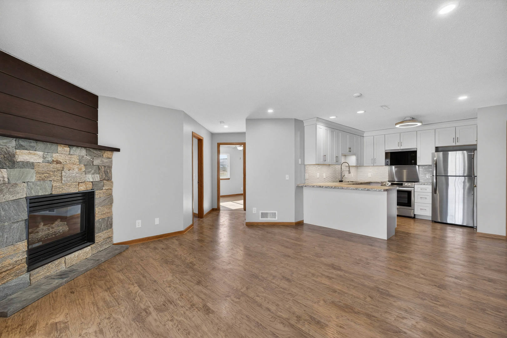 Updated 2-bedroom condo in PVSD conveniently located near restaurants, the YMCA, shopping and more. This third floor unit has new wood laminate flooring throughout; a fully renovated kitchen with new cabinetry and stainless steel appliances, breakfast bar, pantry and stackable washer/dryer; living room featuring a gas fireplace with stone front and sliding door to a private deck; two good sized bedrooms; and a fully renovated bathroom. Additional amenities include a one car garage, guest parking and a community pool. Roof 2020. Water heater 2025. All appliances are new and stay with property.