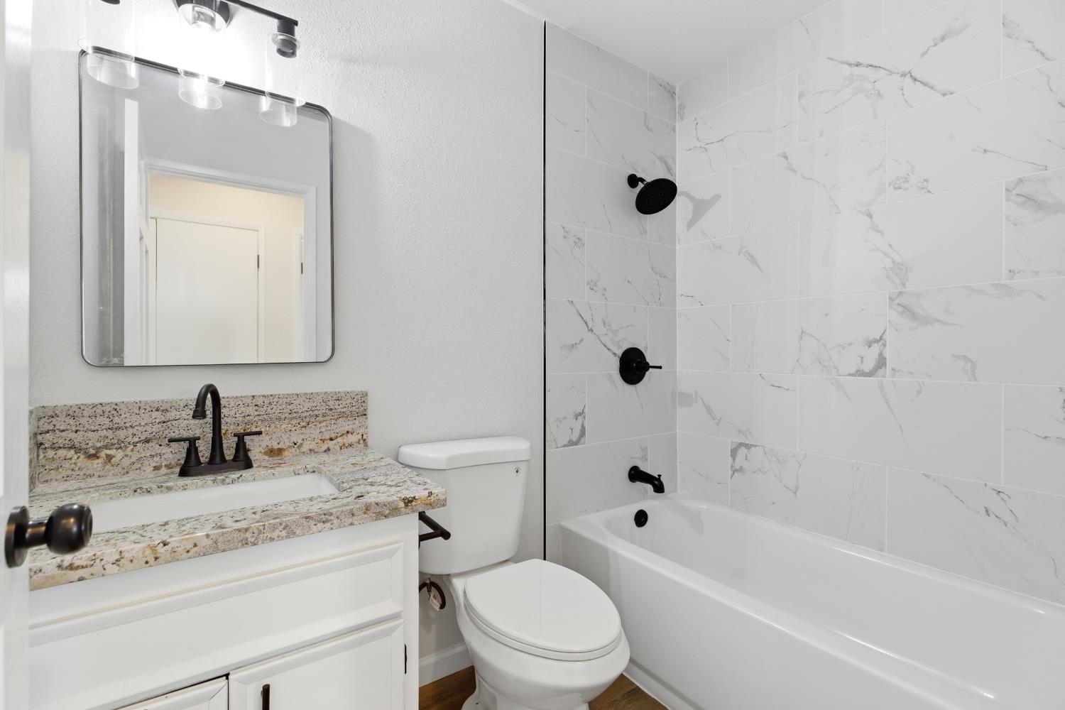 Corner lot home featuring an in-ground pool and spa combo! This well-maintained residence offers three bedrooms and two full bathrooms, plus a spacious enclosed sunroom with views overlooking the pool. Wood flooring flows throughout the home, complemented by ceiling fans in the living room and all bedrooms. The kitchen features granite countertops with a tile backsplash, while both bathrooms include granite vanity countertops. The hall bathroom offers a shower-over-tub, and the primary bathroom features a separate shower stall. The backyard is designed for easy maintenance, allowing you more time to enjoy the outdoor living space and pool.