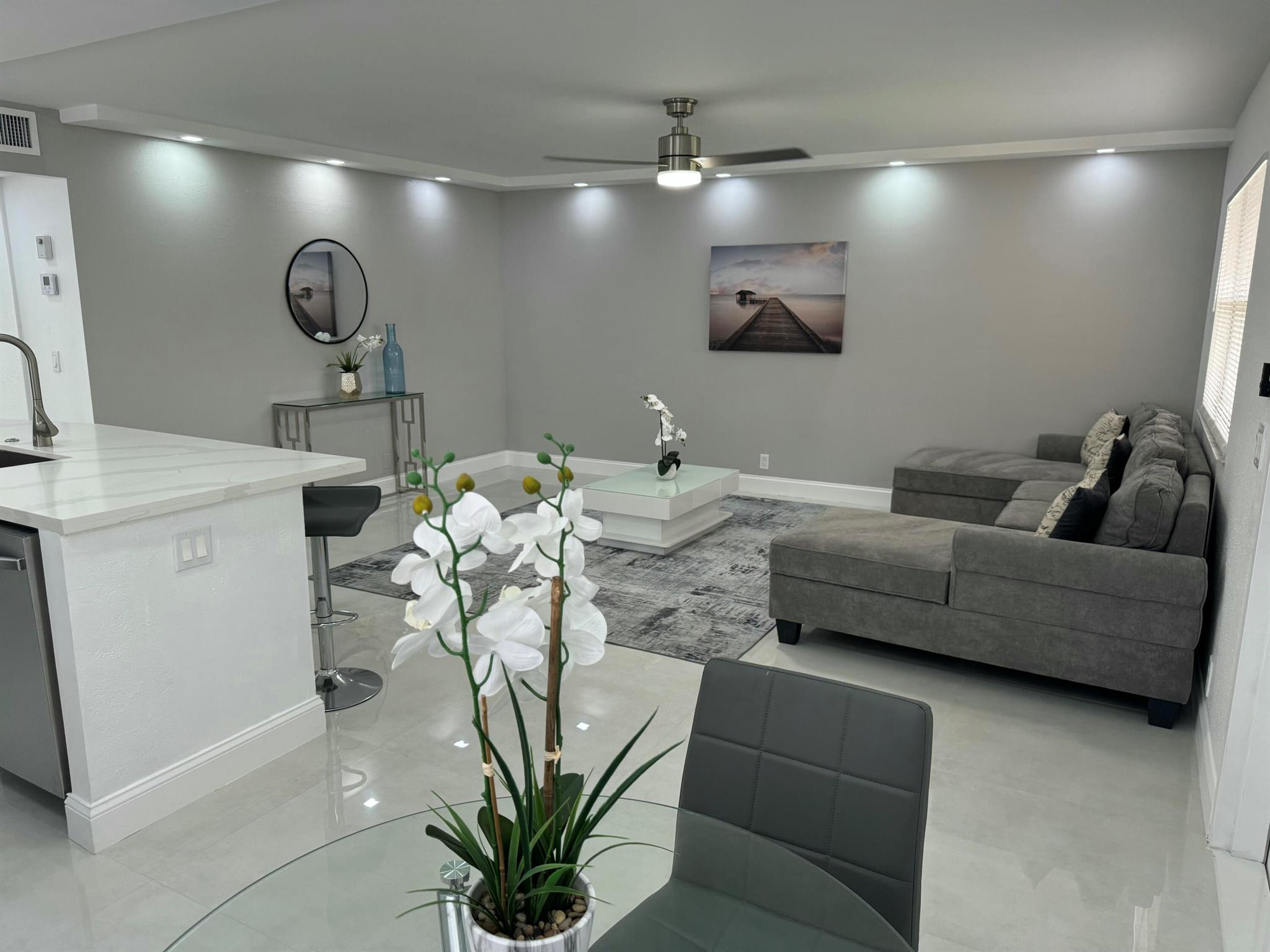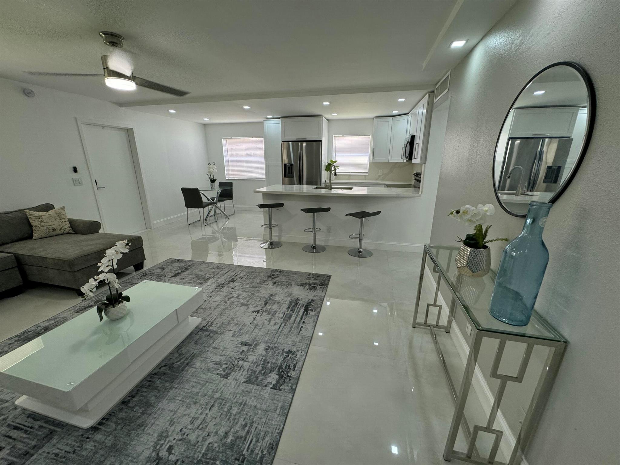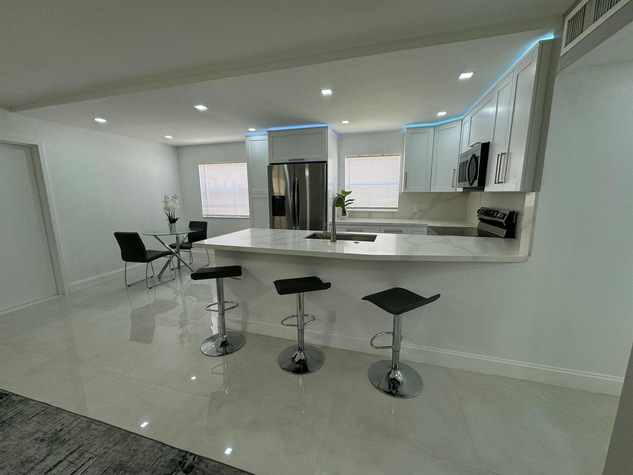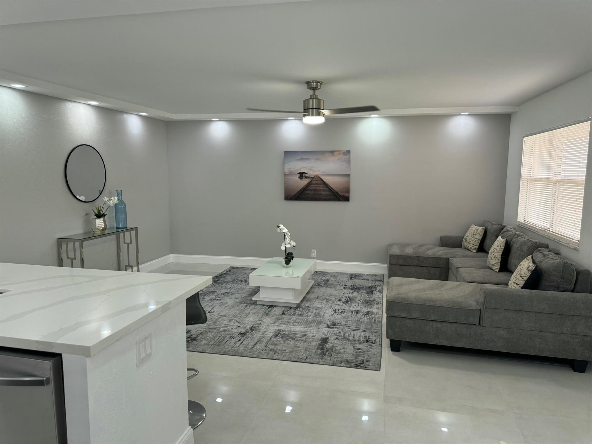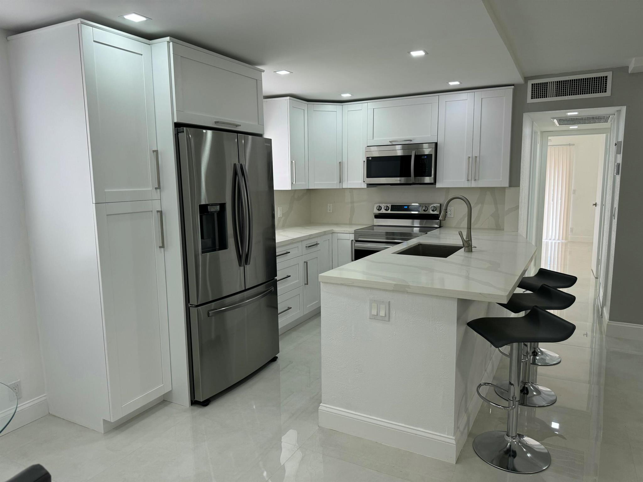STUNNING UNIT! This beautiful 2 bedroom apartment is located in the heart of Kings Point; steps to the clubhouse, restaurant, and tennis and pickle ball courts, and pool!!! The apartment features two spacious bedrooms, each with plenty of natural light and ample closet space. The living room is bright and airy, with a large window. Kitchen boasts BRAND NEW appliances and beautiful white cabinetry, plus quartz countertops and backsplash. Added pantry cabinet. No detail was overlooked in this beautiful remodel. Neutral color palette to suit any decor style desired. Includes washer and dryer; electrical panel; water heater. All ceramic oversized tiles throughout; and two tastefully renovated bathrooms with frameless glass shower enclosures.