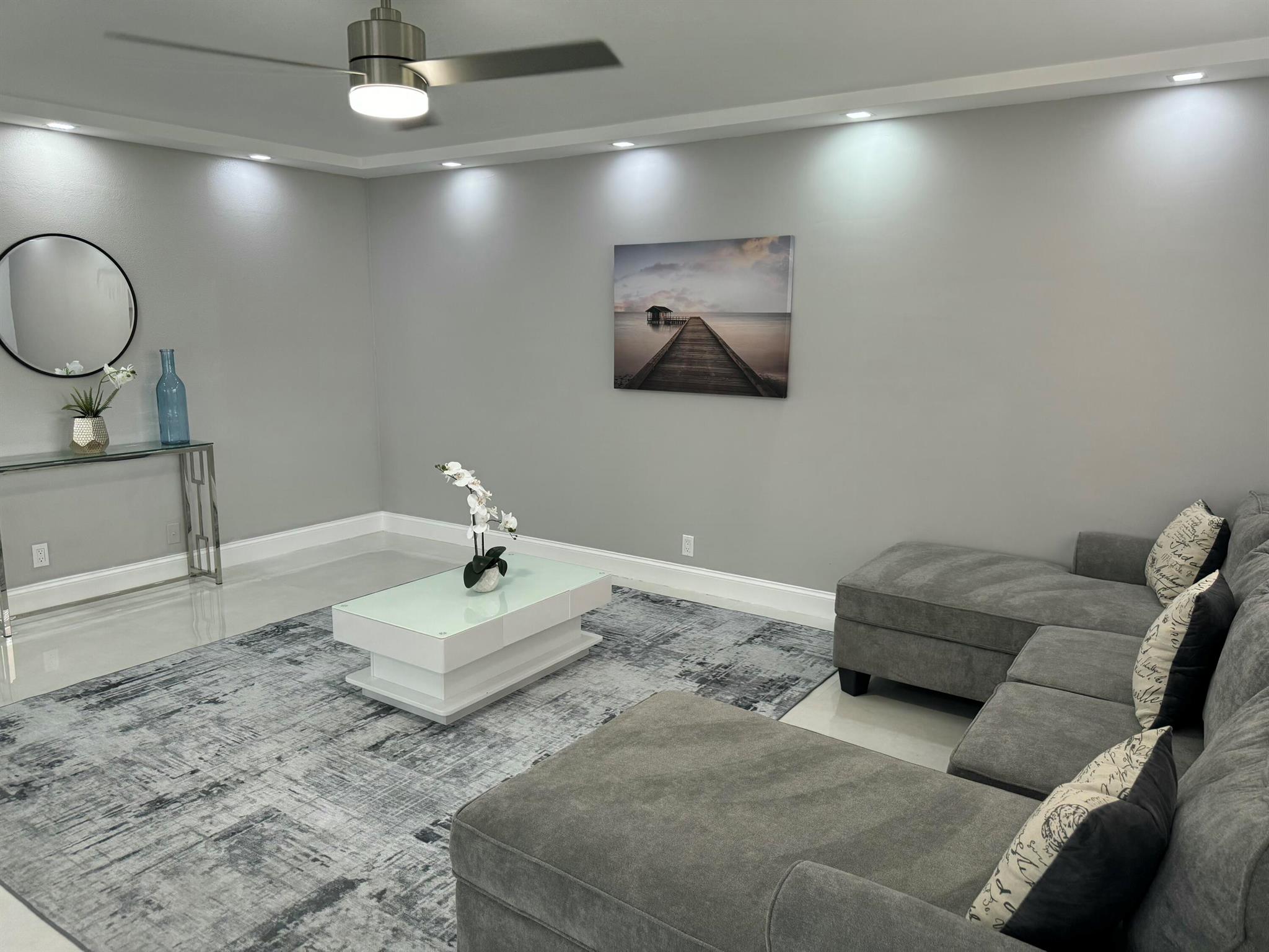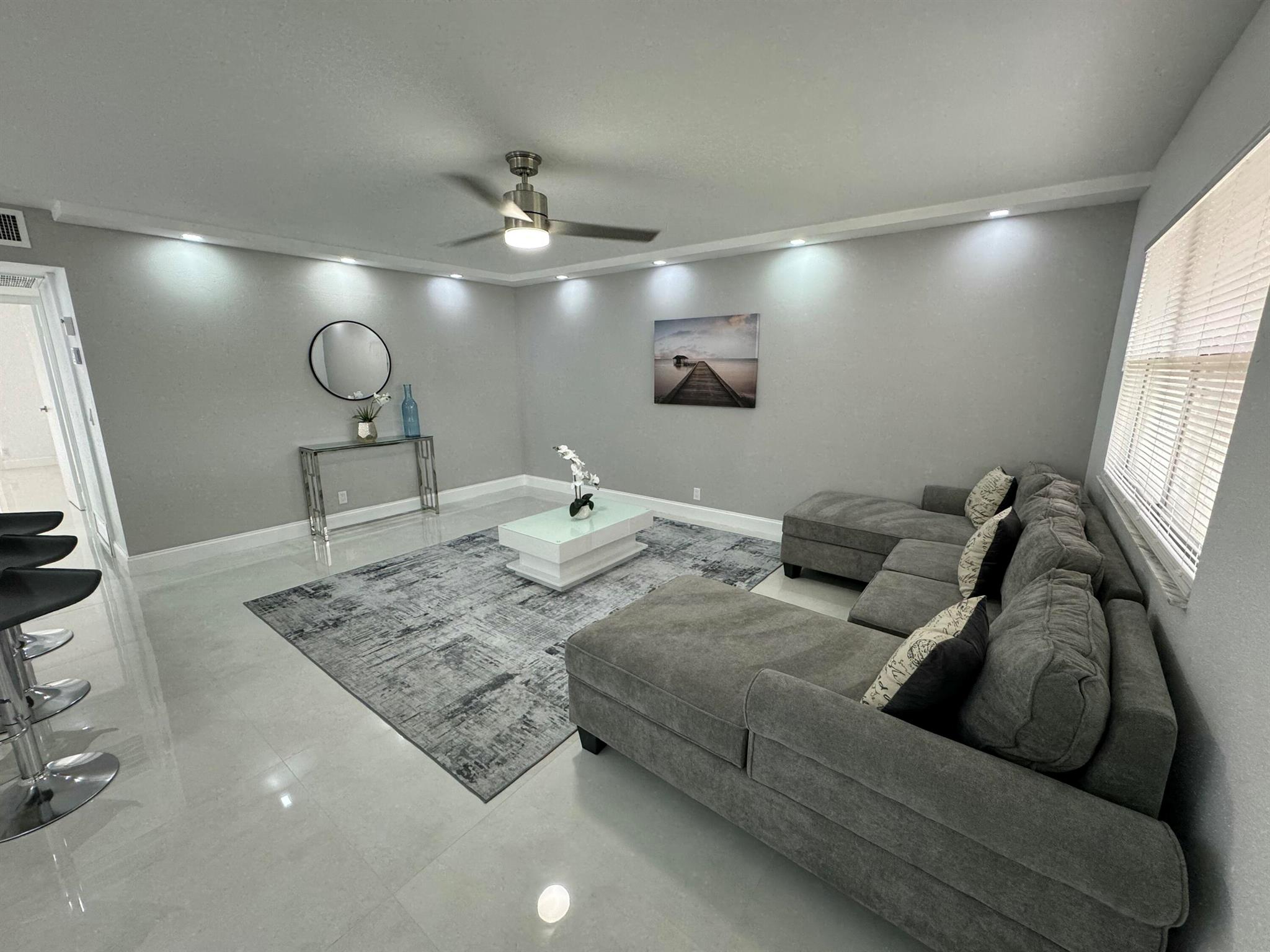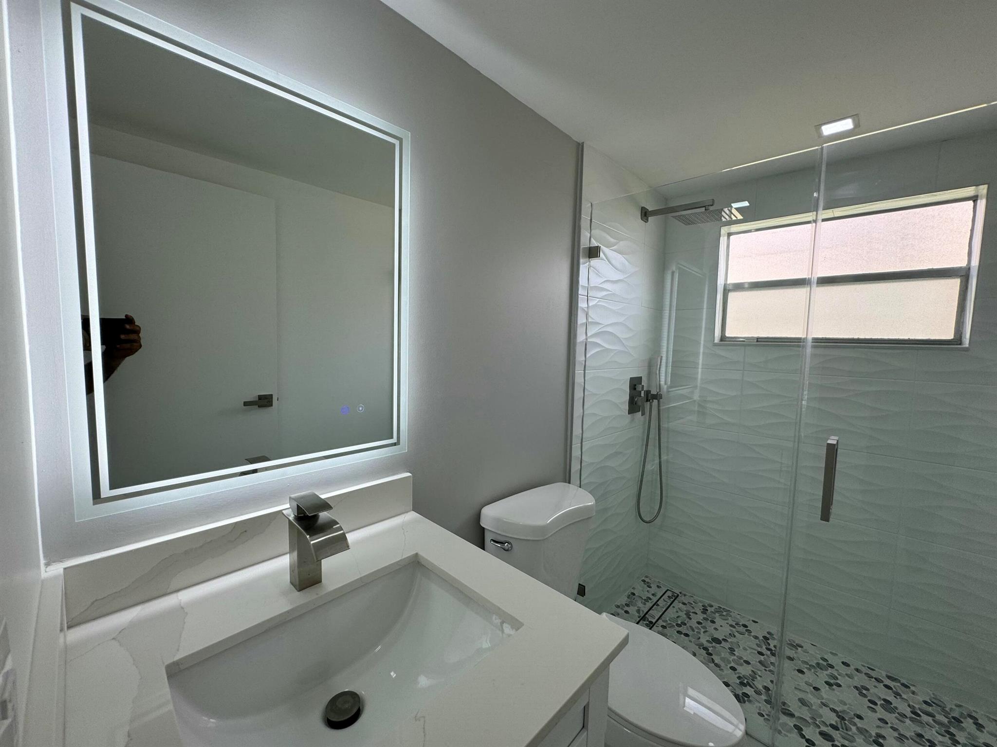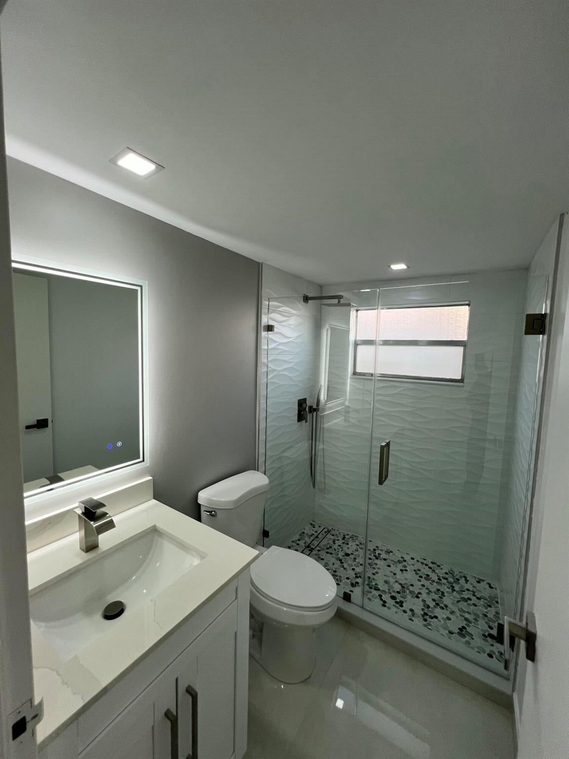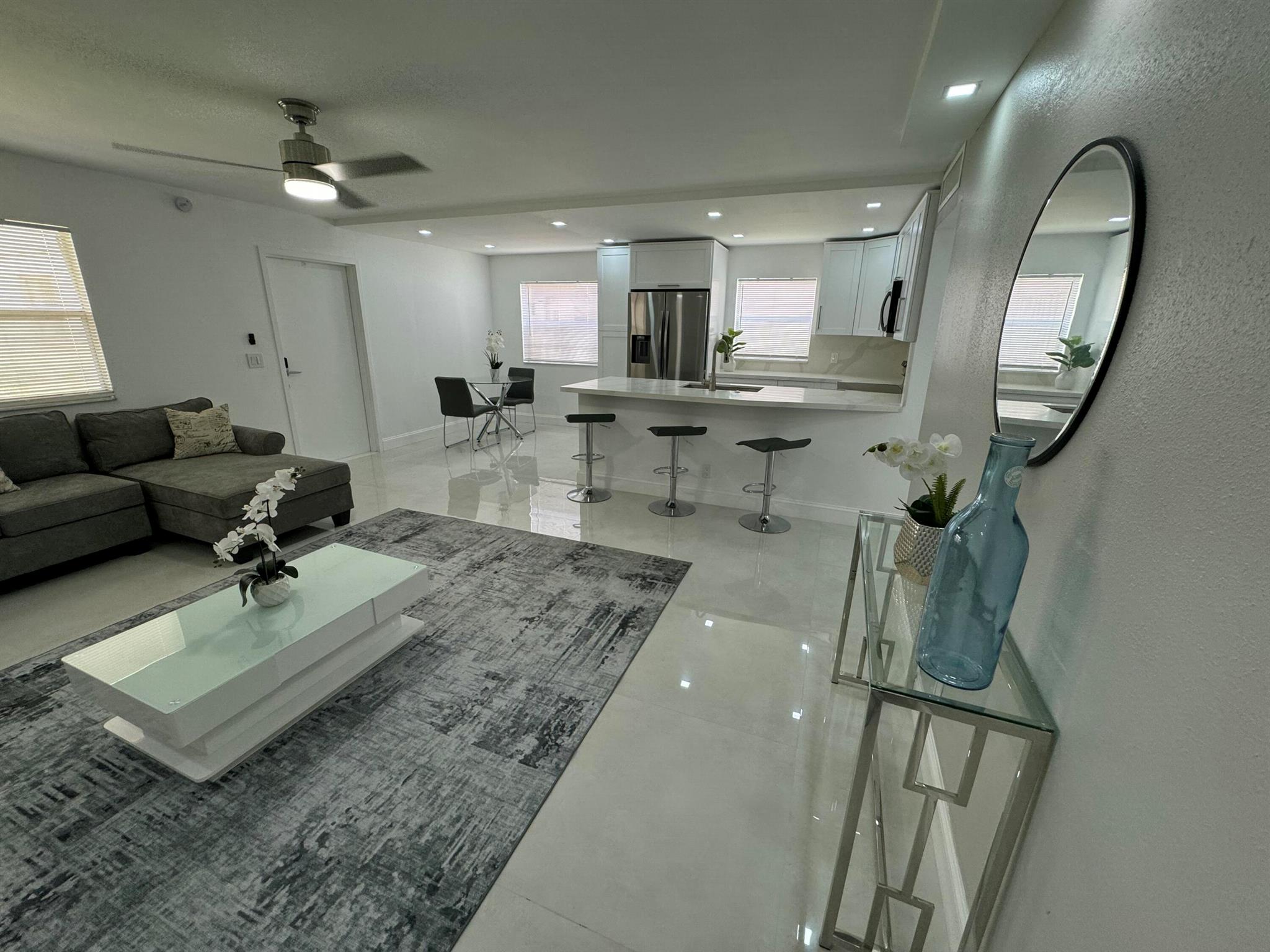 STUNNING UNIT! This beautiful 2 bedroom apartment is located in the heart of Kings Point; steps to the clubhouse, restaurant, and tennis and pickle ball courts, and pool!!! The apartment features two spacious bedrooms, each with plenty of natural light and ample closet space. The living room is bright and airy, with a large window. Kitchen boasts BRAND NEW appliances and beautiful white cabinetry, plus quartz countertops and backsplash. Added pantry cabinet. No detail was overlooked in this beautiful remodel. Neutral color palette to suit any decor style desired. Includes washer and dryer; electrical panel; water heater. All ceramic oversized tiles throughout; and two tastefully renovated bathrooms with frameless glass shower enclosures.