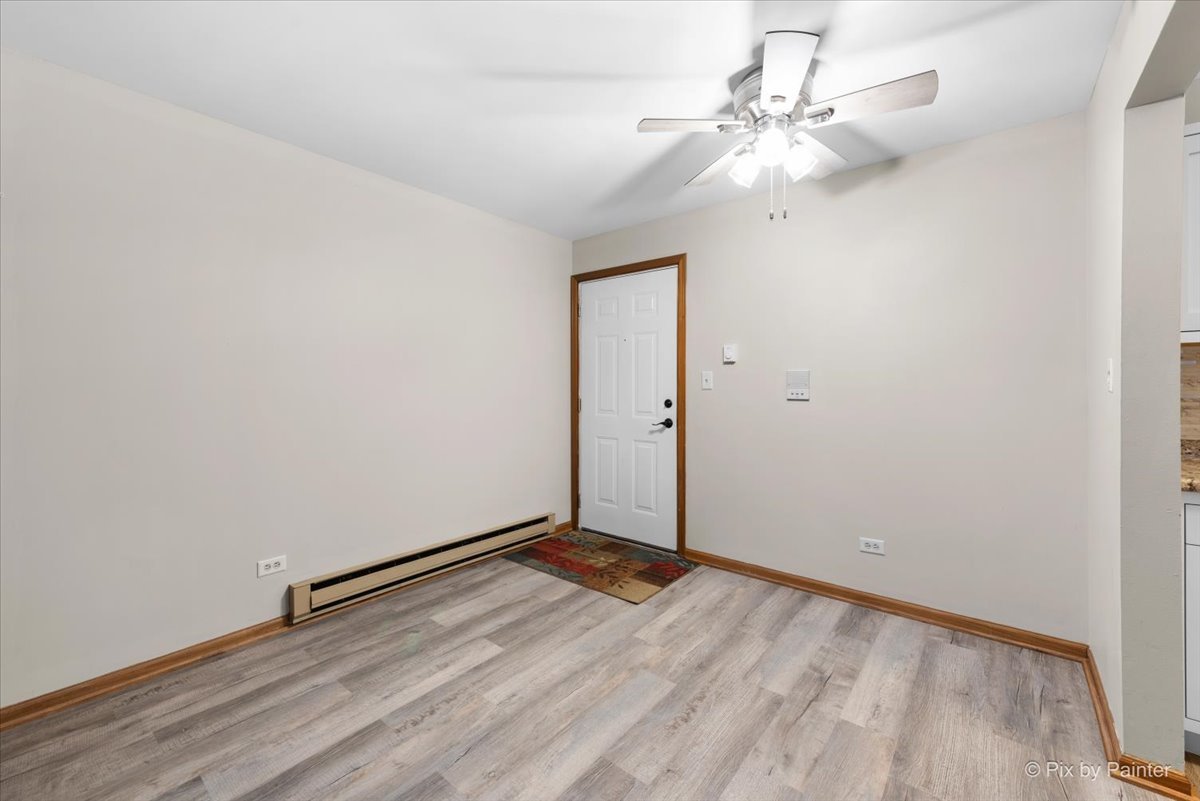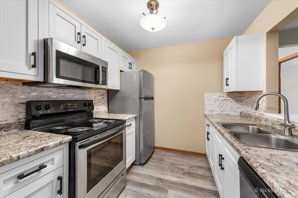 Freshly updated 1-bedroom, 1-bath condo with included 1-car garage. Move-in ready and priced to deliver immediate value with LOW MAINTENANCE. NEW kitchen cabinets (white shaker), NEW backsplash, and stainless steel appliances. NEW luxury vinyl plank flooring throughout the entire unit creates a clean, cohesive look from room to room. The open living room offers a wood-burning fireplace with built-in shelving and leads to a private balcony with additional deck storage. Spacious bedroom with private balcony access, NEW ceiling fan, and NEW window AC unit. Updated bathroom features NEW vanity, NEW backsplash, and NEW modern fixtures. In-unit washer and dryer with dedicated laundry closet. NEW paint throughout in fresh neutral tones. ONE-CAR GARAGE INCLUDED, a significant value in condo living. Well-maintained brick building in an established neighborhood with mature trees, maintained grounds, walking paths, volleyball court, and common green space. Minutes to downtown McHenry shops and restaurants, Moraine Hills State Park, Chain O'Lakes recreation, and local golf courses. Easy access to Route 120 and Route 31 for commuting. Quiet residential setting with everything you need close by. Every major visible component has been updated so there's nothing left to do but move in. This is smart equity from day one.