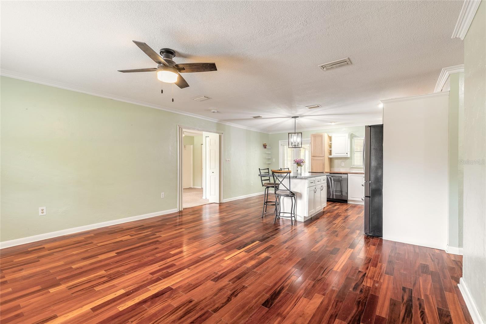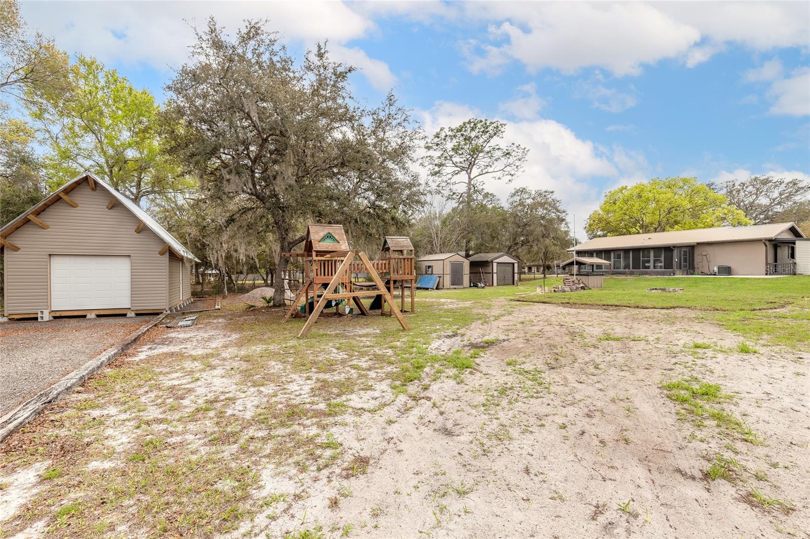 This 3-bedroom, 1-bath home in De Leon Springs sits on over half an acre with Agricultural A-3 zoning and offers plenty of room for outdoor activities, storage, and hobbies. The property features 1,296 sq ft under air plus a 312 sq ft vinyl-window screened porch overlooking the backyard.Inside, the home includes an updated kitchen and bathroom, updated appliances, and a large tiled shower. The layout provides comfortable living space with easy access to the screened porch for additional indoor-outdoor living.Recent improvements include a metal roof (2021), HVAC system (2020), new vinyl windows on the screened porch (2026), new backyard sod (2026), and a new concrete patio pad (2026). The home is serviced by well and septic and includes a water filtration system.The property includes an attached carport, three storage sheds (including a newly built approximately 450 sq ft shed), and plenty of parking space. Additional parking for a boat, trailer, RV, or other vehicles is available in the backyard through a double gate with access from Reynolds Rd., with asphalt millings providing a durable parking surface.Outdoor features include a fenced backyard, playground equipment and trampoline that will remain, and a corner lot location on Sue St. and Reynolds Rd. with access from both streets.Listing agent is the property owner. Shown by Appointment only. All information deemed reliable but not guaranteed. Buyer and buyers agent to verify measurements, zoning, and any information important to them.