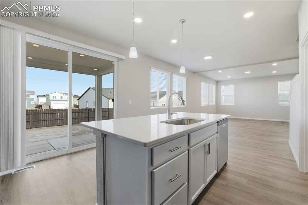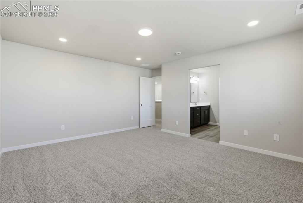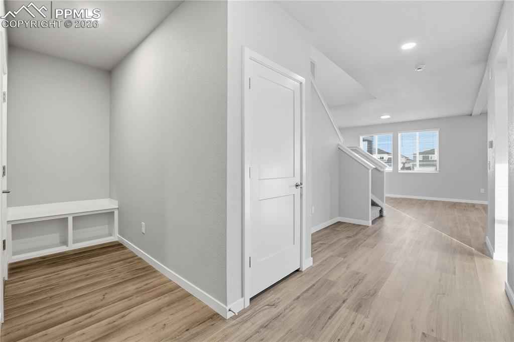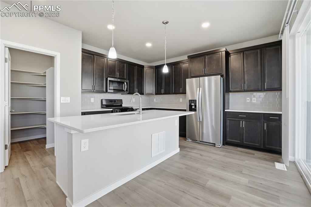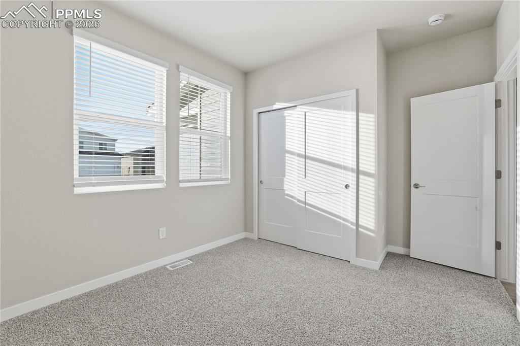Welcome to Mayberry, where modern comfort meets stylish design. This beautiful brand new home offers 2,354 square feet of thoughtfully designed living space, featuring 5 bedrooms, 3 bathrooms, and a 3 car tandem garage. Oversized windows fill the open concept main living area with natural light, creating a bright and inviting atmosphere. The kitchen is equipped with quartz countertops, a gas range, stainless steel appliances including a refrigerator and a generous walk in pantry providing excellent storage. The private primary suite offers a spa inspired bath with dual sinks, quartz countertops, abundant cabinetry, a glass enclosed walk-in shower, and a spacious walk-in closet. Upstairs, you will also find three additional bedrooms, a full bathroom with an oversized soaking tub, and a large laundry room for added convenience. A fifth bedroom and three quarter bath on the main level provide flexibility for guests, multigenerational living, or a home office. Ideally located just minutes from Schriever Space Force Base, 20 to 25 minutes from Peterson Space Force Base, and 35 to 40 minutes from Fort Carson for an easy commute.