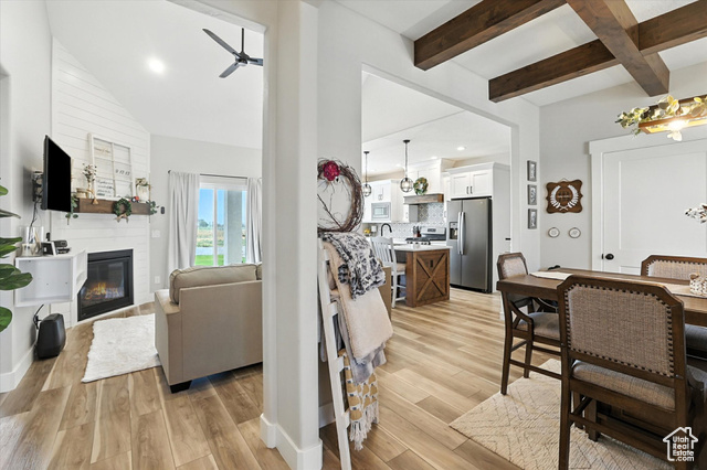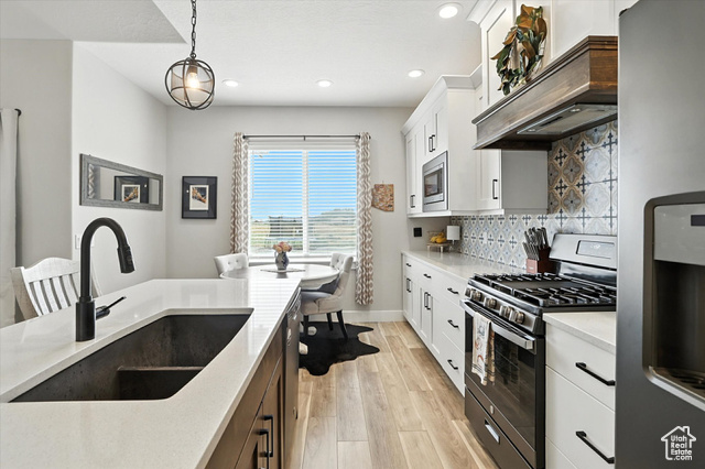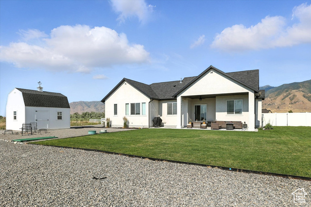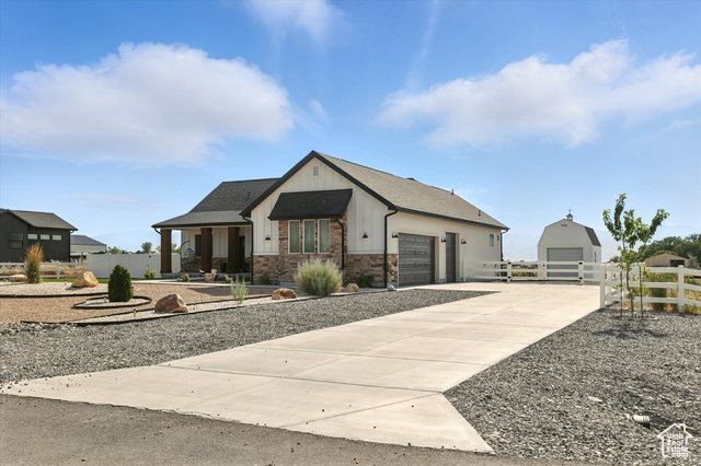 Welcome to this stunning custom home nestled on 1.38 acres of horse property in the peaceful community of Erda. Enjoy quiet mornings on the front porch with beautiful mountain views. The heart of the home is the beautifully designed kitchen, complete with custom cabinetry, quartz countertops, and sleek graphite appliances - all included! The open layout flows seamlessly to the covered back patio, perfect for relaxing or entertaining guests. Thoughtful exterior features like permanent trim lighting add evening ambiance, while the 160 sq ft shed with a loft provides additional storage space. The 3rd car garage has a 9 ft door and is wired for an electric vehicle charger. With space, comfort, and function both inside and out, this property offers the ideal blend of rural charm and modern convenience.