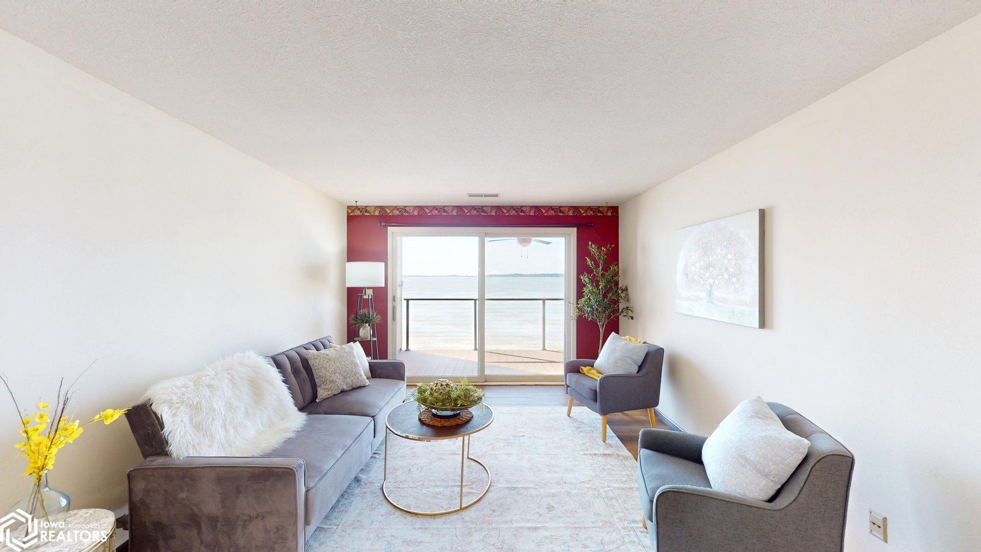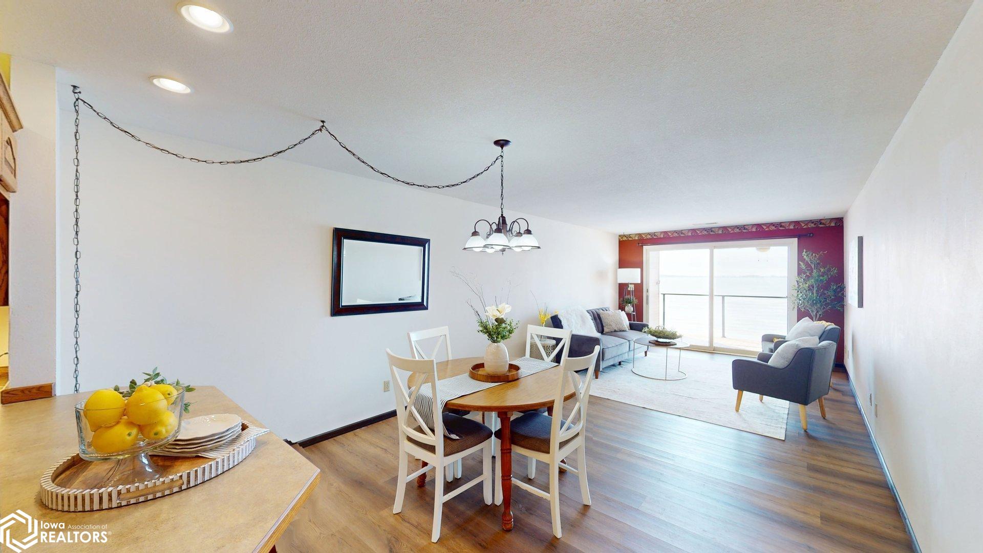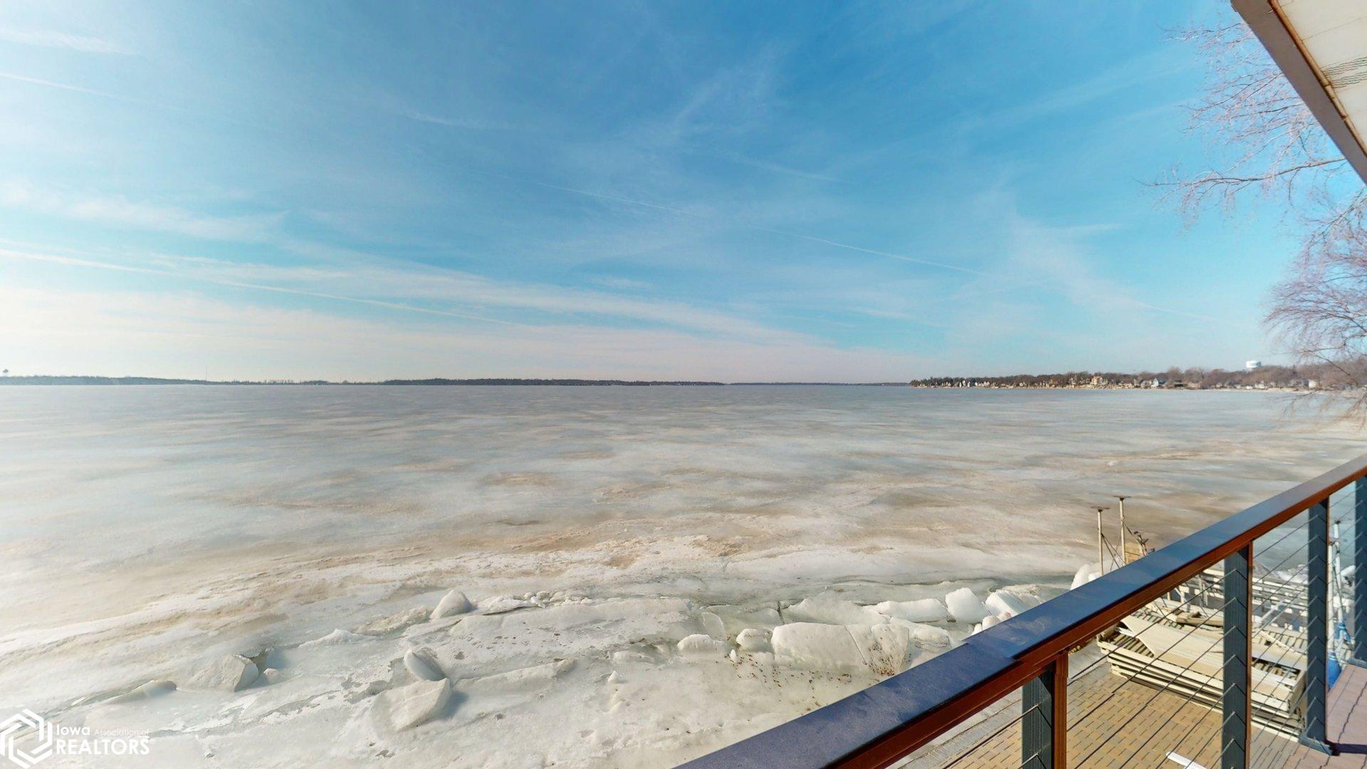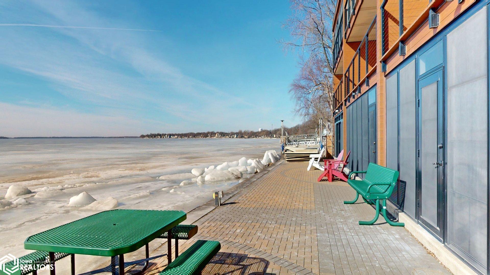 Lakefront Living at Its Finest. Wake up to breathtaking water views and unwind each evening with unforgettable sunsets over Clear Lake. This beautiful lakeshore condo delivers serene waterfront living with a private balcony overlooking the water perfect for morning coffee or evening wine. Enjoy a spacious open-concept living and dining area filled with panoramic lake views. The condo features 2 bedrooms and 2 bathrooms, including a walk-in shower in the primary suite. The private lake-access building offers an elevator, no steps to the dock, a gorgeous lakeside patio, and front-row views of iconic sunsets, 4th of July fireworks, and colorful kites during the annual festival. Located in the sought-after Surf District, youre just steps from the farmers market, restaurants, family entertainment, concerts at the legendary Surf Ballroom, and walking distance to downtown. Whether youre searching for a year-round residence or weekend retreat, this is a rare opportunity to update and personalize a prime lakefront condo. Location, location, location. (This building is a no dog building)