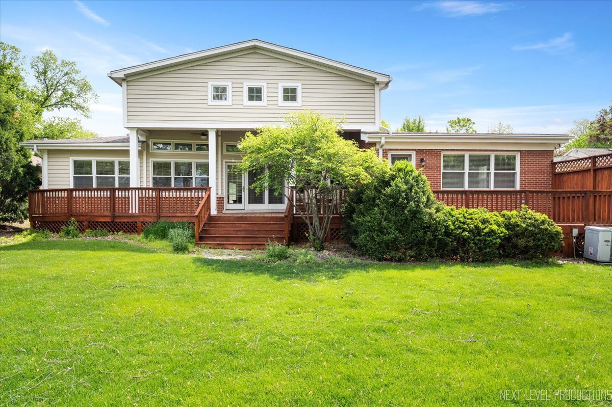 Stunning custom ranch with finished basement with 9-foot ceilings and open-concept living! Step through frosted French doors into a tray-ceiling foyer with fireplace, vaulted ceilings, wide baseboards, recessed lighting, and hardwood floors. The living and dining areas feature a dramatic floor-to-ceiling stone see-through fireplace and sun-filled clerestory windows. Entertain with a wet bar, built-in buffet, and dual access to a massive deck overlooking a private fenced backyard with mature landscaping. The chef's kitchen includes custom cabinetry with slide-out drawers, granite island with seating, double ovens, pendant and under-cabinet lighting, and a pantry. Spacious primary suite offers vaulted ceilings, dual walk-in closets, private deck access, and a spa-like bath with skylight, dual vanities, jetted tub, and walk-in shower. Two additional main-level bedrooms plus a third full bath, and a laundry area complete the main floor. The finished basement includes a large family room, guest bedroom with full bath, and abundant storage. Zoned HVAC, new roof (2021), high-efficiency water heater (2021), LeafGuard gutter system, and oversized 2-car garage. Move-in ready, perfect for entertaining, and full of luxurious touches!