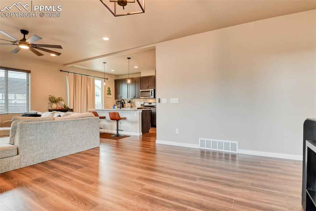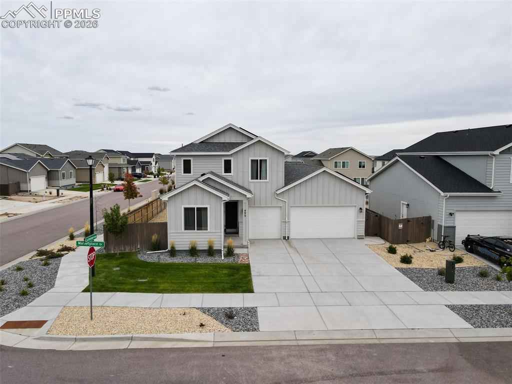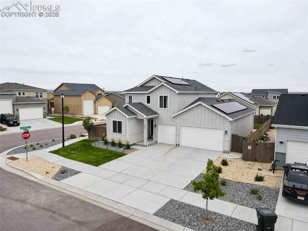 Welcome to Mayberry Communities! This beautifully crafted new-build home offers the perfect blend of modern efficiency and inviting comfort. Featuring 4 spacious bedrooms, 3 bathrooms, and a generous 5-car garage, this residence is designed to accommodate todayx2019;s lifestyle. Step inside to an open-concept layout filled with natural light, a gourmet kitchen with quartz countertops, stainless steel appliances (including refrigerator), gas range, and ample cabinetry with tall uppers, plus a walk-in pantry for added convenience. The primary suite is a true retreat, complete with dual sinks, a quartz vanity, glass-enclosed walk-in shower, and large walk-in closet. This home stands out with its energy-saving solar panels, giving you the advantage of lower utility bills and eco-friendly living. Outside, enjoy a nicely landscaped backyard, perfect for entertaining, relaxing, or Colorado evenings under the stars. Additional highlights include second-story laundry and thoughtful finishes throughout. Located in the growing Mayberry community, youx2019;ll enjoy small-town charm with easy access to Colorado Springs, Peterson SFB, Schriever SFB, and Fort Carson. Donx2019;t miss the opportunity to own this beautiful home with solar efficiency and a turnkey backyard!