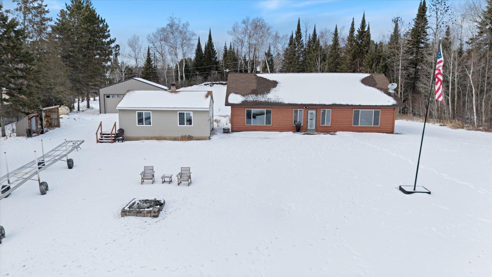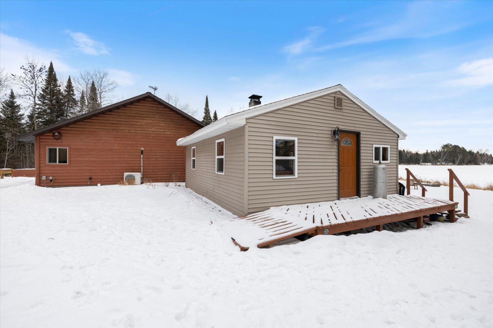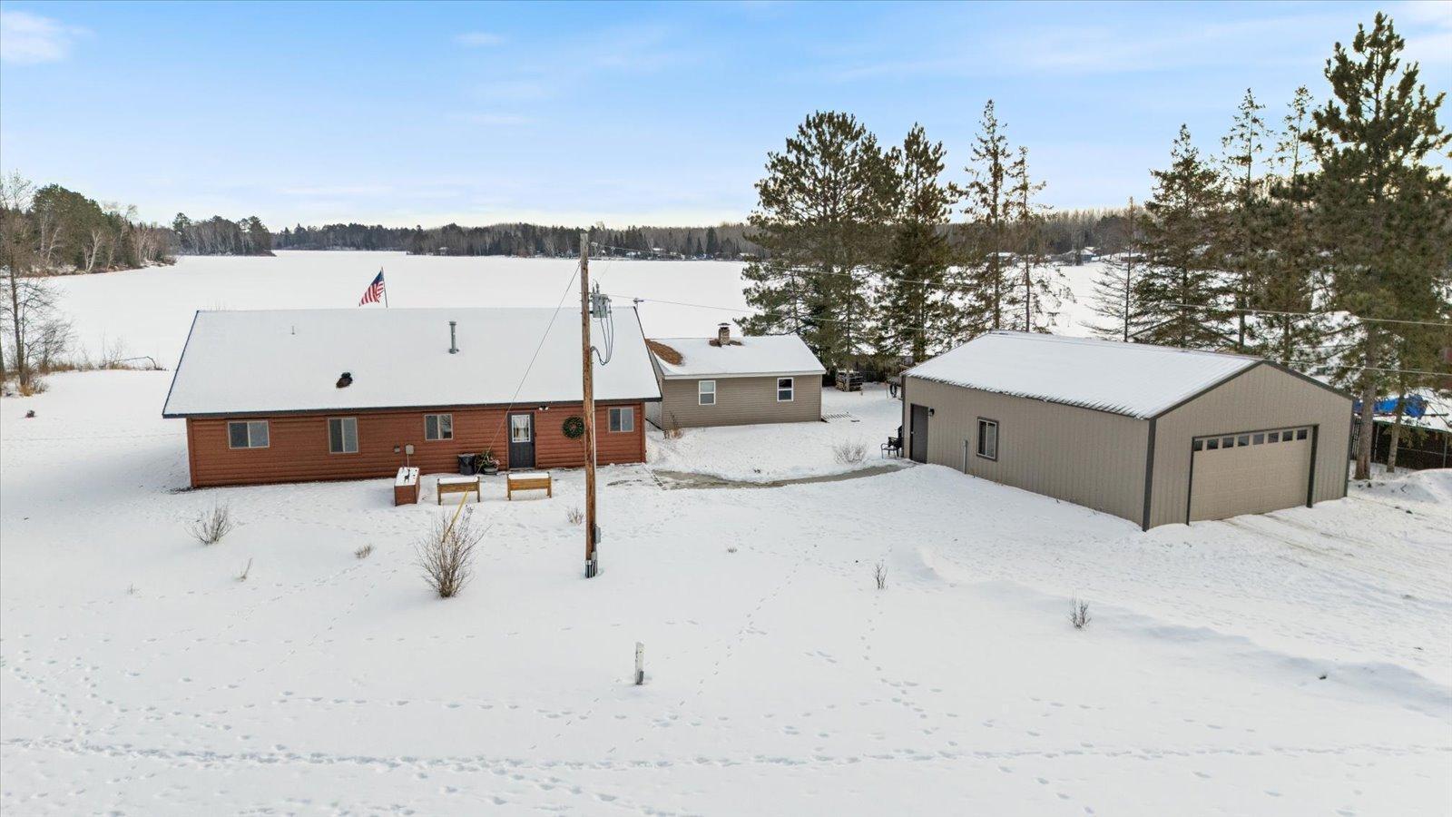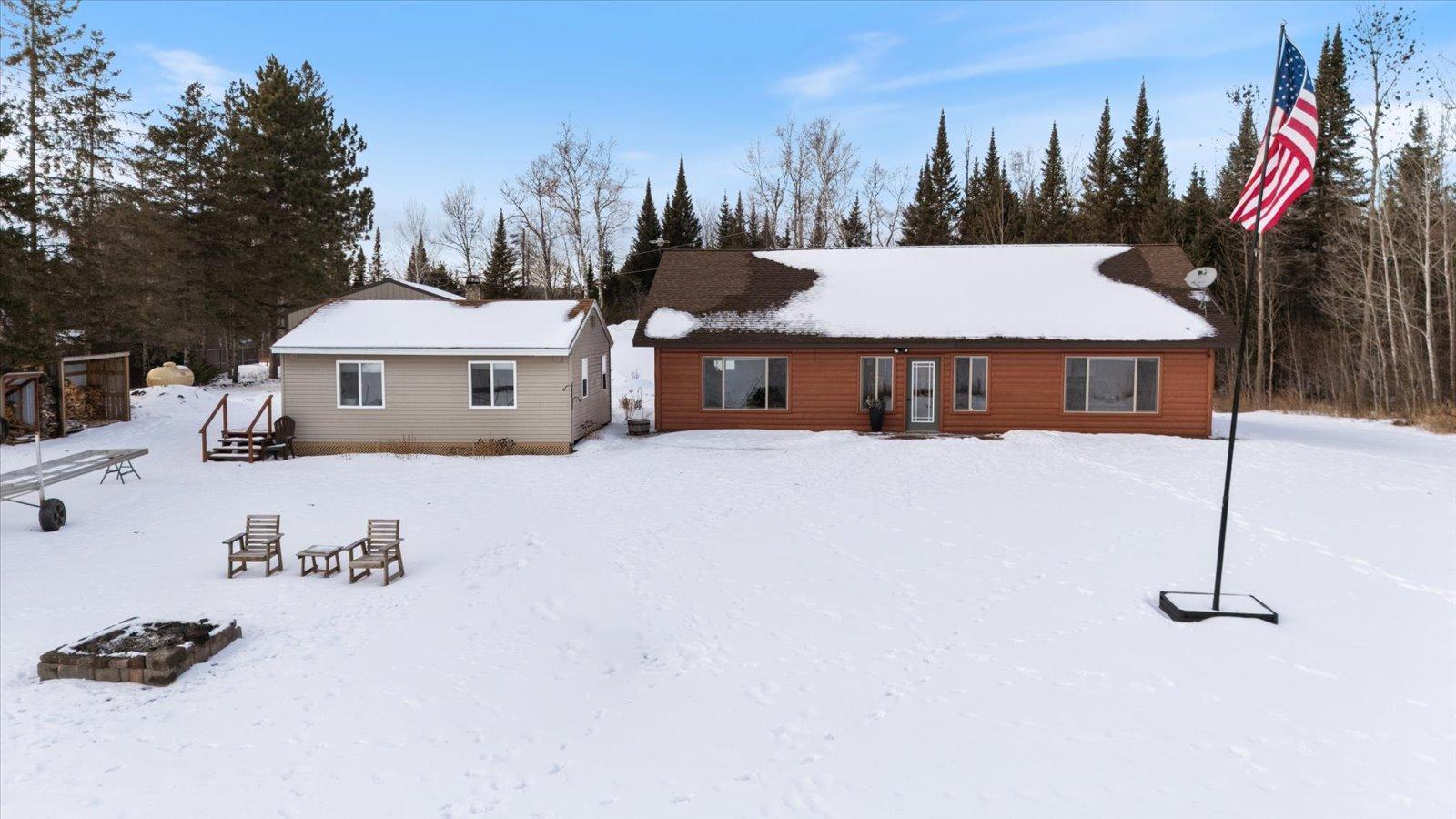 Welcome to lake life on beautiful Long Lake near Bigfork, MN! Built in 2010, this well-designed 2-bedroom, 1.5-bath home (with easy potential for a second full bath) offers over 1,600 square feet of comfortable one-level living. The open-concept layout features vaulted ceilings, in-floor heat, a cozy propane free-standing fireplace, and a kitchen with hickory cabinets, Center Island, and gas stoveperfect for gathering and entertaining. Enjoy lake views from the main living area and primary bedroom, plus the convenience of a mini-split for heating and A/C. Step outside to relax or entertain on the spacious 16x24 lakeside patio while taking in the water views. The level one-acre lot includes 157 feet of shoreline with easy boat access, a lakeside fire pit, and a charming 20x24 two-bedroom cabin with wood heat for guests. A 26x36 pole building (built in 2021) offers concrete floors, electric, drive-through access, and garage door openersideal for toys and storage. Connected to hundreds of acres of state & tax-forfeit land, this property is the perfect blend of privacy, recreation, and year-round enjoyment. This is where dreams come true and memories are made! Come take a peek!