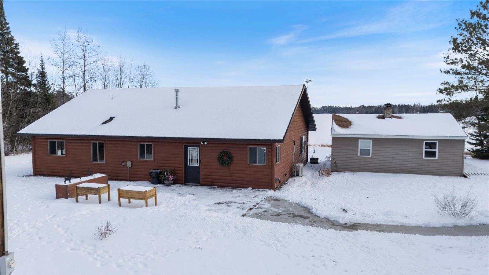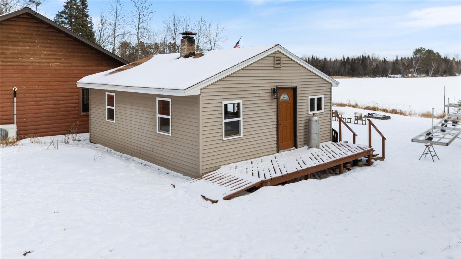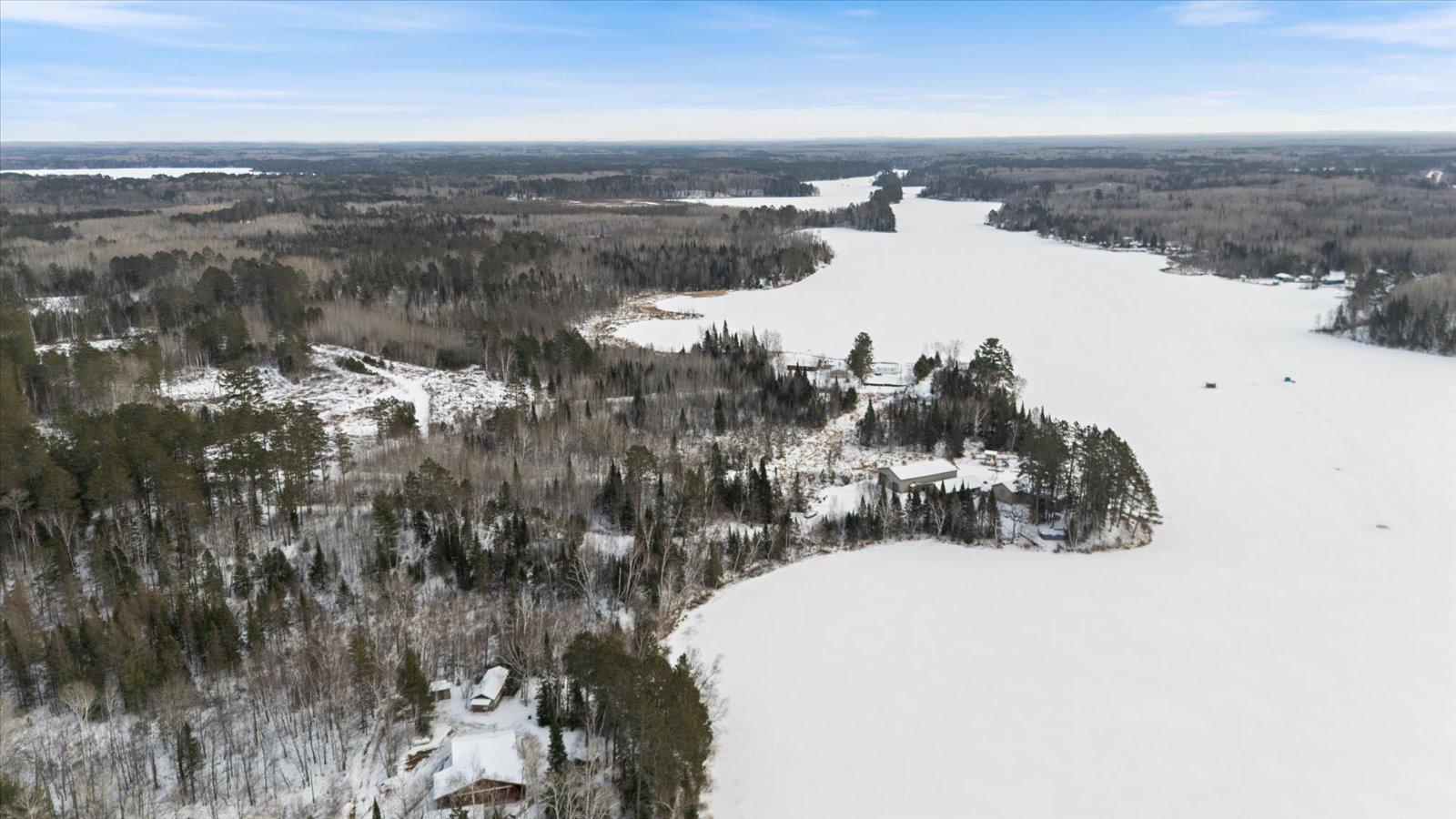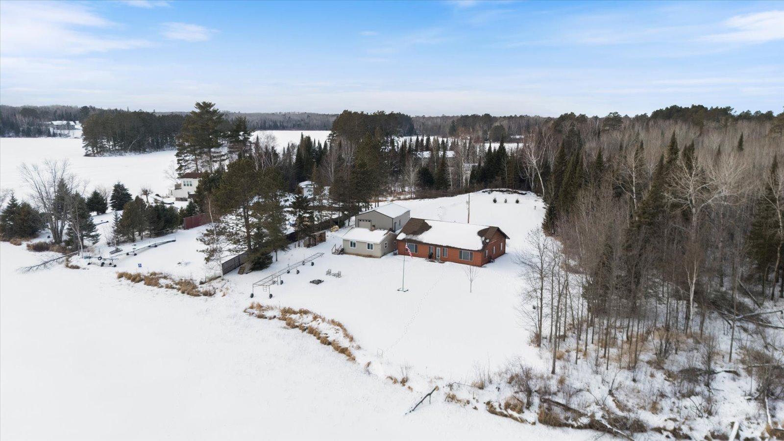 Welcome to lake life on beautiful Long Lake near Bigfork, MN! Built in 2010, this well-designed 2-bedroom, 1.5-bath home (with easy potential for a second full bath) offers over 1,600 square feet of comfortable one-level living. The open-concept layout features vaulted ceilings, in-floor heat, a cozy propane free-standing fireplace, and a kitchen with hickory cabinets, Center Island, and gas stoveperfect for gathering and entertaining. Enjoy lake views from the main living area and primary bedroom, plus the convenience of a mini-split for heating and A/C. Step outside to relax or entertain on the spacious 16x24 lakeside patio while taking in the water views. The level one-acre lot includes 157 feet of shoreline with easy boat access, a lakeside fire pit, and a charming 20x24 two-bedroom cabin with wood heat for guests. A 26x36 pole building (built in 2021) offers concrete floors, electric, drive-through access, and garage door openersideal for toys and storage. Connected to hundreds of acres of state & tax-forfeit land, this property is the perfect blend of privacy, recreation, and year-round enjoyment. This is where dreams come true and memories are made! Come take a peek!