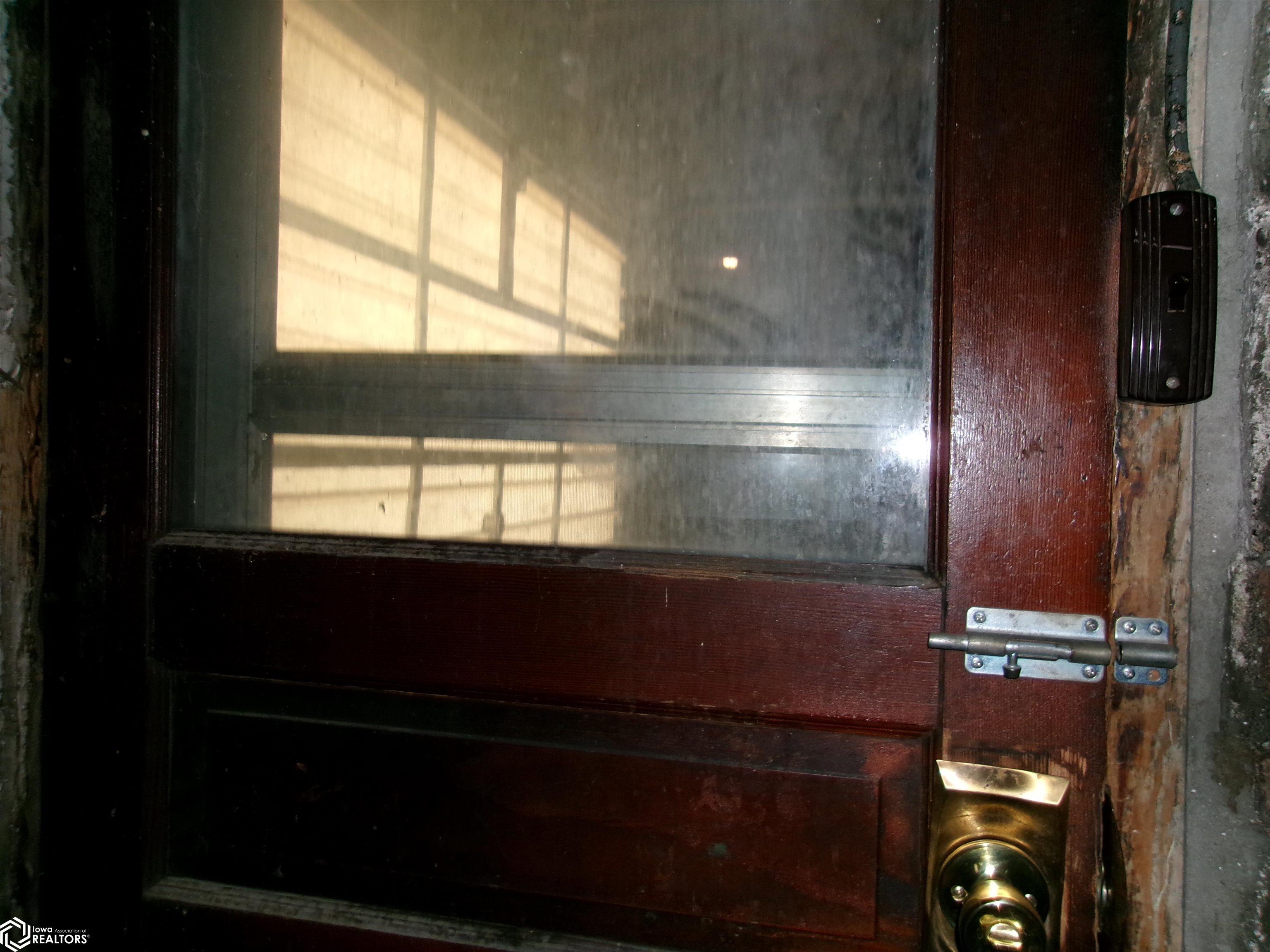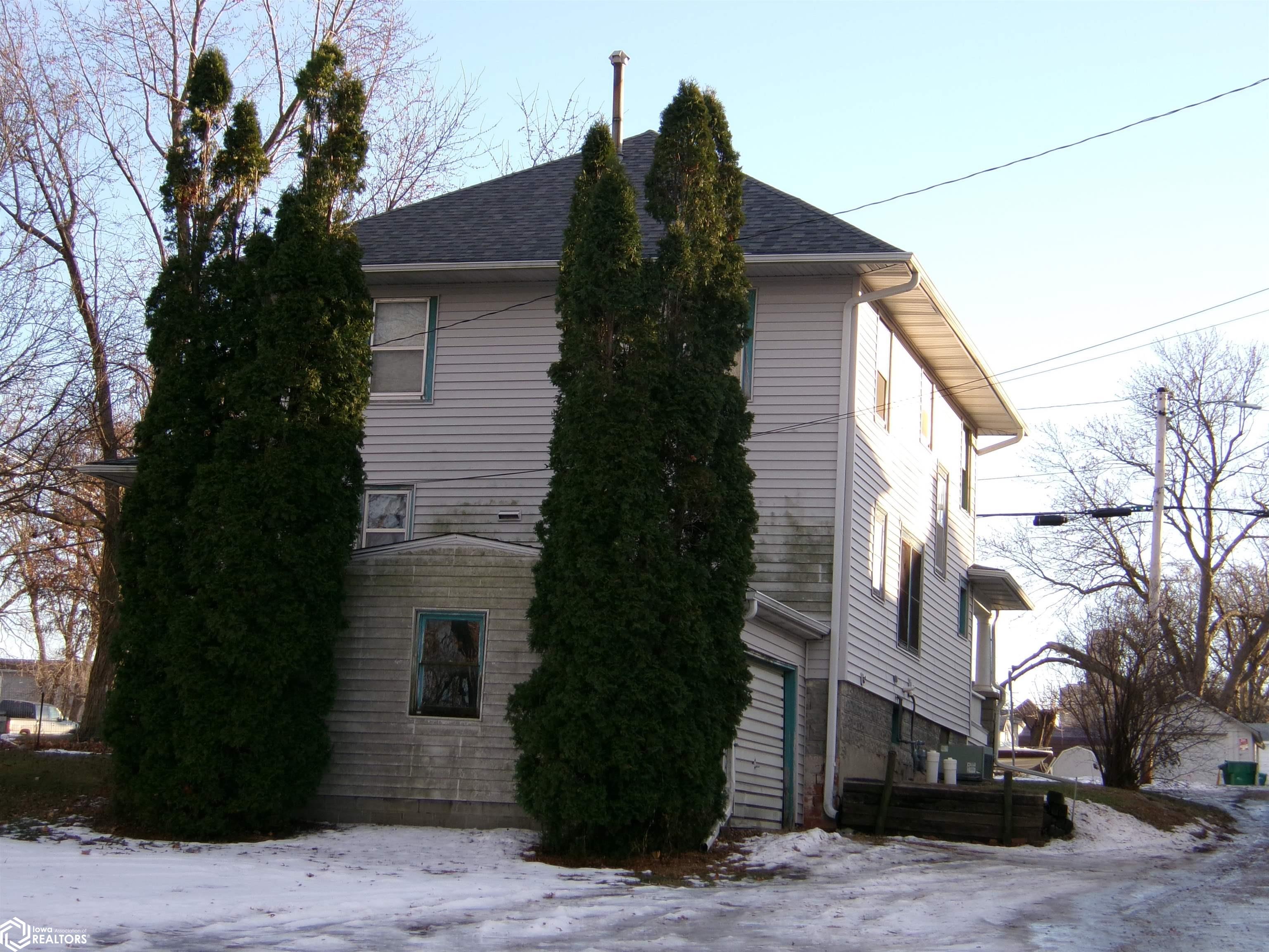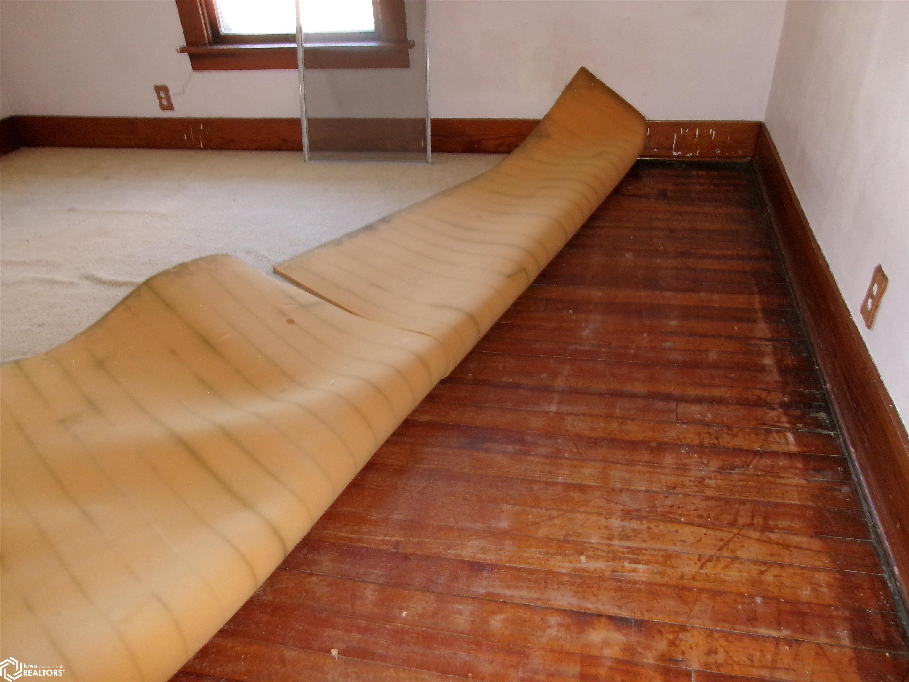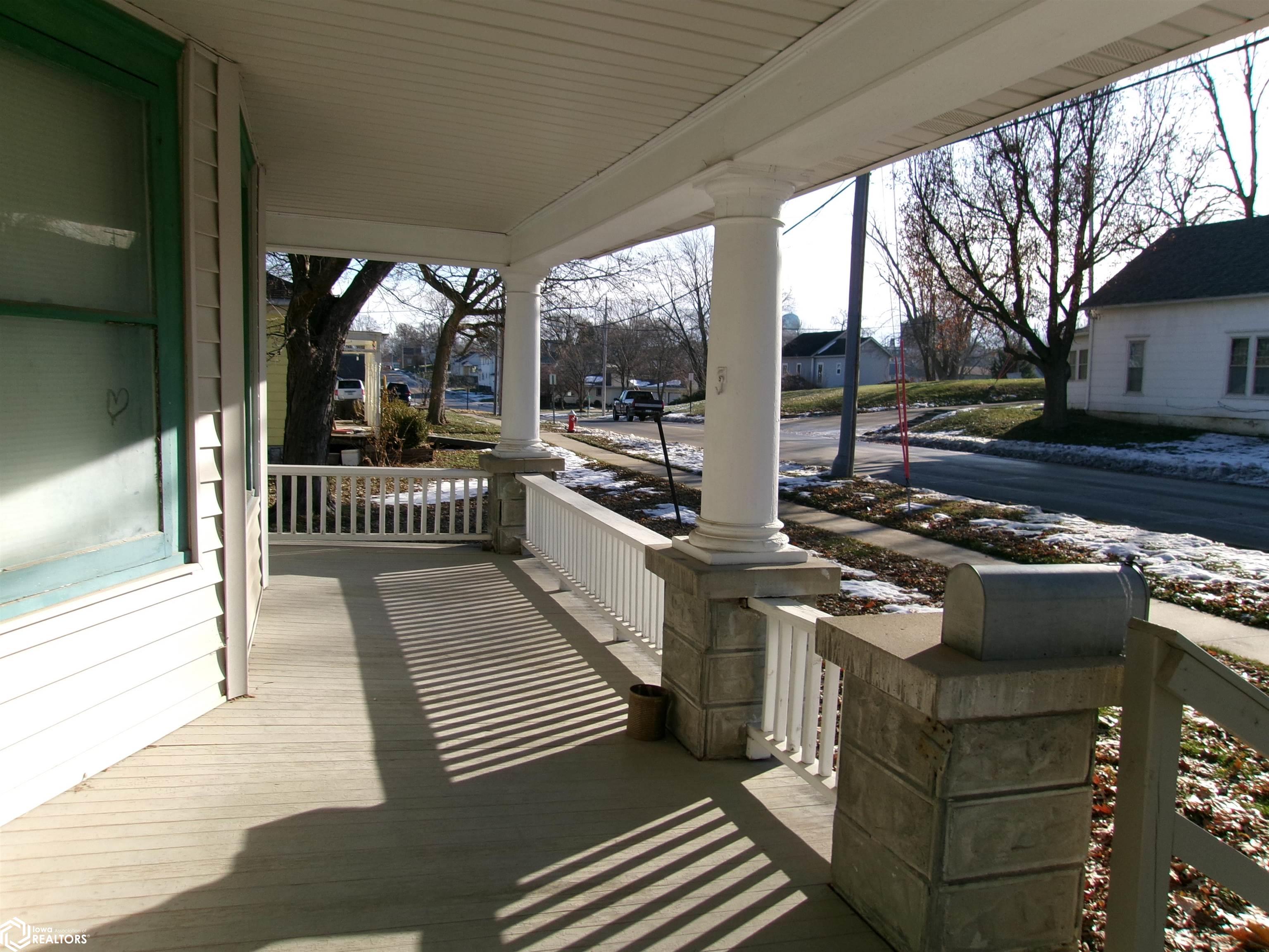 Sturdy 4 square home with a full width open front porch. Separate entry way with open stair case. Hardwood under old carpet throughout. All the wood trim is in excellent condition. Kitchen has had some renovations. Room for a small kitchen table. Between living and dining room are bookcase dividers with glass on the dining room side. Also a window seat in dining room. 1 main floor bedroom and 3/4 tub bath. 4 upstairs bedrooms with hardwood under carpets. Upstairs bath is missing the sink. Hallway features unusual 4 ft. wide linen closet with shelves and drawers. Garage is accessed through the basement. Newer Rheem furnace. 1 wall has been redone. Enclosed back porch only accessed from inside is great storage or pantry.
