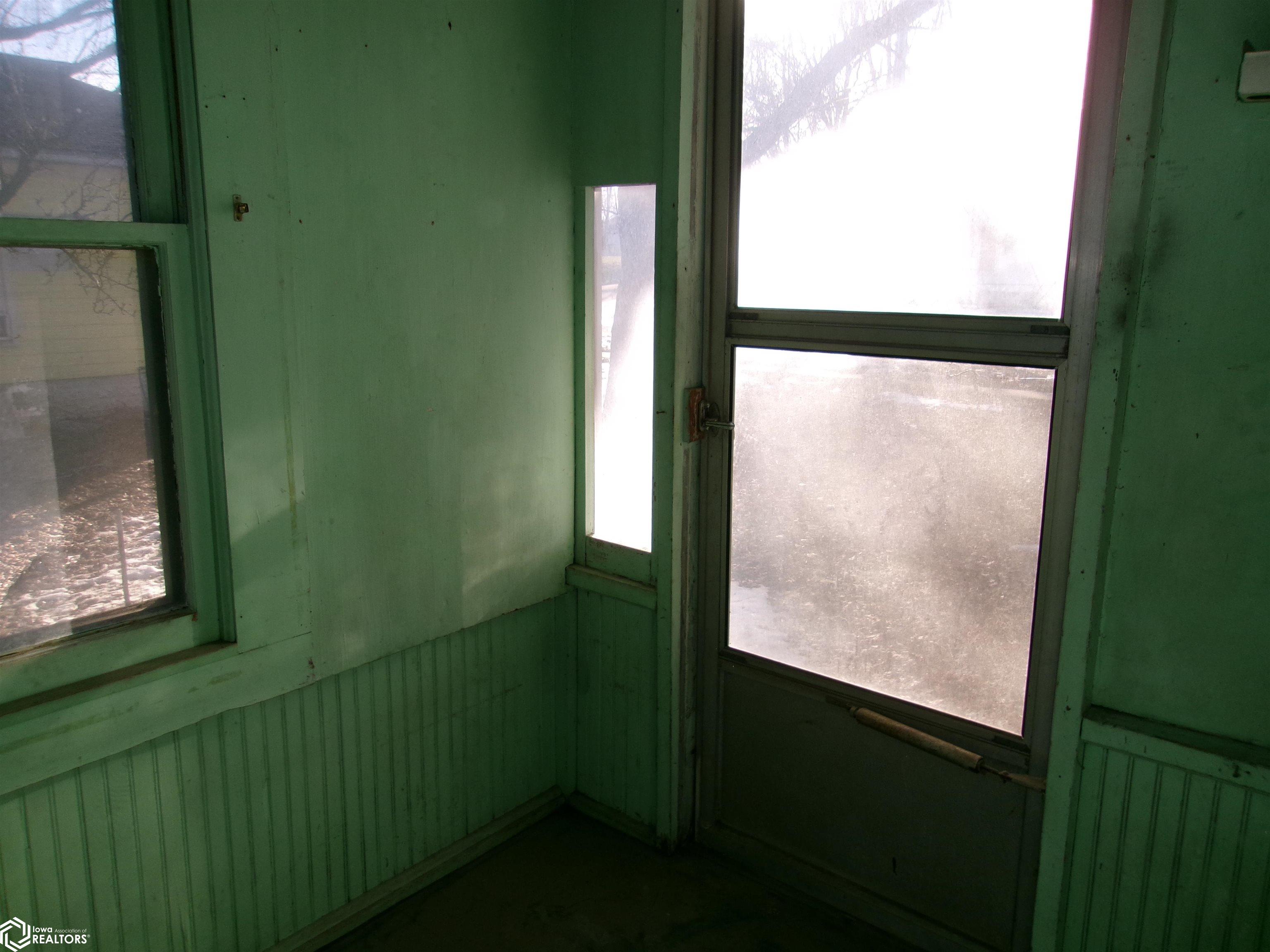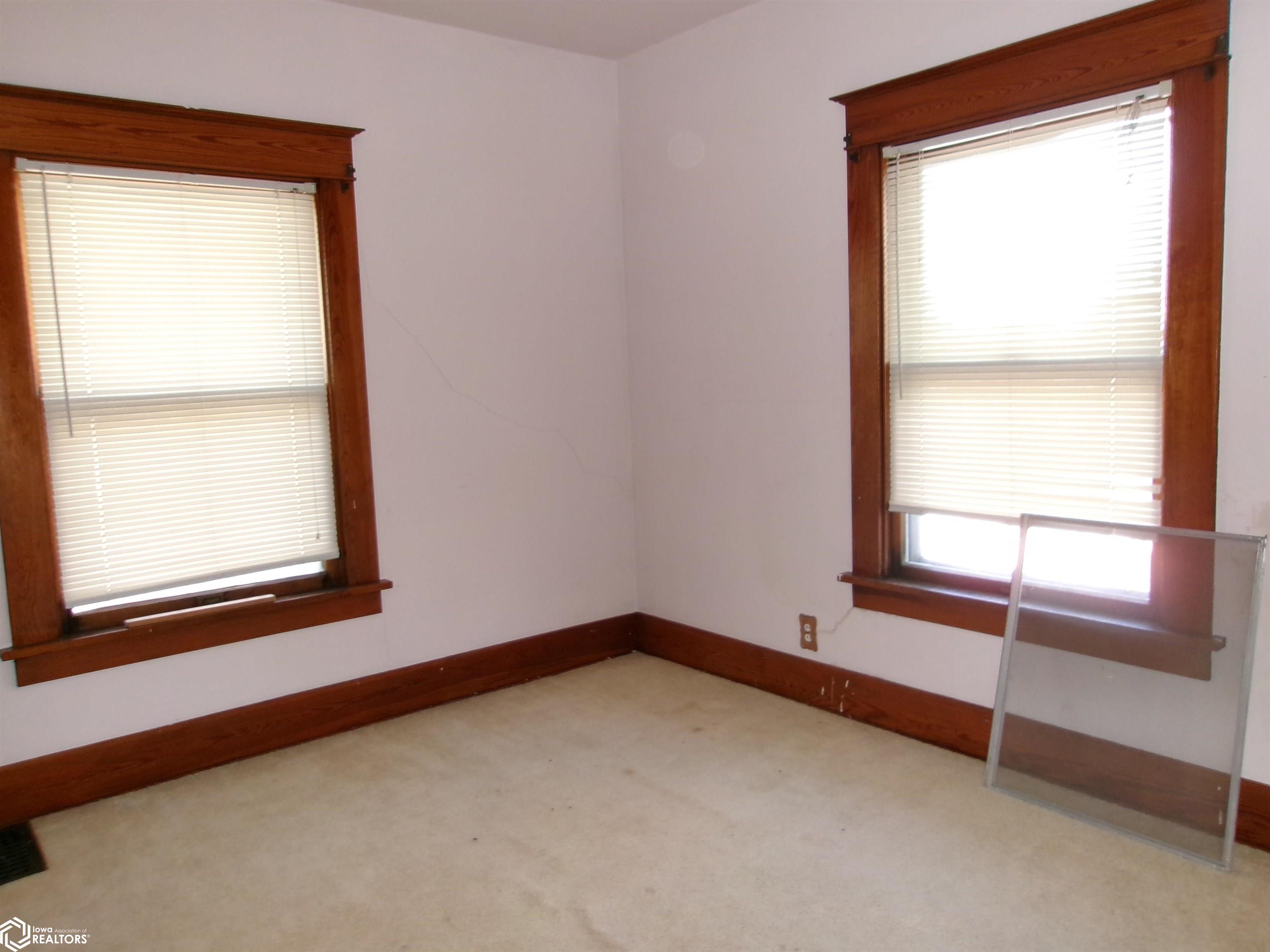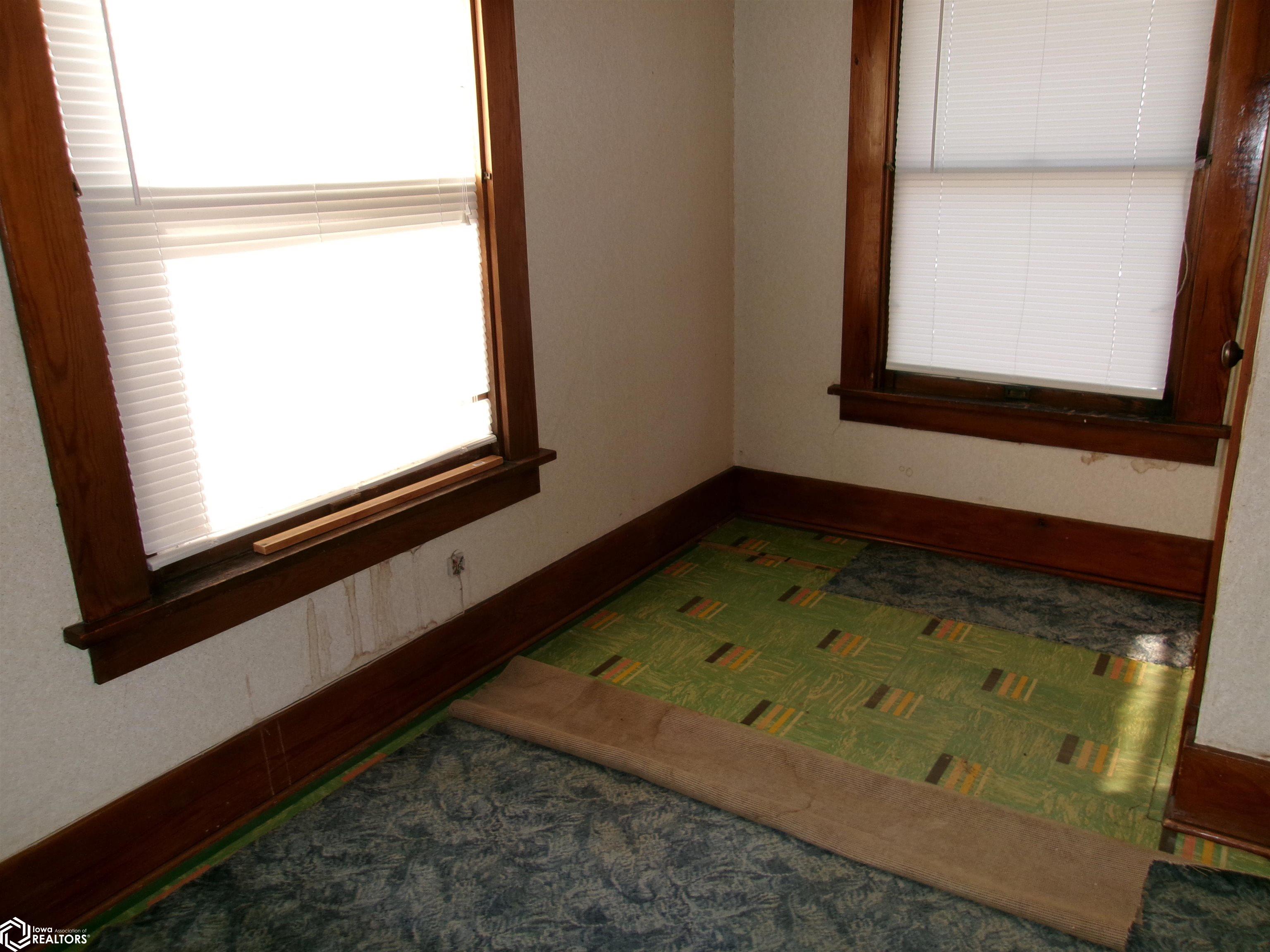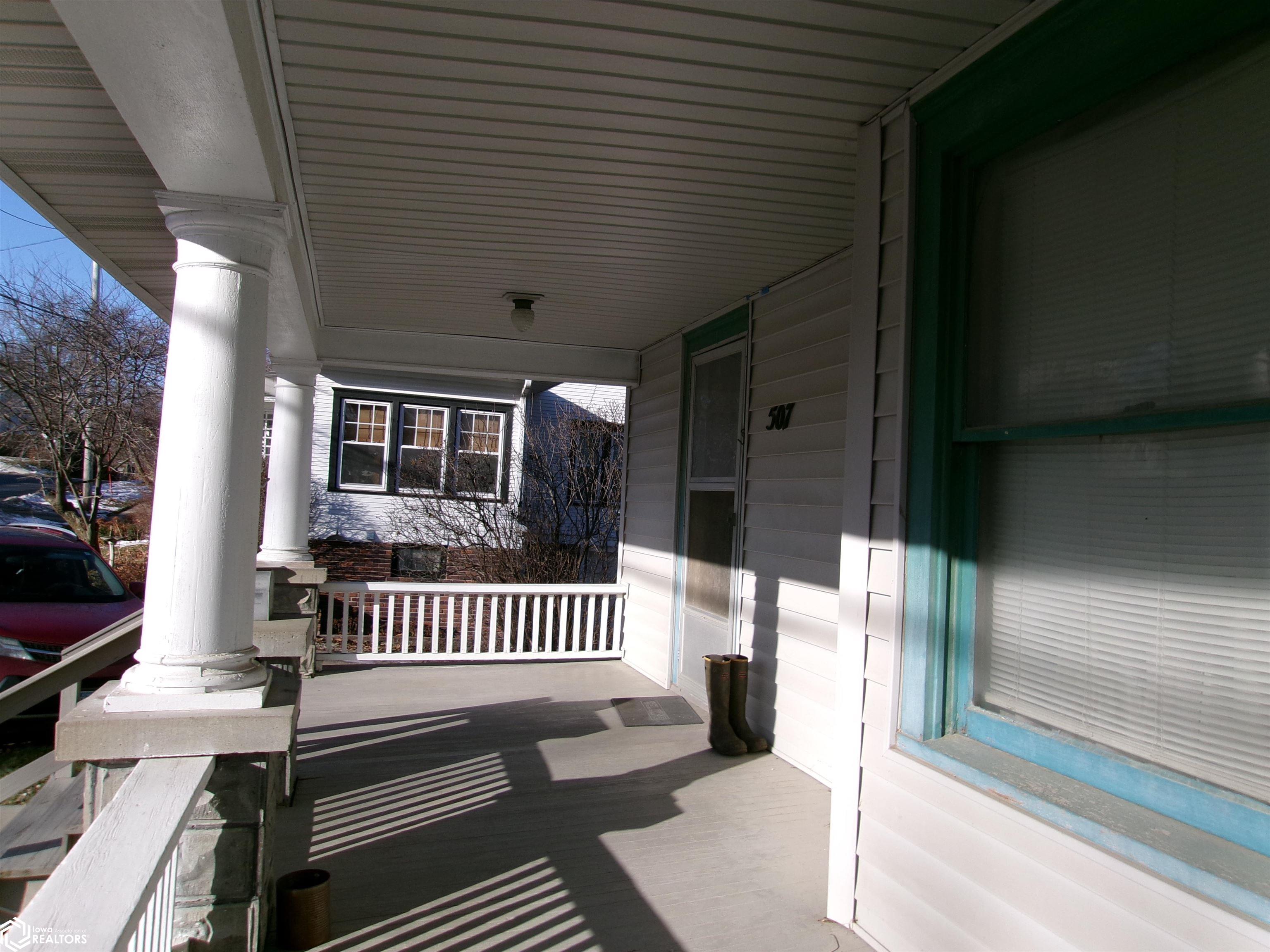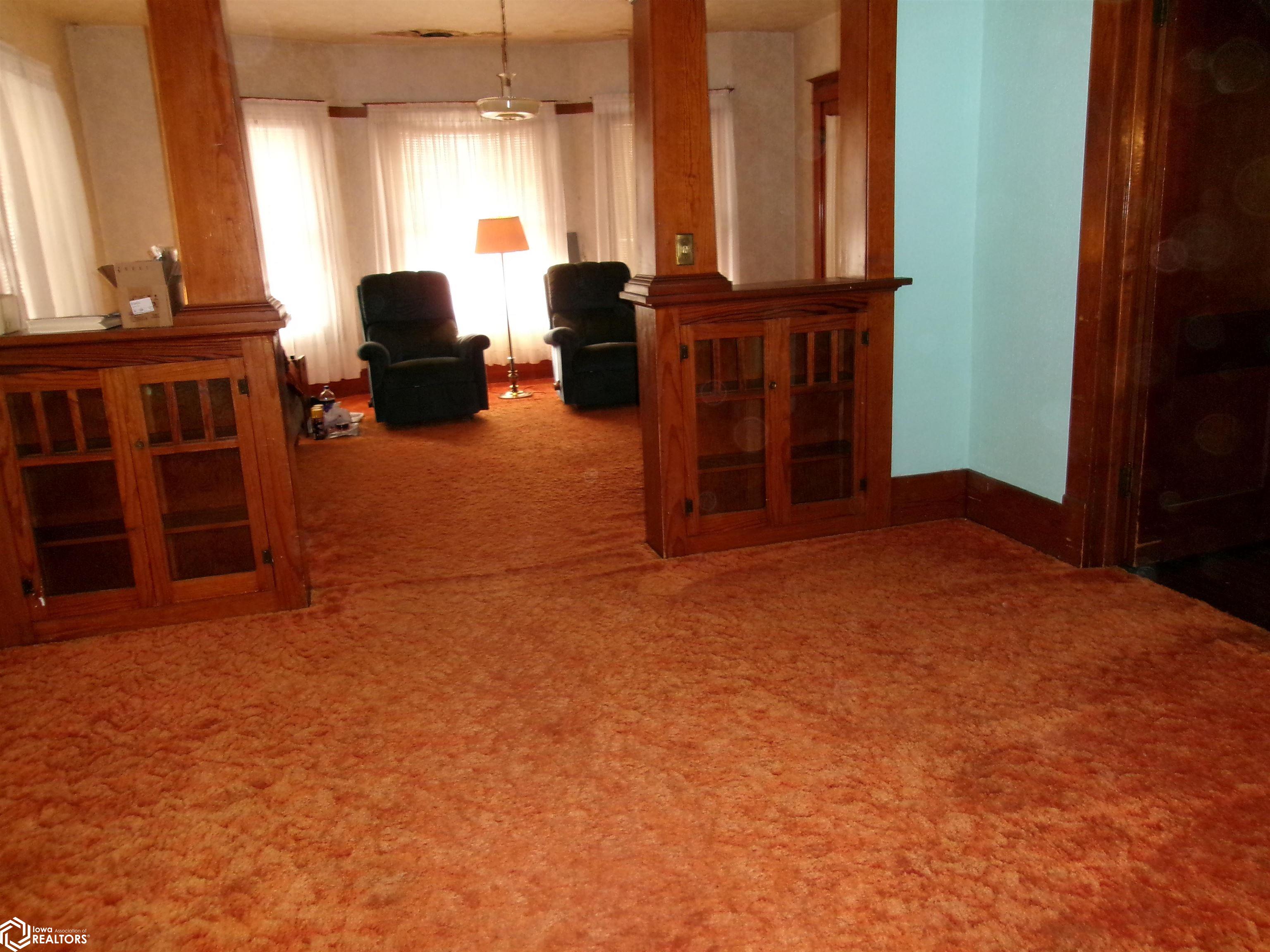 Sturdy 4 square home with a full width open front porch. Separate entry way with open stair case. Hardwood under old carpet throughout. All the wood trim is in excellent condition. Kitchen has had some renovations. Room for a small kitchen table. Between living and dining room are bookcase dividers with glass on the dining room side. Also a window seat in dining room. 1 main floor bedroom and 3/4 tub bath. 4 upstairs bedrooms with hardwood under carpets. Upstairs bath is missing the sink. Hallway features unusual 4 ft. wide linen closet with shelves and drawers. Garage is accessed through the basement. Newer Rheem furnace. 1 wall has been redone. Enclosed back porch only accessed from inside is great storage or pantry.
