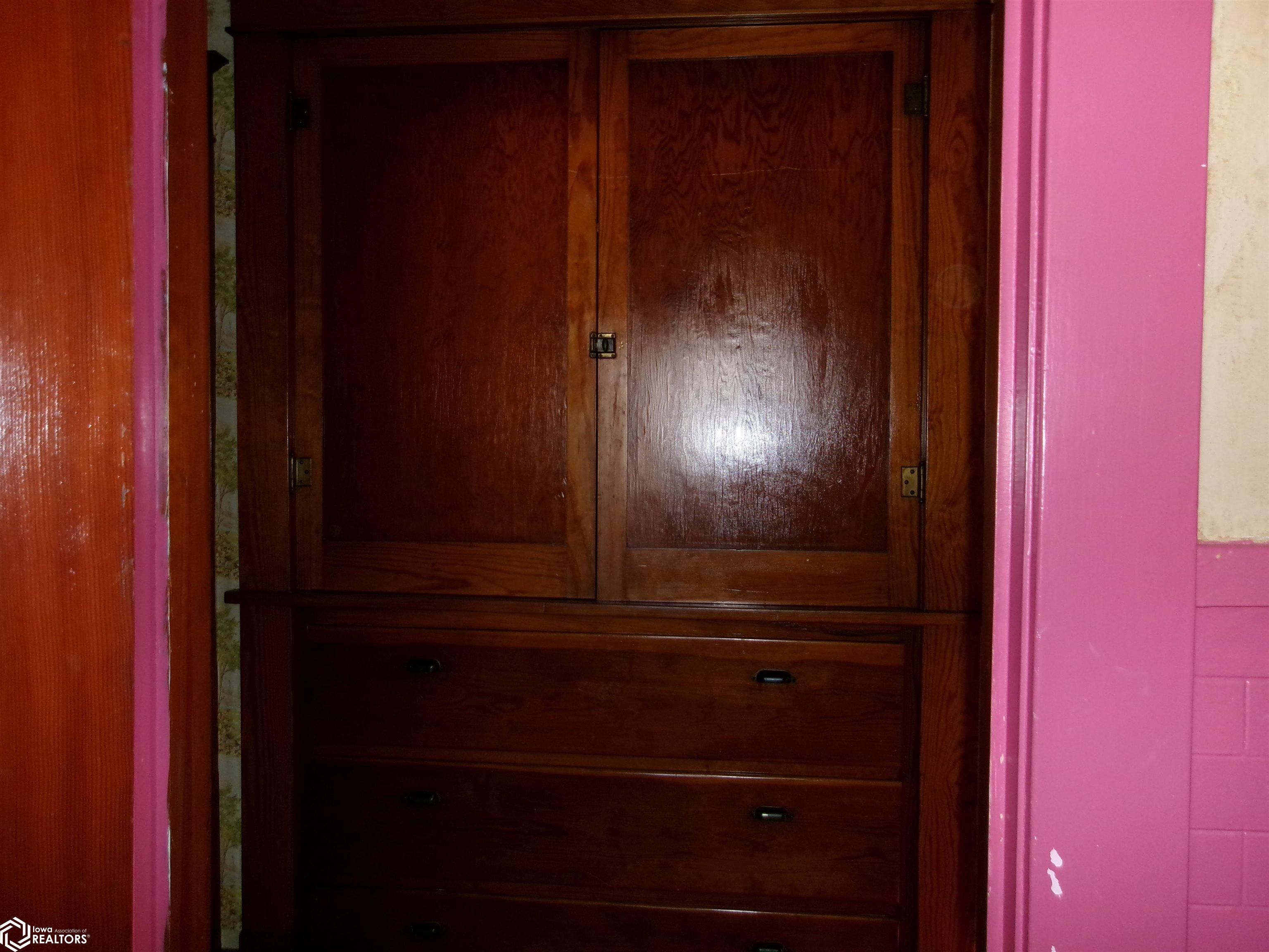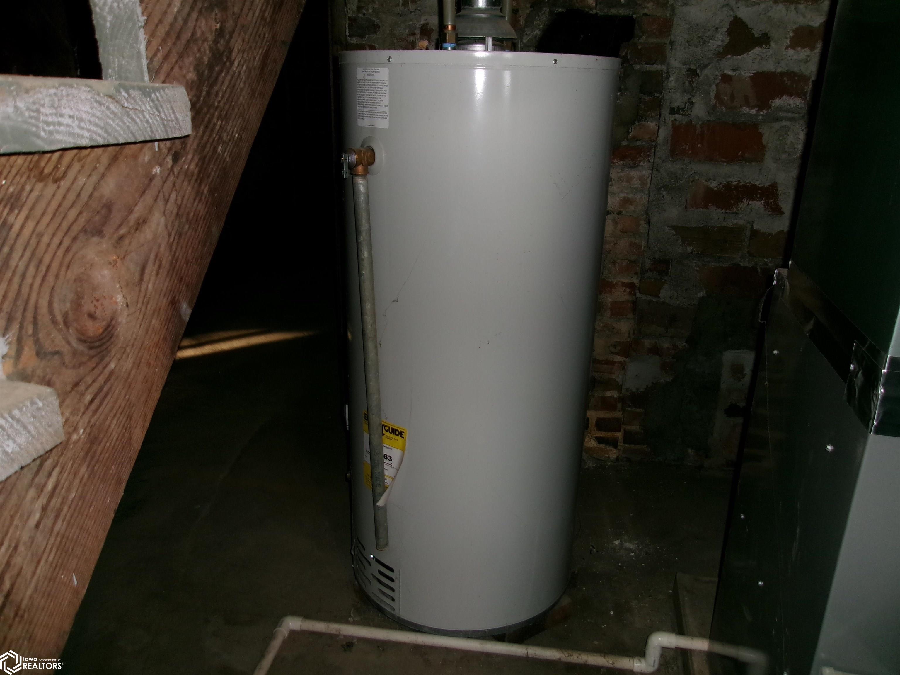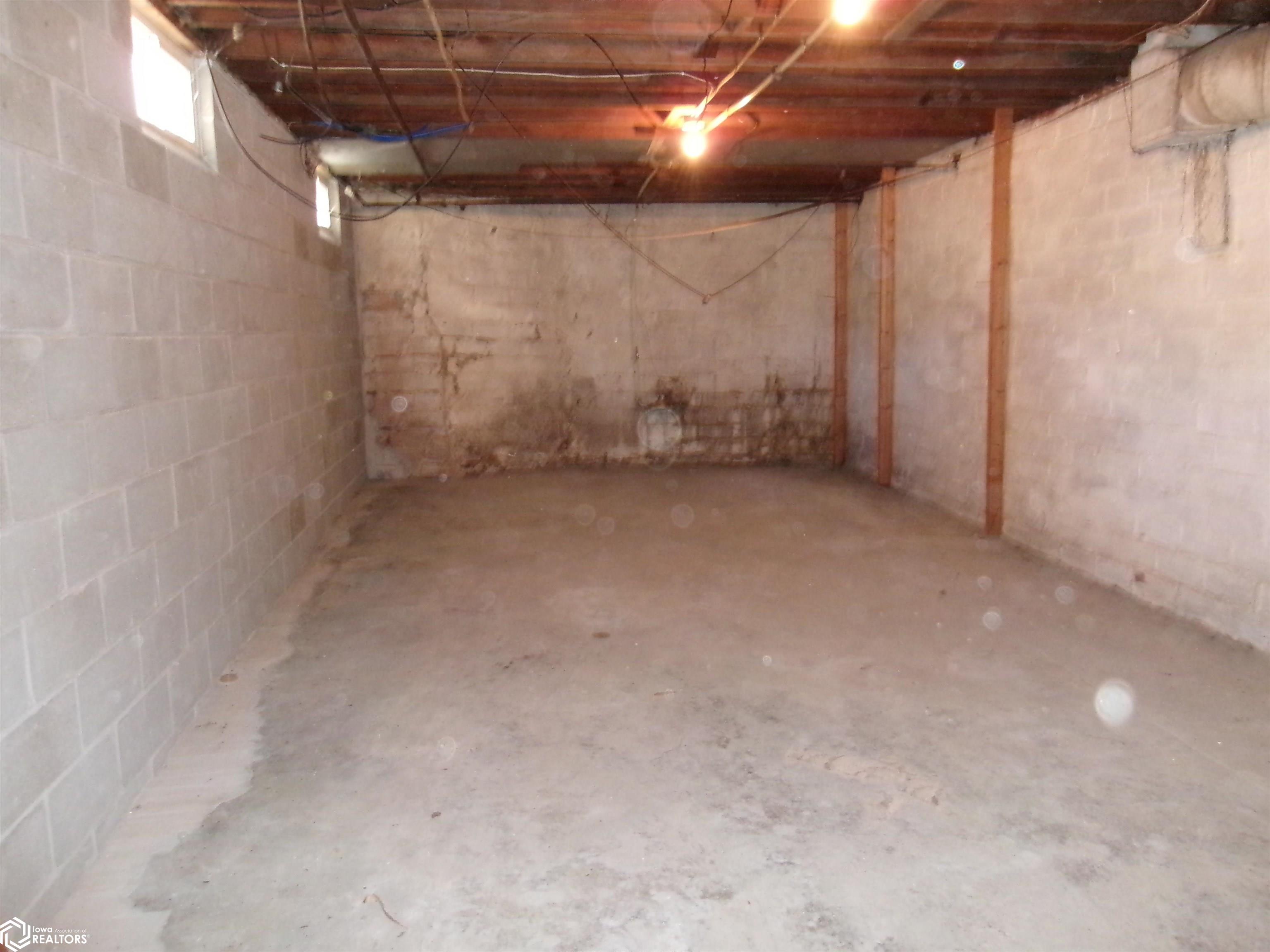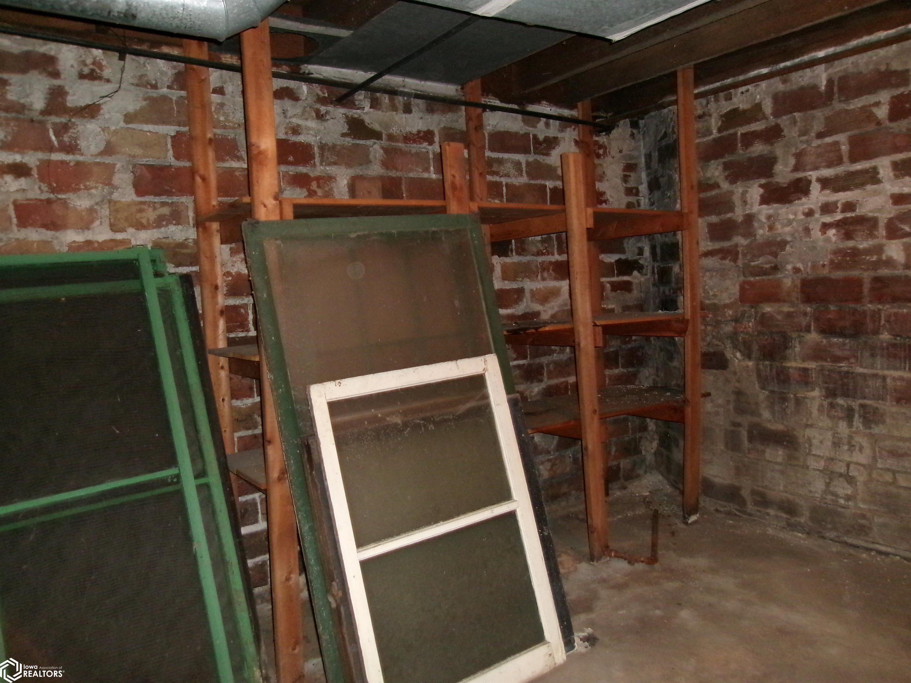 Sturdy 4 square home with a full width open front porch. Separate entry way with open stair case. Hardwood under old carpet throughout. All the wood trim is in excellent condition. Kitchen has had some renovations. Room for a small kitchen table. Between living and dining room are bookcase dividers with glass on the dining room side. Also a window seat in dining room. 1 main floor bedroom and 3/4 tub bath. 4 upstairs bedrooms with hardwood under carpets. Upstairs bath is missing the sink. Hallway features unusual 4 ft. wide linen closet with shelves and drawers. Garage is accessed through the basement. Newer Rheem furnace. 1 wall has been redone. Enclosed back porch only accessed from inside is great storage or pantry.