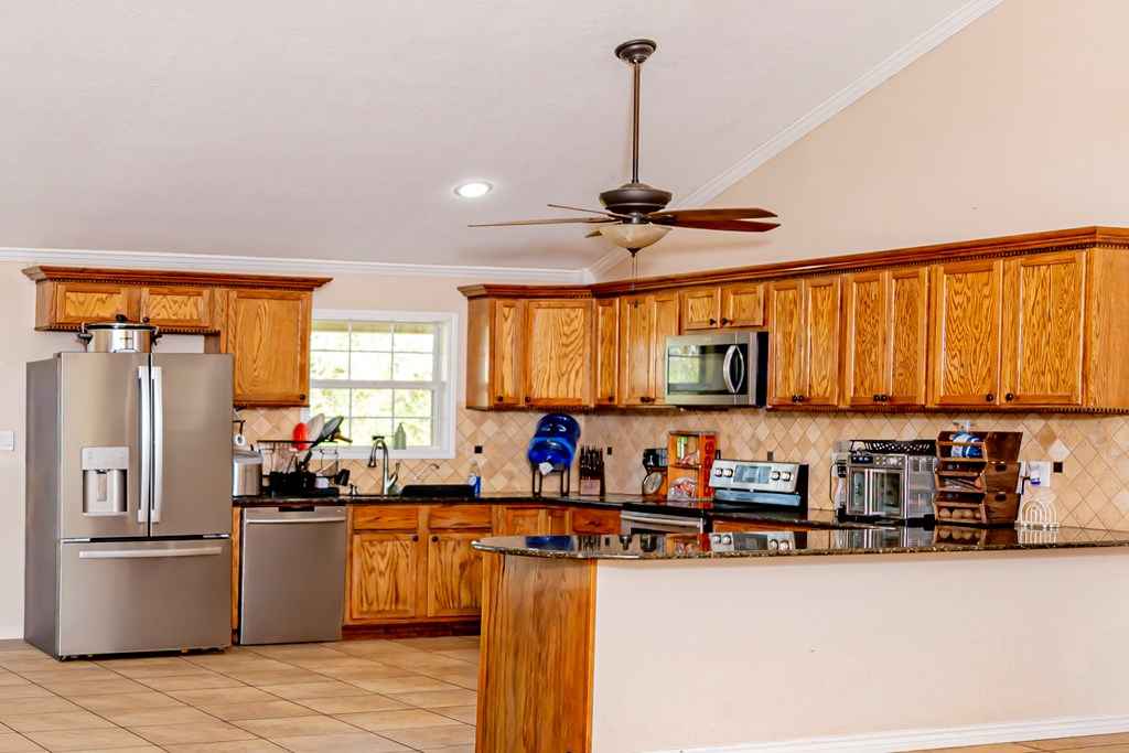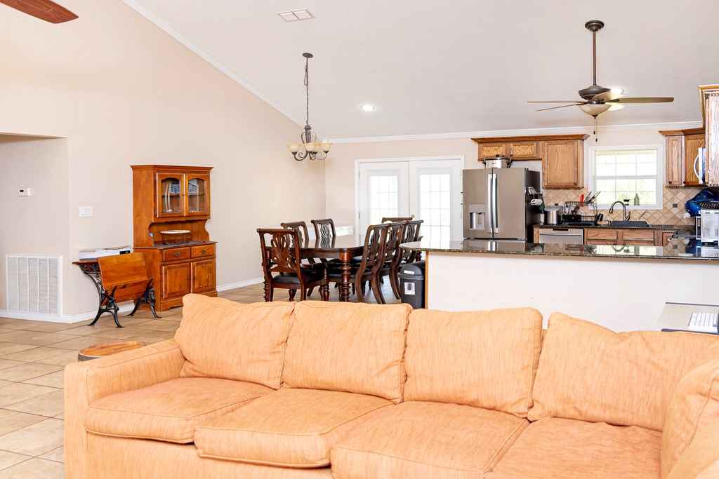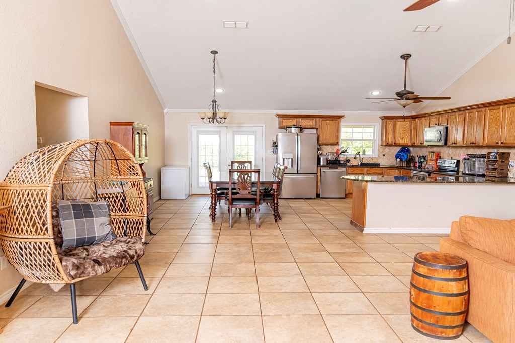 Charming farmhouse-style home set on a hill with wide covered front and back porches, perfect for enjoying quiet country mornings and sunsets. This 3-bedroom, 2.5-bath home sits on 4 acres with the option to purchase an additional 10 acres. Inside, an open-concept living room, dining, and kitchen area features a soaring cathedral ceiling and granite countertops. The home offers a cozy office with built-ins, a spacious laundry room with ample storage, and a private primary suite with a jetted soaking tub, separate tiled shower, and a walk-in closet with built-ins. All-electric with stove and dishwasher included, plus a 1-year-old roof with a 10-year warranty and a Generac natural gas generator. Two-car garage with adjacent workshopideal for a homestead, hobby farm, or country lifestyle.