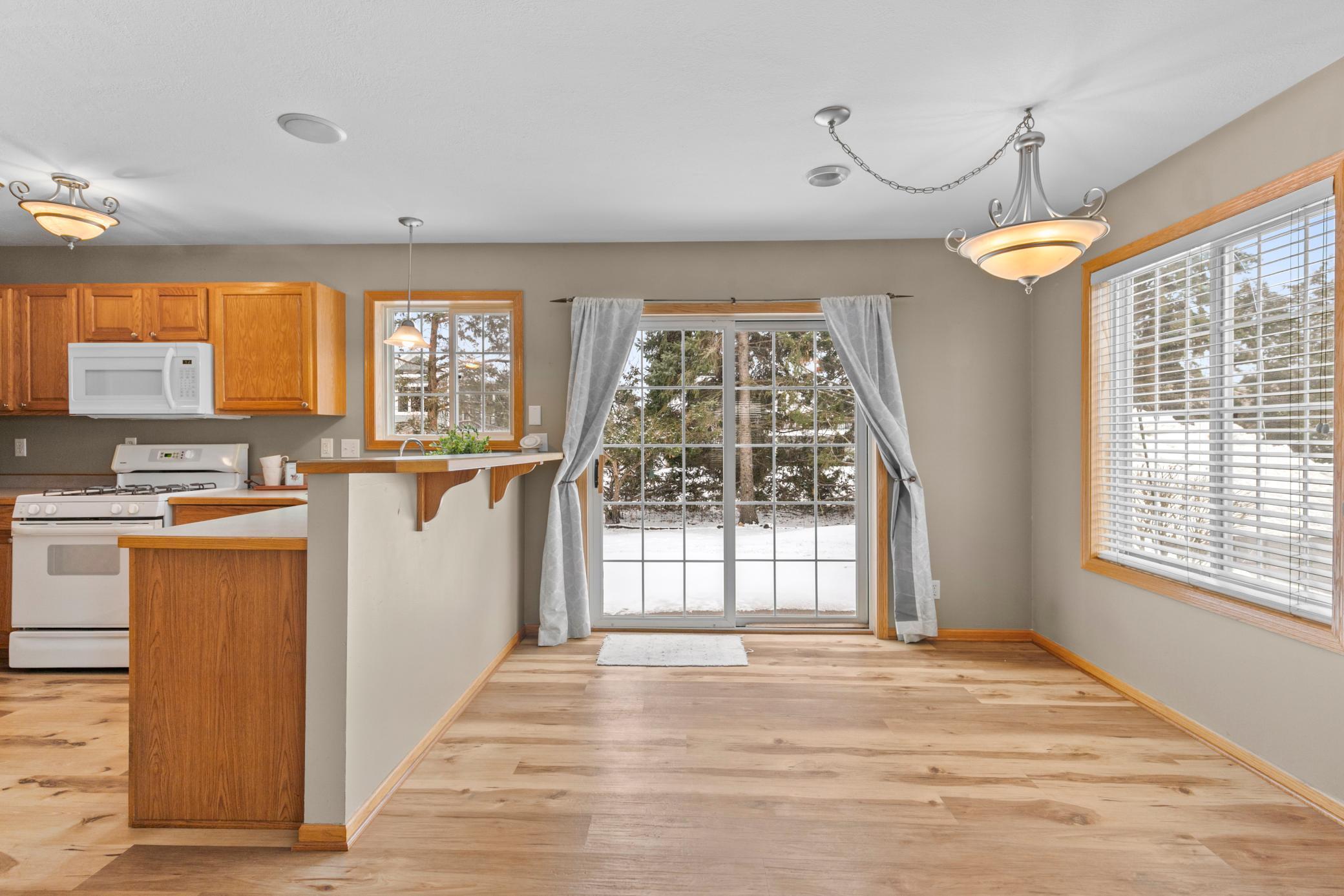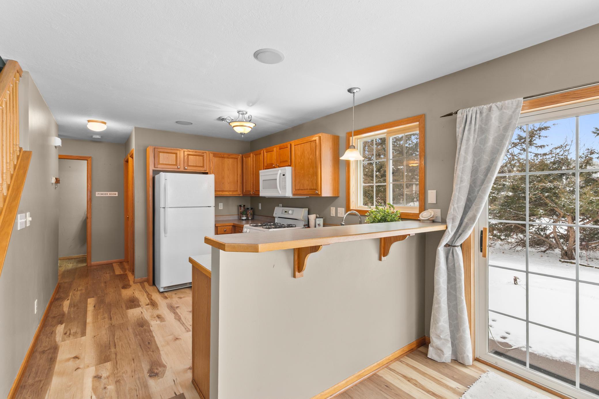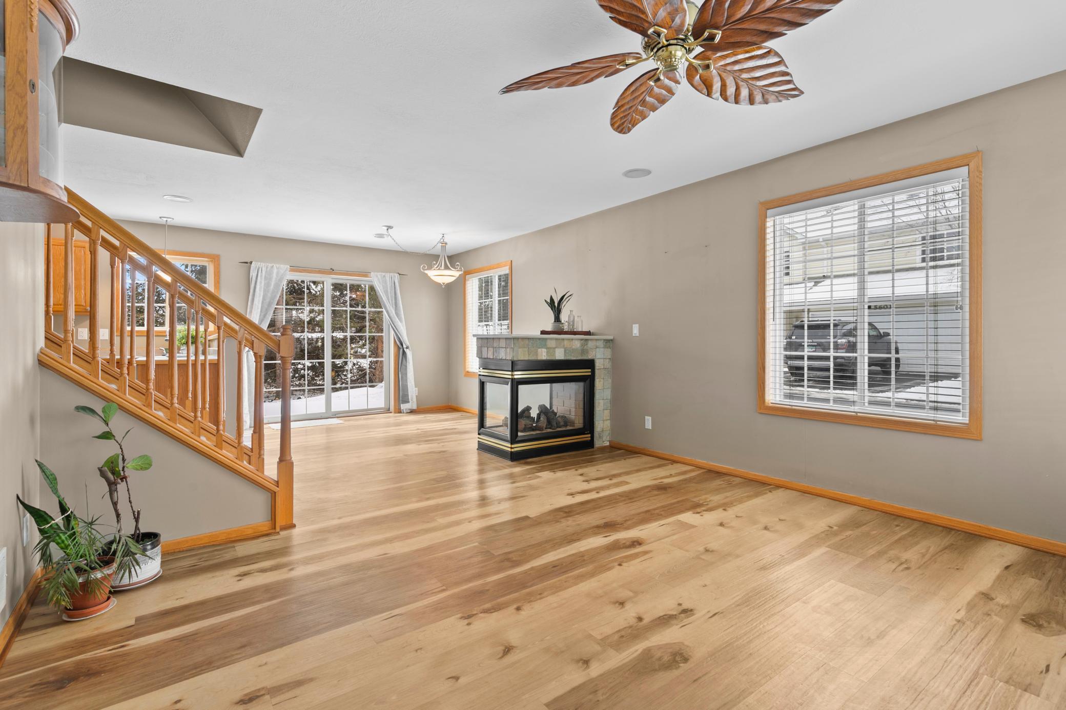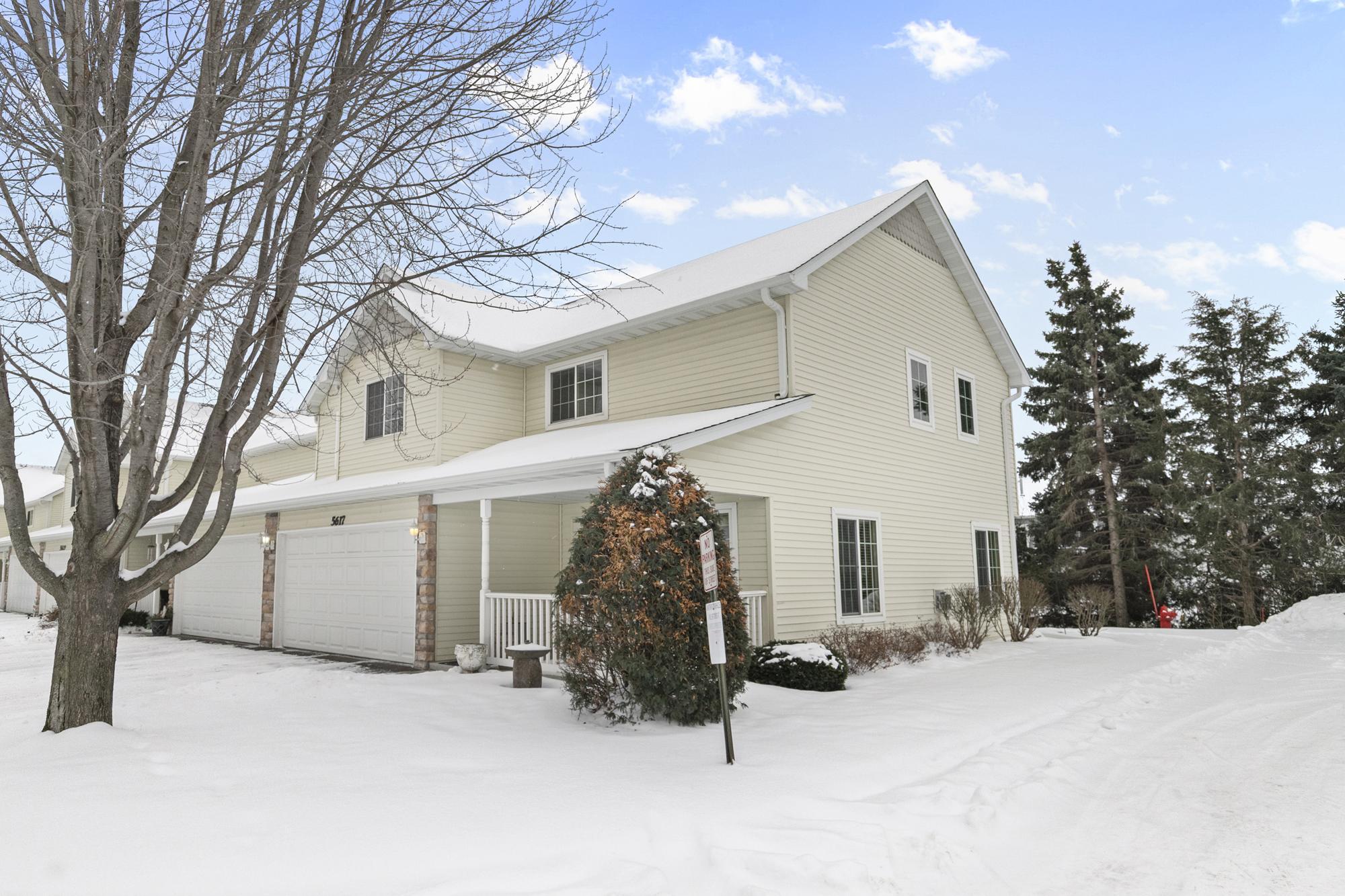 Welcome to this bright and inviting 3 bedroom, 3 bathroom corner unit townhome located in Hugo. The main level features updated laminate flooring and a three sided fireplace that adds warmth and charm to the open layout. The large upper level laundry room provides convenience and additional storage.The primary bedroom includes a walk in closet, and 3/4 bath and the additional bedrooms offer comfortable space for guests, an office, or hobbies. As a corner unit, the home enjoys abundant natural light from windows on three sides and a beautiful backyard setting.Outdoor features include a covered front porch and a patio off the back of the home. A two car garage completes this well maintained property.
