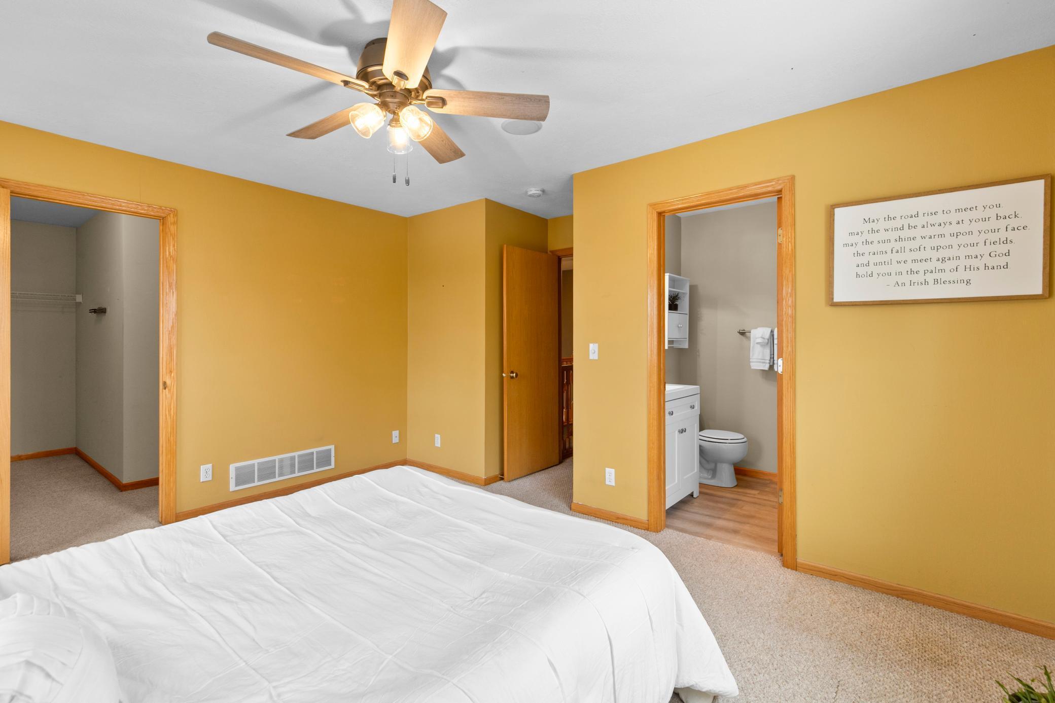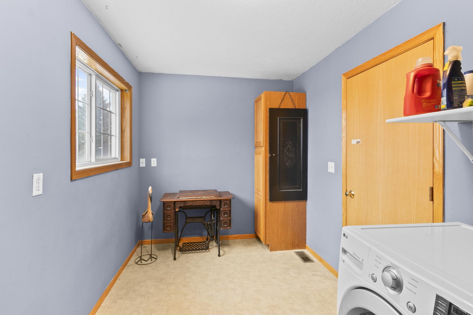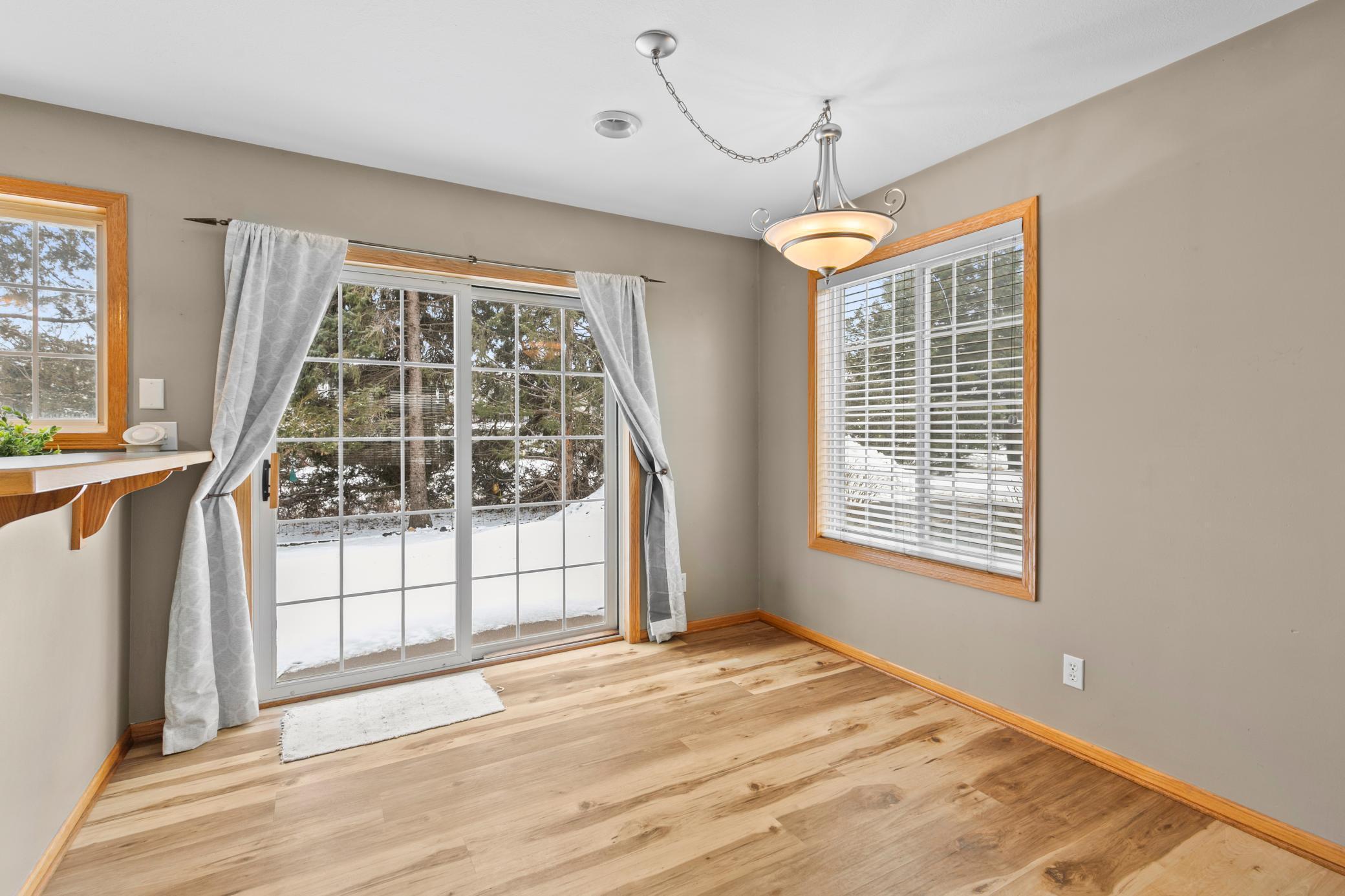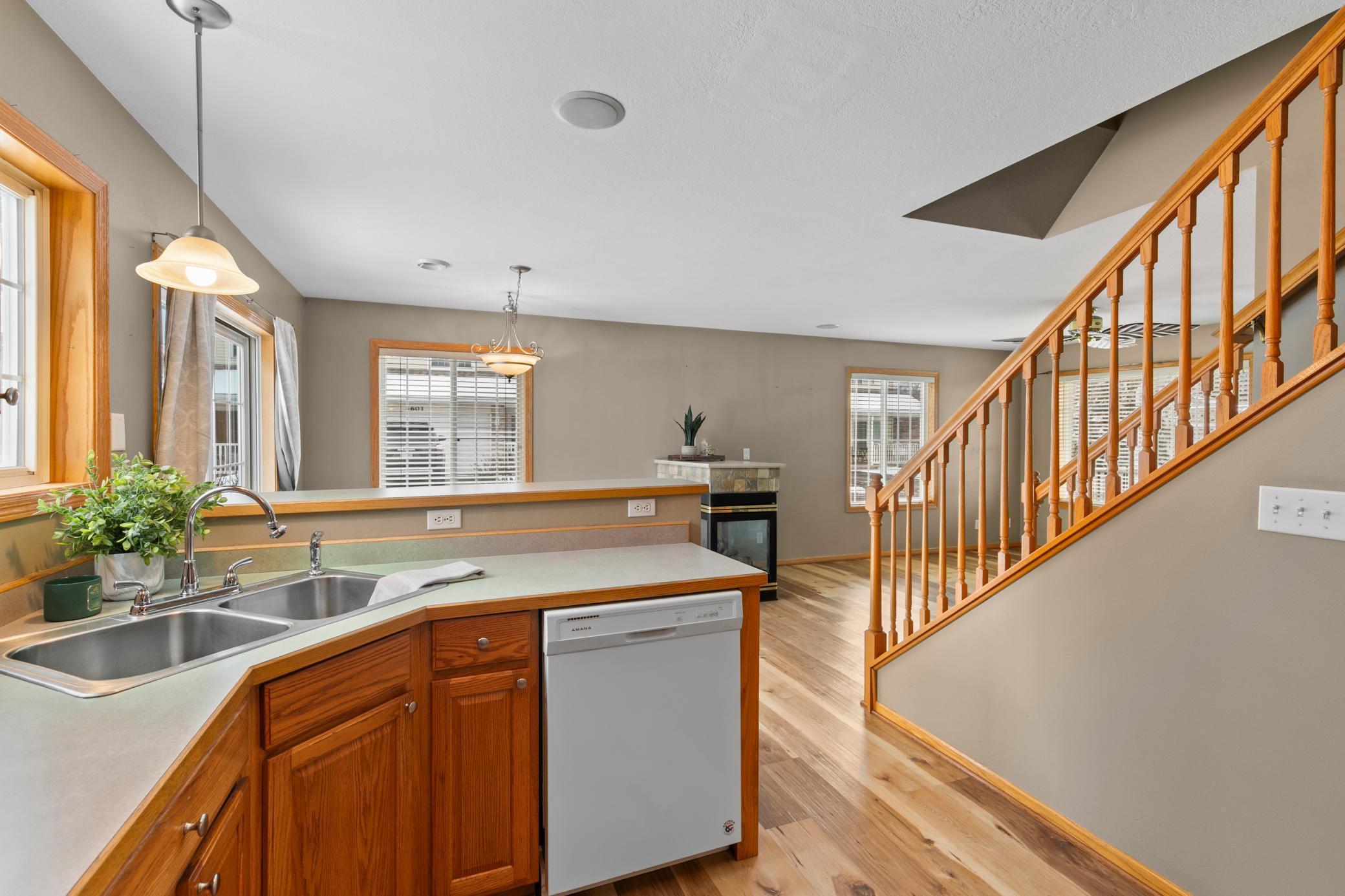Welcome to this bright and inviting 3 bedroom, 3 bathroom corner unit townhome located in Hugo. The main level features updated laminate flooring and a three sided fireplace that adds warmth and charm to the open layout. The large upper level laundry room provides convenience and additional storage.The primary bedroom includes a walk in closet, and 3/4 bath and the additional bedrooms offer comfortable space for guests, an office, or hobbies. As a corner unit, the home enjoys abundant natural light from windows on three sides and a beautiful backyard setting.Outdoor features include a covered front porch and a patio off the back of the home. A two car garage completes this well maintained property.