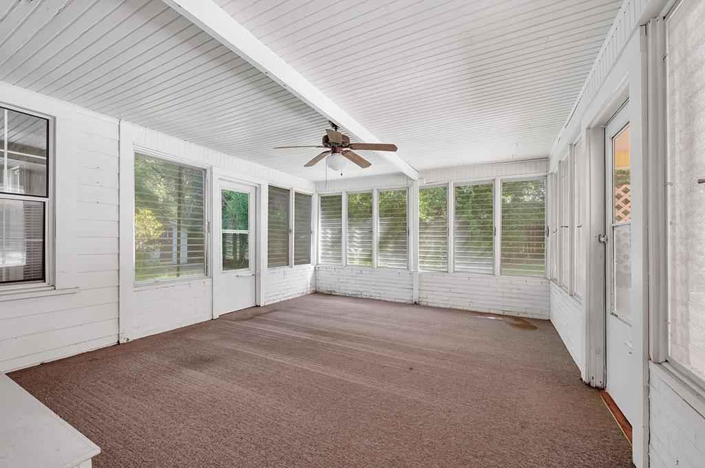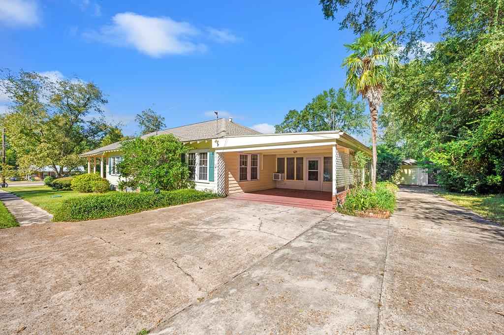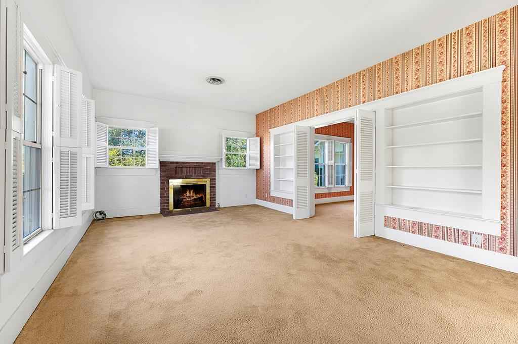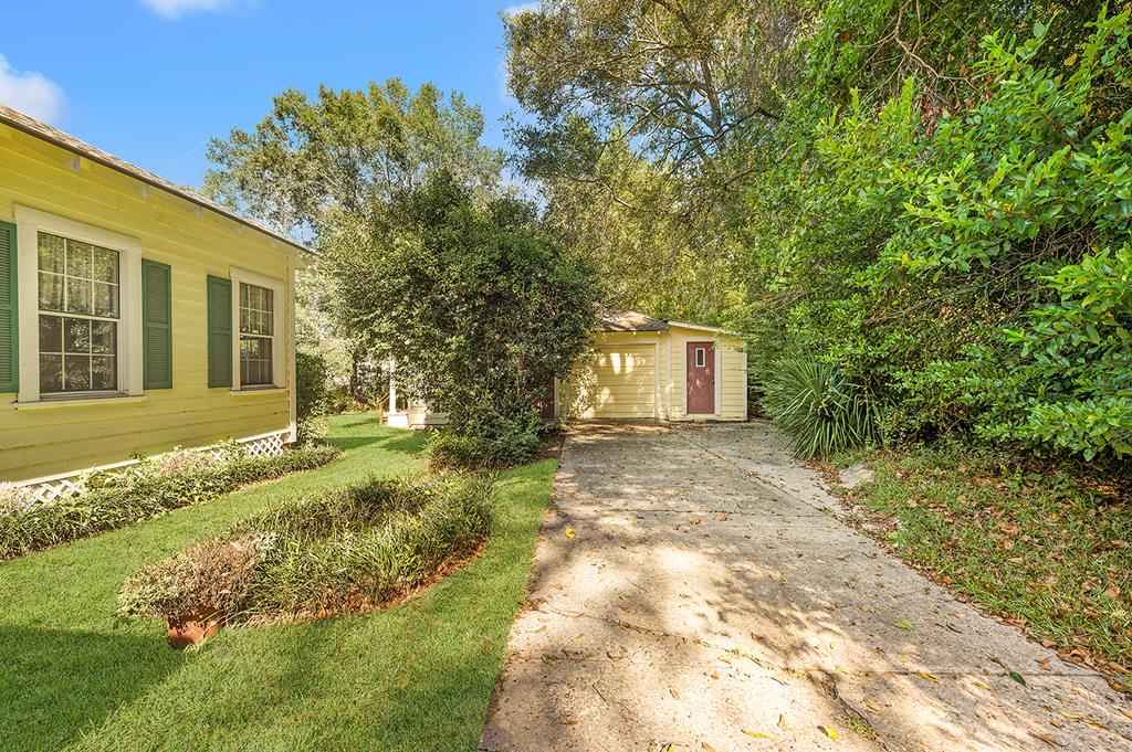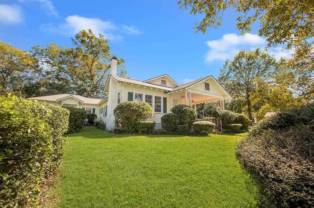 Step back in time with this charming 1940's home offering over 3,000 sq. ft. of character and comfort. Nestled on a half-acre corner lot shaded by mature trees, this 4-bedroom, 3-bath residence features 9' ceilings, a formal living and dining room, and multiple sitting areas perfect for entertaining. Built-ins throughout the home provide abundant storage, while a cozy sunroom and side porch invite peaceful relaxation. A unique side-yard layout offers private access to two bedrooms and a serene sitting area. The detached garage/carriage house includes a large storage room and a private yard surrounded by blooming azaleas. Recent updates include a new roof (5 yrs), windows, alarm system and HVAC blending classic charm with modern comfort. NOTE: The original hardwood flooring is under all of the carpeted areas with the exception of the wing off the utility room.