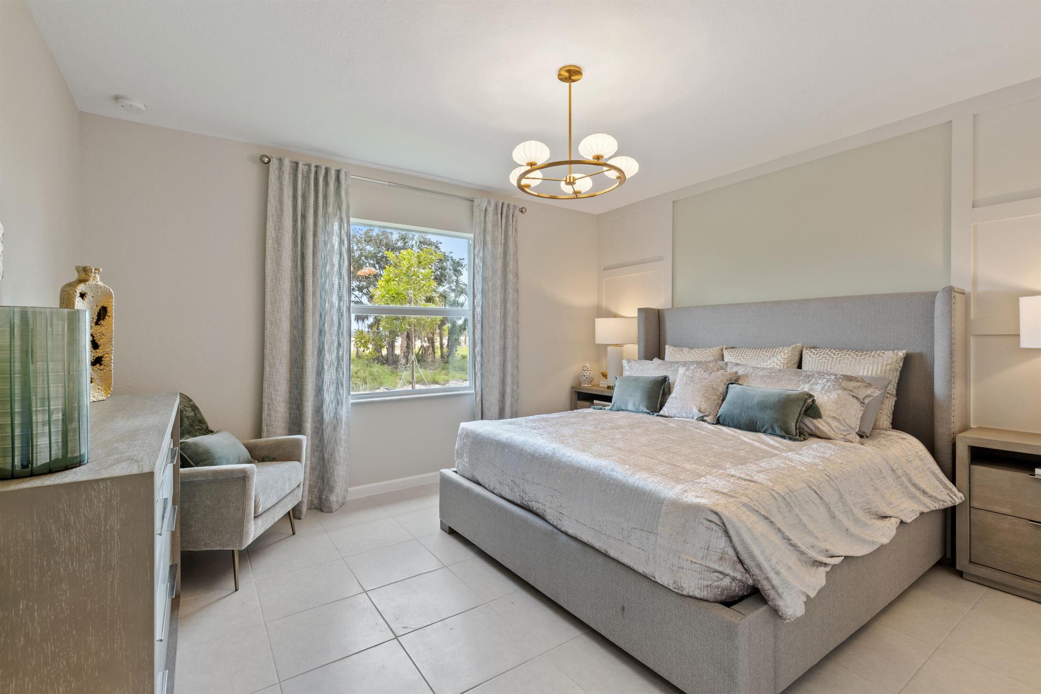 This single-story home features a smart layout that prioritizes ease of living. Down by the foyer is an open-plan design shared by the kitchen with a center island, dining room and family room, which extends out to the covered lanai. On the opposite side of the home are two bedrooms to provide a restful retreat and a den well-suited for as a private office. At the front is a versatile two-car garage.Photos are for illustrative purposes only.