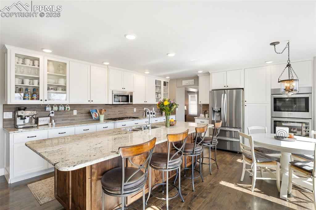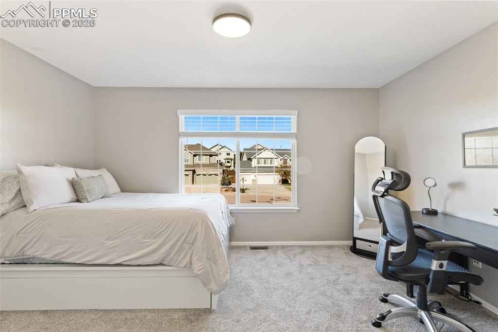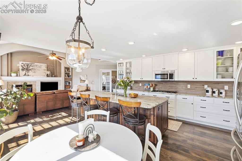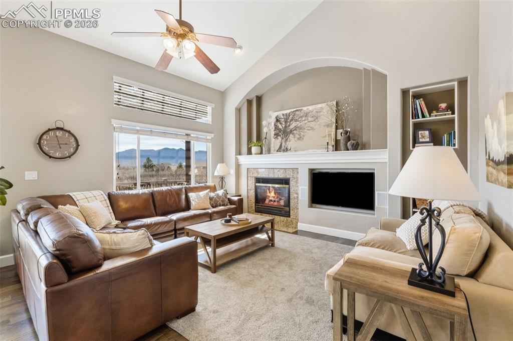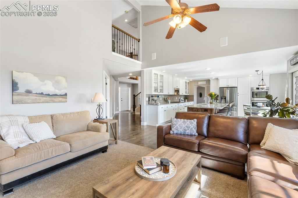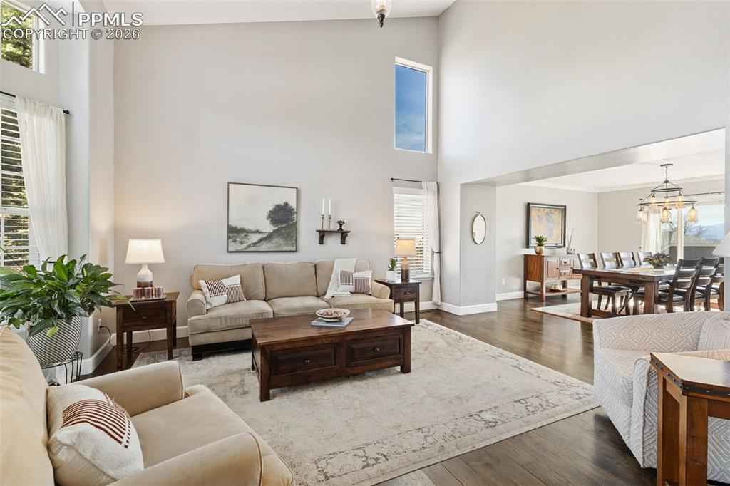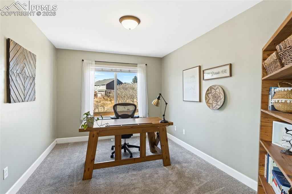 Tucked in a quiet cul-de-sac and bordered by open space on two sides, this beautifully maintained home offers a rare combination of privacy, views, and long-term valuex2014;an opportunity that is increasingly hard to find at this price point. Positioned to capture unobstructed views of Pikes Peak, the home is filled with natural light thanks to expansive windows and soaring vaulted ceilings that create a bright, open feel throughout the main level. A thoughtful layout balances formal and casual living, featuring a dedicated living room, formal dining space, and a main-level office ideal for todayx2019;s lifestyle. The recently updated kitchen anchors the home, flowing seamlessly into a casual dining area and the impressive two-story family room. Here, walls of windows, a gas fireplace, and architectural niches create a warm yet spacious gathering space, with direct walkout access to an upgraded pergola covered composite deck perfect for enjoying Coloradox2019;s year-round lifestyle and mountain views. Upstairs, the spacious primary suite offers a private retreat with an updated 4-piece bath, while three additional bedrooms and a full bath provide flexibility for family or guests. The finished walkout basement expands the homex2019;s functionality with two additional bedrooms and a full bath offering ideal guest or multi-generational living. Additional highlights include substantial storage space, an oversized 3-car garage, dual A/C units for year-round comfort, and mature landscaping that enhances both privacy and curb appeal. With open space on two sides, abundant natural light, mountain views, and a highly sought-after District 20 location, this property stands out as a compelling opportunity.