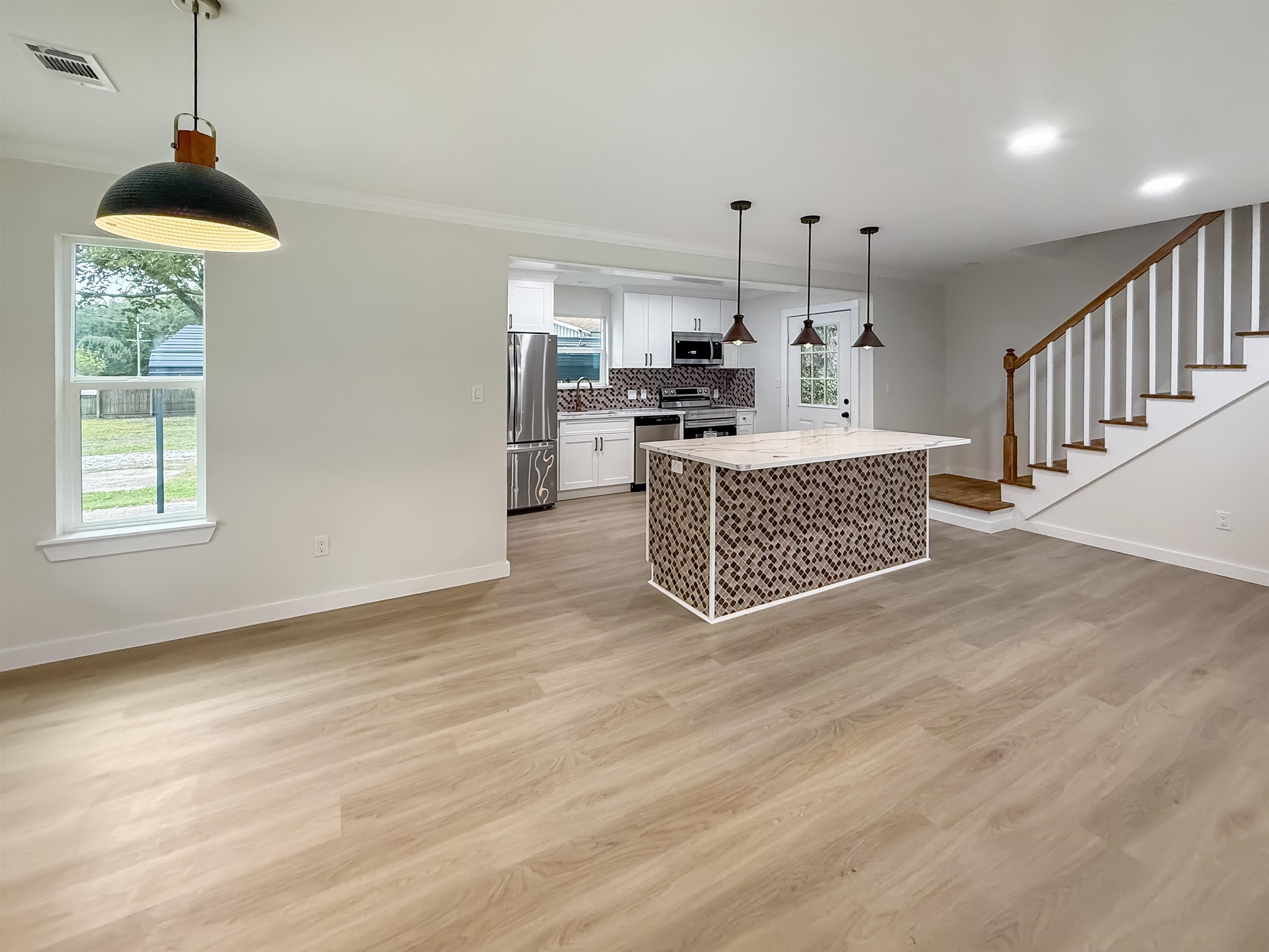 Welcome to 6371 Terrell Street in Grovesa beautifully remodeled two-story home offering over 2,000 sq. ft. of modern comfort. With five bedrooms and three bathrooms, this spacious layout is perfect for both privacy and gathering. The stunning kitchen features a large island, new appliances, and sleek finishes, creating the ideal space for cooking and entertaining. Enjoy central A/C, ceiling fans, and a tankless water heater for year-round comfort and efficiency. The home also includes an inside utility room with washer and dryer connections. Every detail, from the fresh design to the functional layout, makes this home inviting, stylish, and ready for move-in.