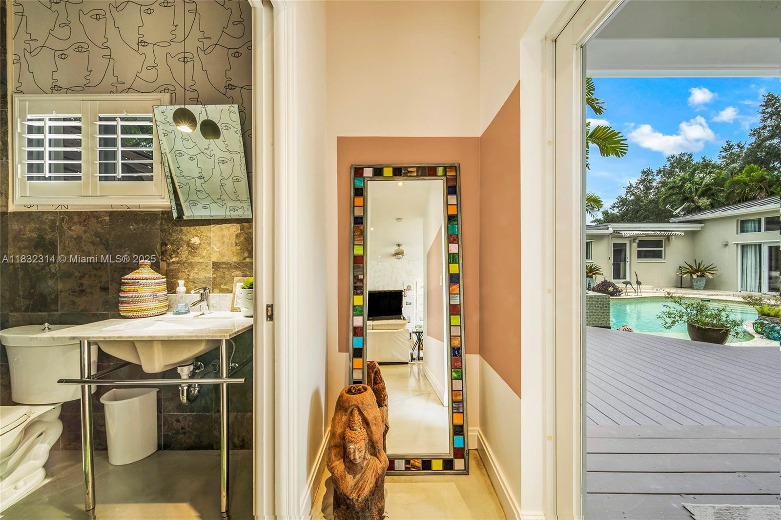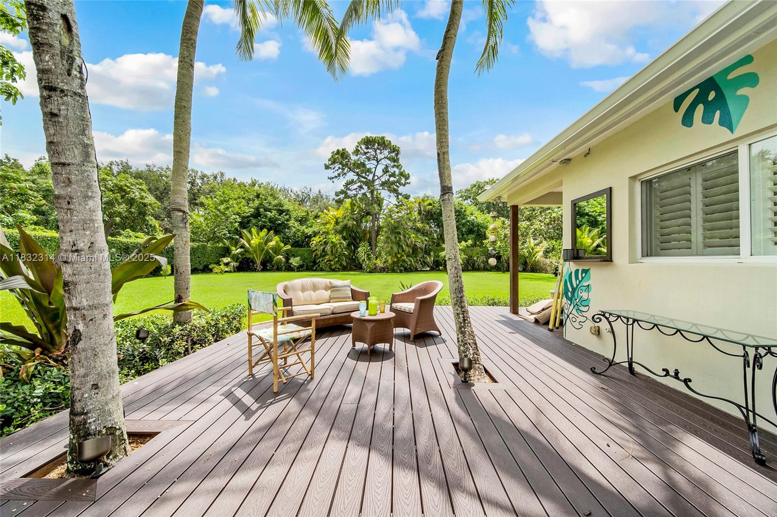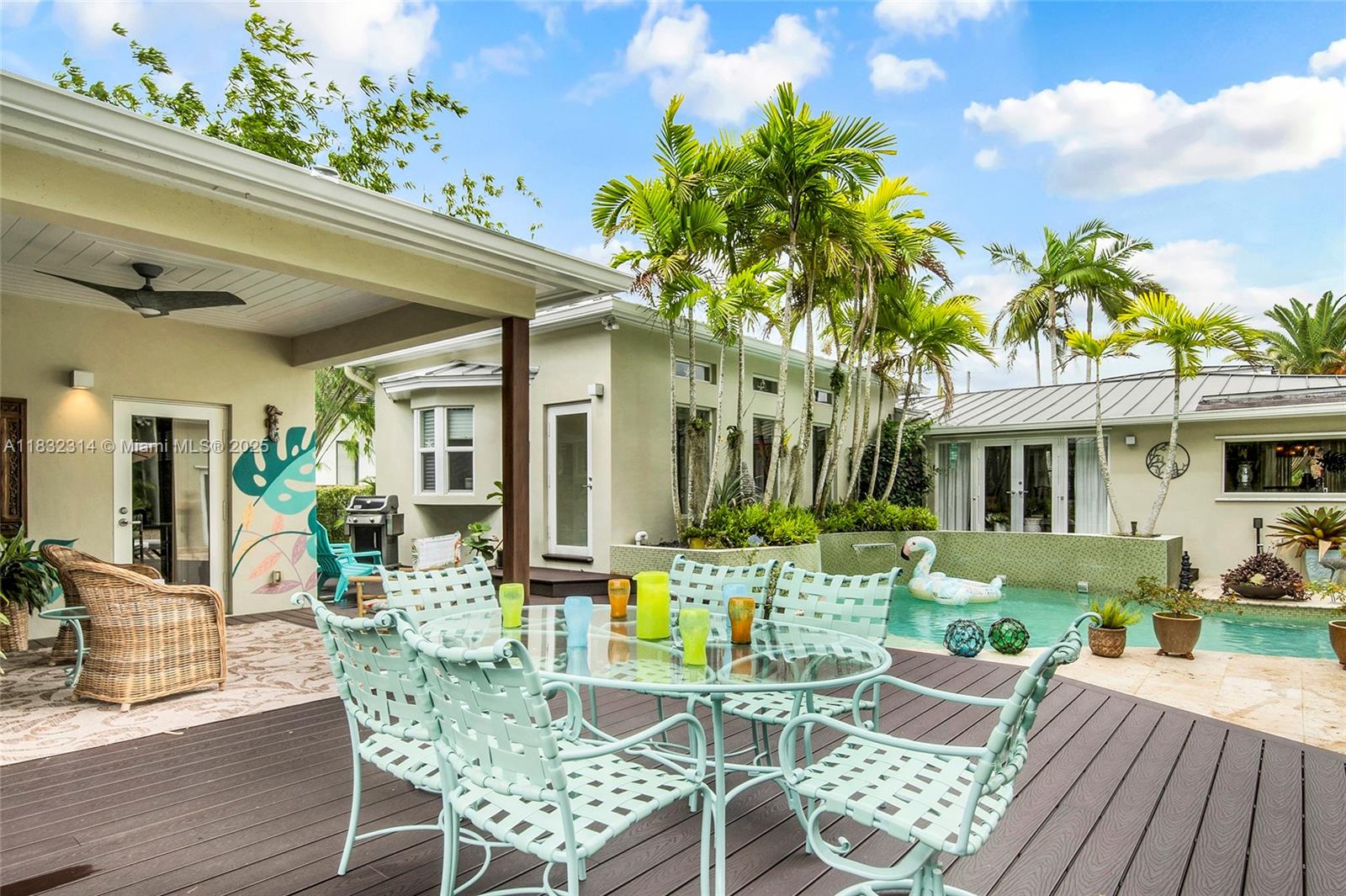 Discover your own private retreat in this tropical, resort-style property set on a builder's acre with lush, mature landscaping. The sunlit main house offers open-concept living, 4 bedrooms, and 3.5 baths, including a stylish primary suite tucked away in its own wing for ultimate privacy. Across the lagoon-style pool and expansive deck, a separate pool house provides flexible space for guests, an in-law suite, or a home office. Outdoor living shines with a covered terrace, outdoor shower, and generous backyard - perfect for soccer, gatherings, or enjoying fresh tropical fruit from your own trees. Additional features include an EV charger, storage shed, ample gated parking, and top-rated schools nearby. Offered furnished.