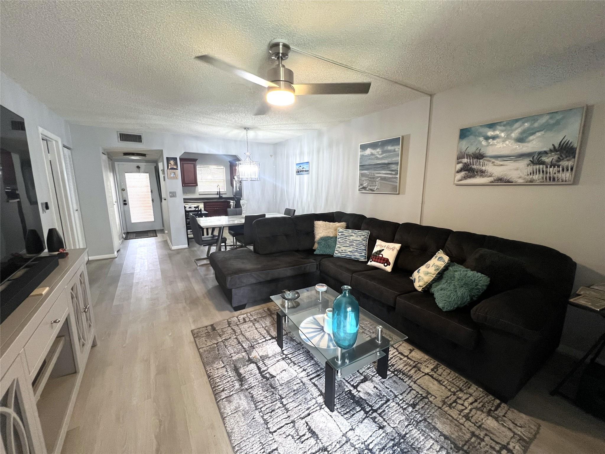 MUST SEE! Beautifully maintained waterfront 1B/1 and a half bathroom, ground floor unit with enclosed patio overlooking the water. Lovely, updated kitchen and wood laminate flooring throughout the living and bedroom area. Property features large double kitchen pantry, linen closet, large walk-in closet in the master bedroom, handicap equipped master shower and laundry Room a few doors down. This is a 55+ beautifully maintained community with amenities such as a recently renovated clubhouse equipped with a full kitchen, 3 heated pools, gym, spa, sauna, community room, tennis, covered picnic/barbeque area, bocce ball court, etc. Community is convenient to shopping, restaurants and grocery stores. Furniture is included in the sale.
