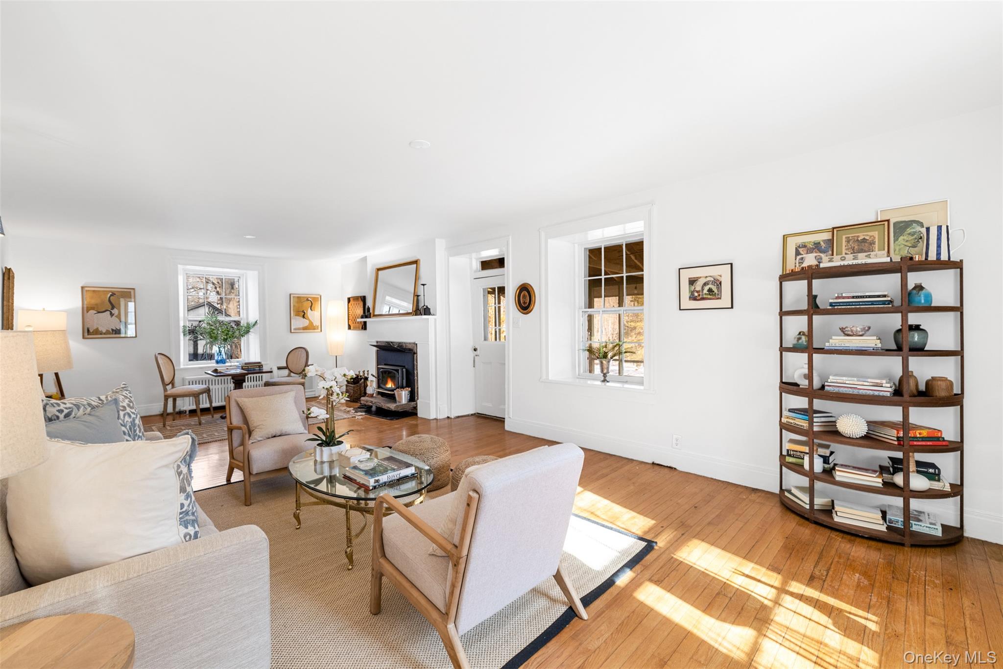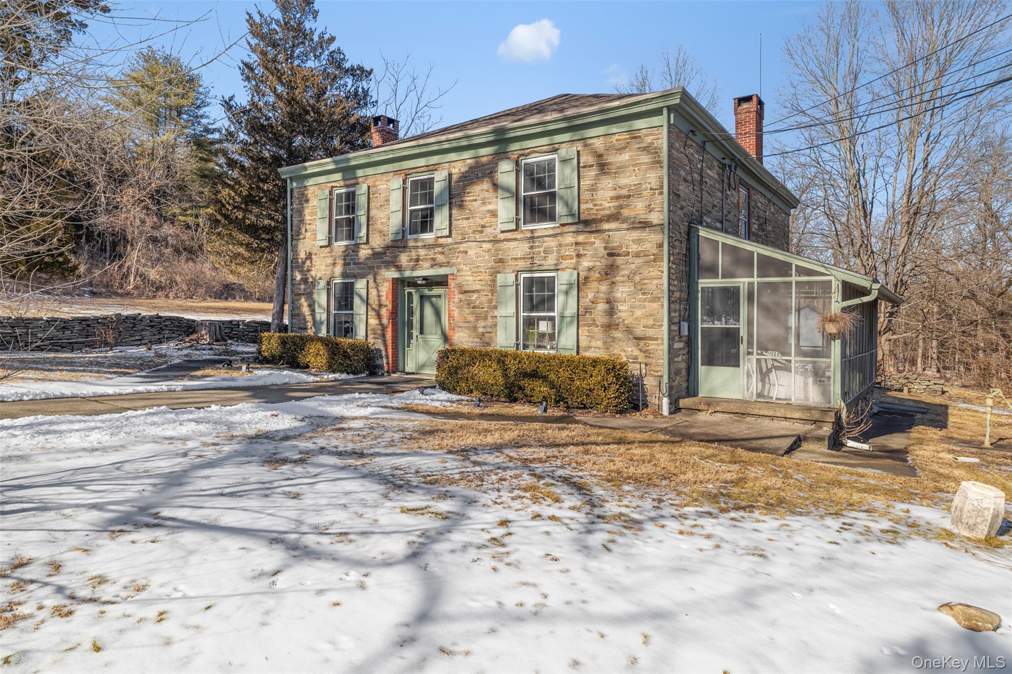 Welcome to Stonewall Farm, a rare 20-acre retreat featuring a charming 19th Century stone house and outbuilding less than two hours from Manhattan and minutes from the New Paltz village center. Privately set at the end of a long driveway flanked on each side by its namesake stacked-bluestone walls, the property features both meadows and woods plus its signature foursquare stone farm house built in 1820 by William Brooks and listed on Ulster County's historic places registry. The house features four bedrooms and two baths (one full, one half), plus a 30-foot living room with fireplace opening to an end-to-end screened side porch overlooking a meadow. The dining room also has a fireplace, and the renovated kitchen features custom dovetail jointed cabinetry, a gourmet 48-inch range with hood and pot filler, and other high-end appliances. Upstairs are the four bedrooms, an oversized bathroom with spotless vintage tilework still in place, and a large central walk-in closet for storage. Throughout the house are classic recessed windows with stunning glass panes, hardwood floors and plenty of light. The property also includes a standalone studio building with a two-car garage plus a finished library room and office space, perfect for at-home work, overflow guests or additional storage. Recent upgrades include a whole-house Generac generator and ductless central-air and heating systems, installed in 2015. This a unique opportunity to own a remarkably private compound, minutes by car or bicycle from the Walkway Over the Hudson, MetroNorth and Amtrak train service in Poughkeepsie, and the charms of New Paltz, one of the Hudson Valley's most popular college towns.