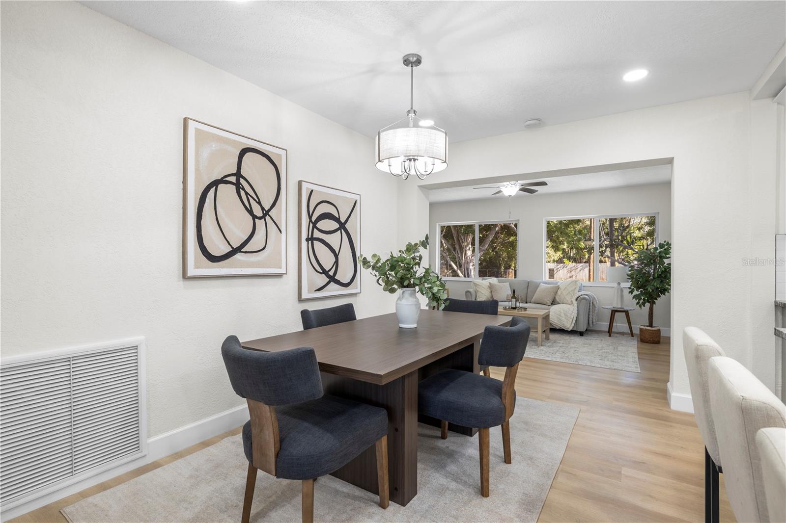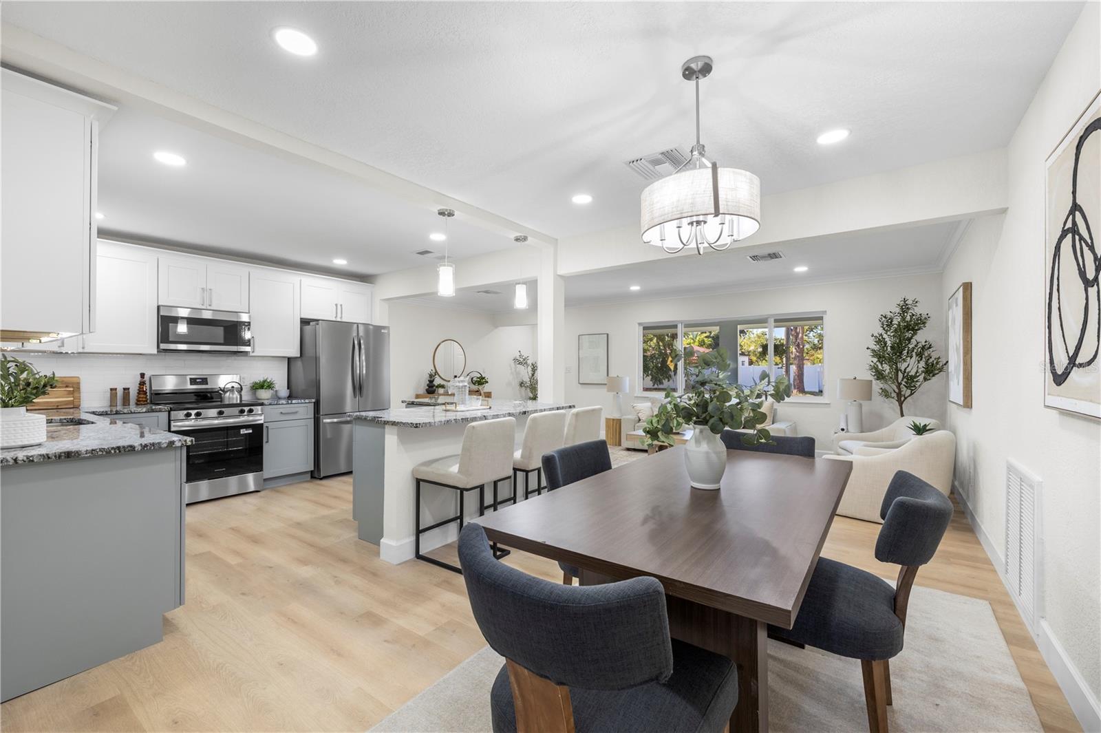 Fully renovated block construction 2 bedroom, 2 bath home with an additional flex space perfect for an office or optional bedroom in St. Pete with NO HOA. This home has undergone a comprehensive renovation with ALL major improvements already completed, including roof (2022), AC (2022), impact windows (2025), 200 amp electrical panel (2025), water heater (2025), gutters (2025), all new AC ductwork (2025), and new interior and exterior doors (2023 to 2025). Interior updates include LVP flooring (2025), interior and exterior paint (2025), recessed lighting, and ceiling fans (2025). The kitchen is completely new (2025) and features soft close cabinets, granite countertops, stainless steel appliances, and an island with a pop up outlet and phone charger. Both bathrooms are fully remodeled with modern finishes.When you walk through the front door, natural light fills the open living, kitchen, and dining areas, leading to the rear flex space with direct access to both the full 2 car garage and the covered lanai. The primary suite and secondary bedroom are conveniently located near each other, with the fully remodeled guest bathroom just steps away. The covered, fully screened in lanai overlooks the expansive backyard, offering plenty of room for outdoor activities or a future pool. Additional features include new outdoor light fixtures and an irrigation system powered by well water with Rocchio smart app control. The home did not flood and did not take on any water intrusion during the past storms.This location offers quick access to I 275, Bay Vista Park with a public boat ramp, Maximo Park, Lake Vista Park, shopping, dining, and daily conveniences. Publix is just 7 minutes away, Downtown St. Petersburg is approximately 10 minutes away, and the beaches are about 15 minutes from the property. Showings available every day. Book your tour today.