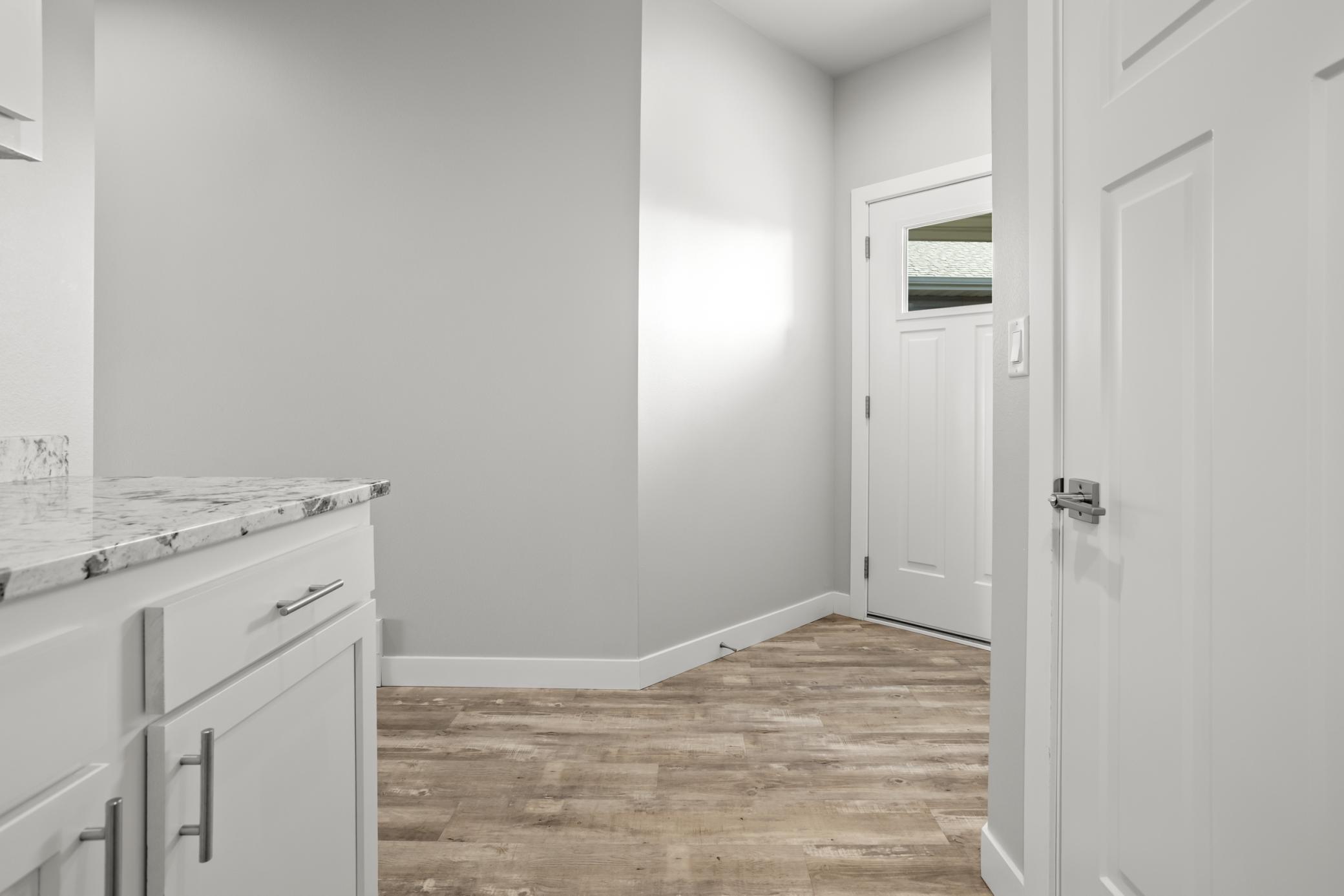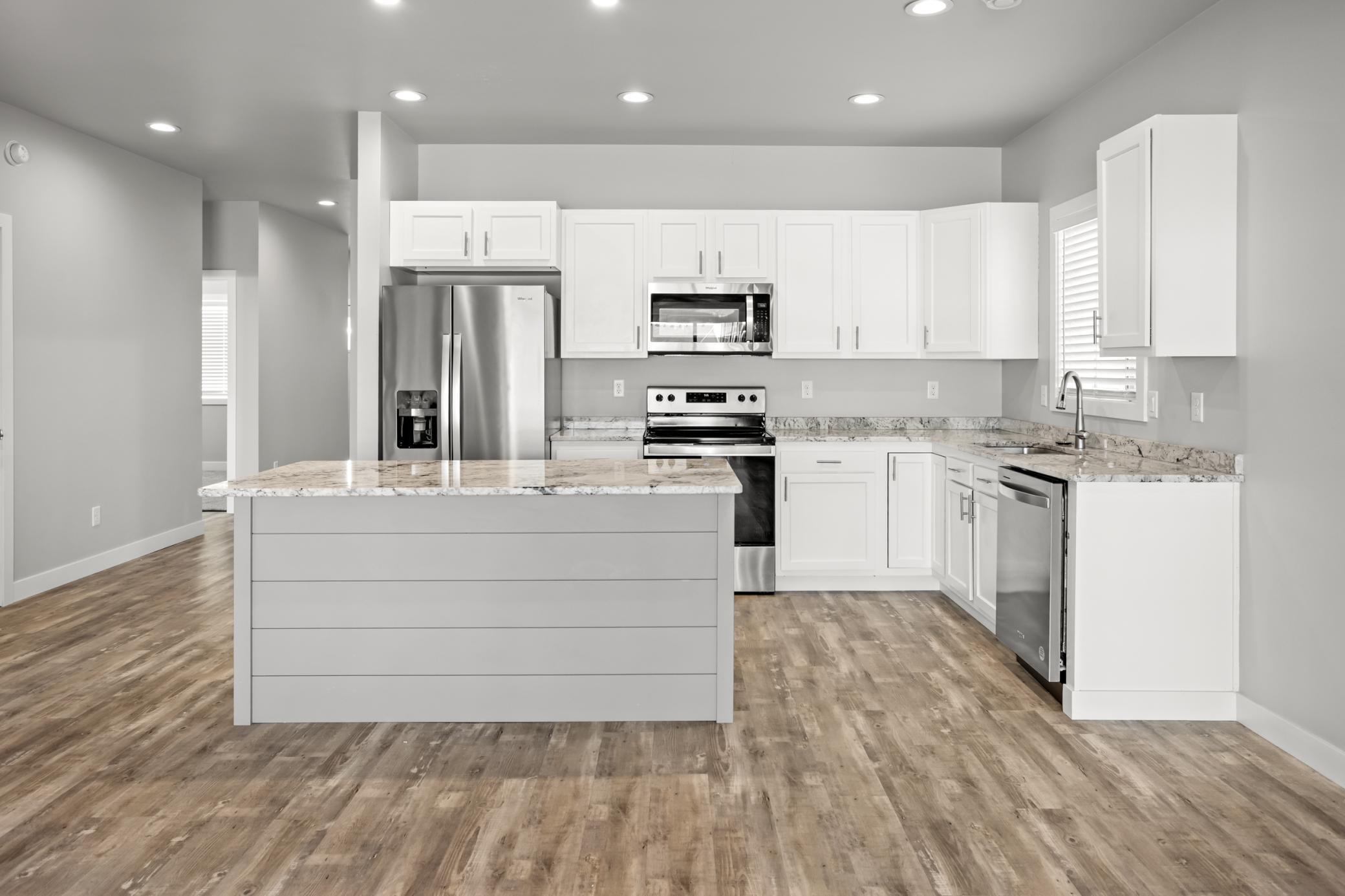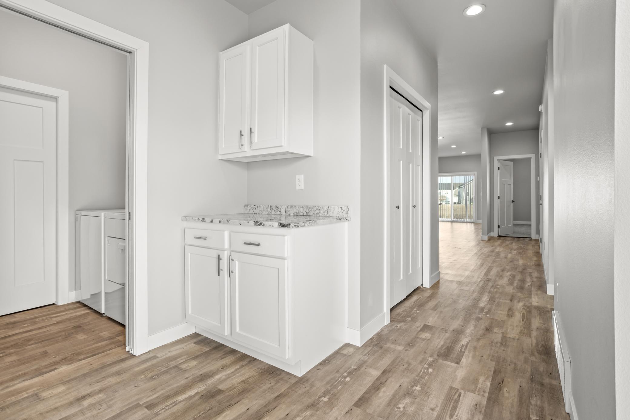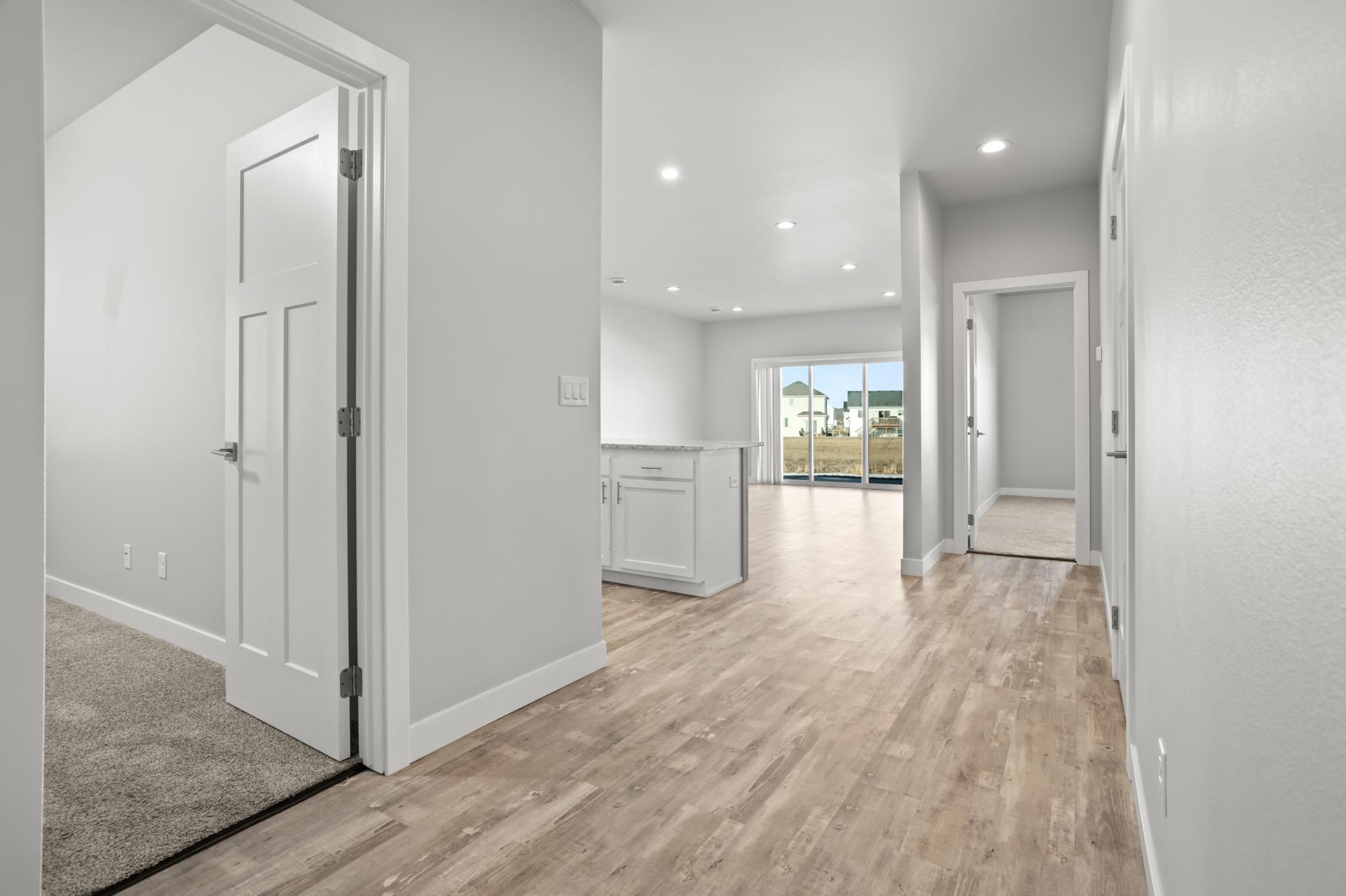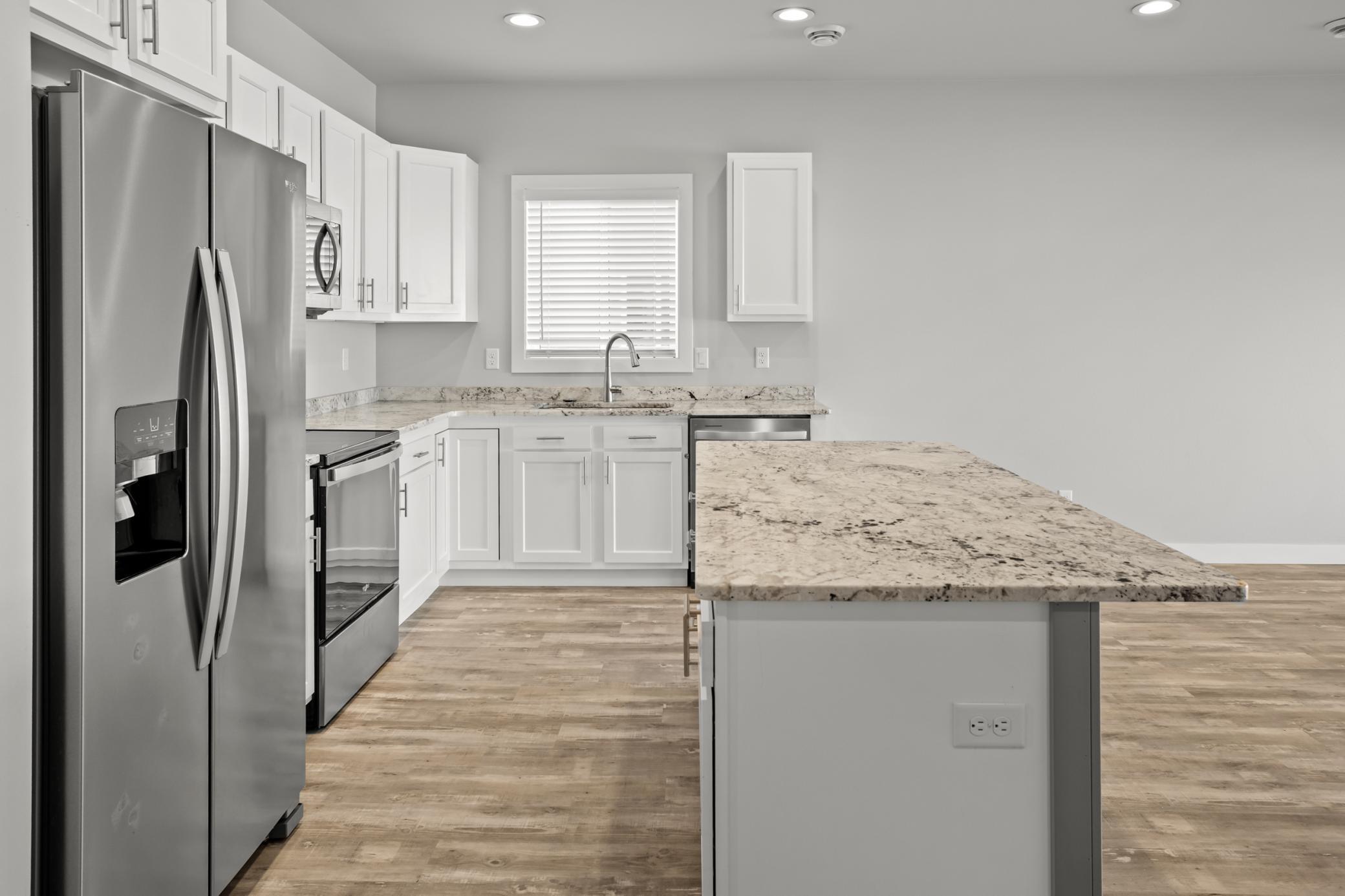 Welcome to this bright and beautiful slab-on-grade home offering comfort, convenience, and peaceful pond views. With 3 bedrooms and 2 bathrooms all on one level, the layout is designed for easy everyday living. The open-concept main living area is filled with natural light and centered around a cozy living room fireplace, creating a warm and inviting space to gather. The kitchen features granite countertops, a pantry closet for added storage, and a layout that flows seamlessly into the dining and living areasperfect for entertaining or relaxed evenings at home. Sliding patio doors lead out to the backyard where you can enjoy the tranquil pond view. The spacious primary suite includes a private bathroom with double sinks and quality finishes, while two additional bedrooms offer flexibility for guests, a home office, or hobbies. Additional highlights include a convenient laundry space with pocket door, a practical drop zone off the entry, and an attached two-stall garage that is already plumbed for a heater. Thoughtfully designed and move-in ready, this home combines modern updates with a functional layout in a peaceful setting.