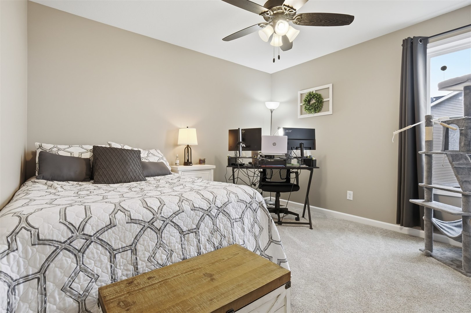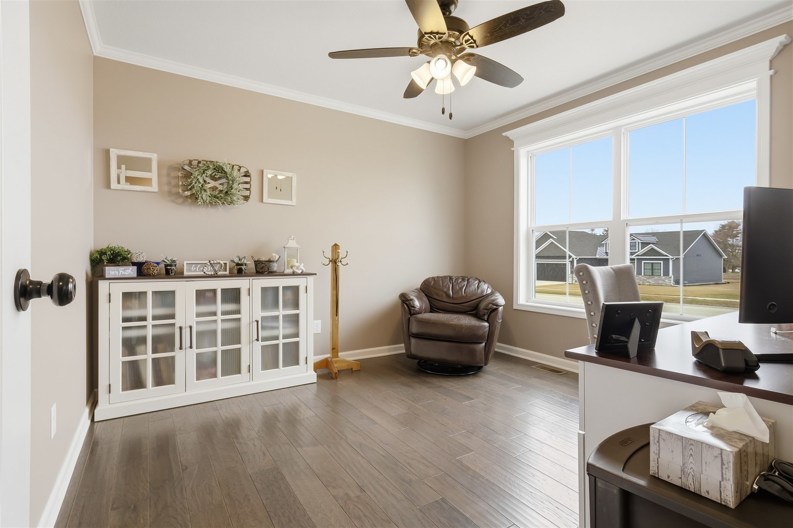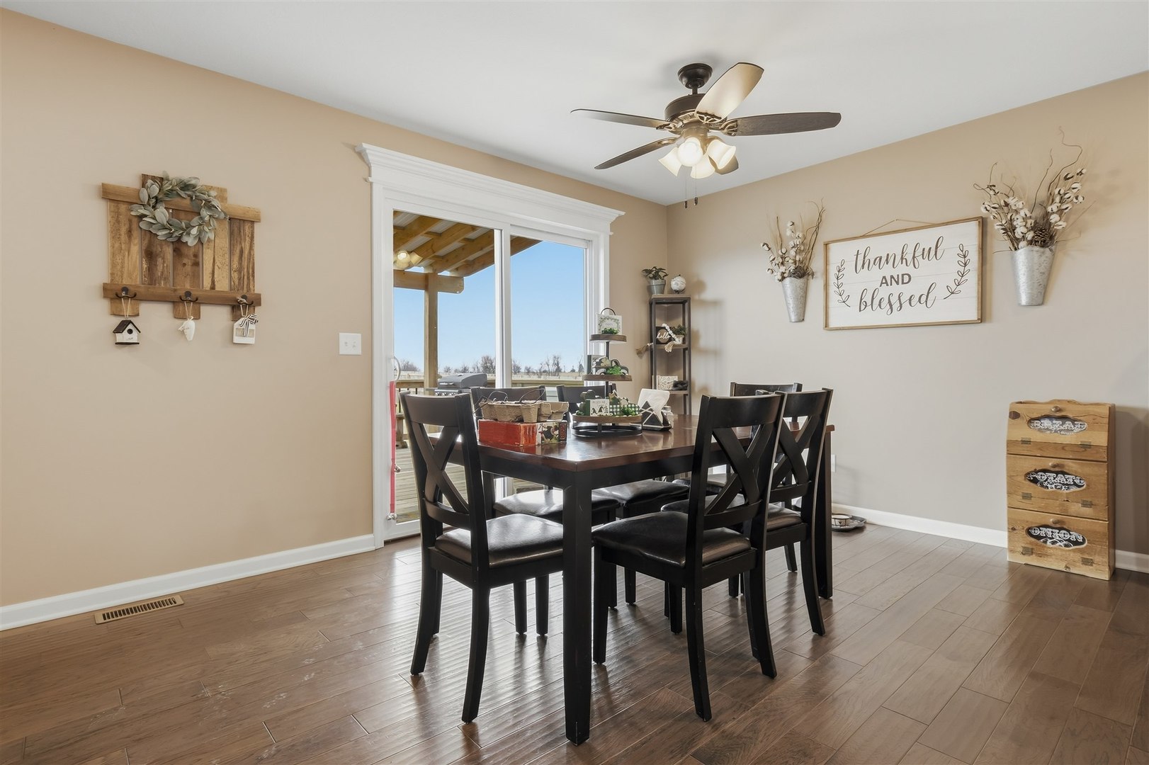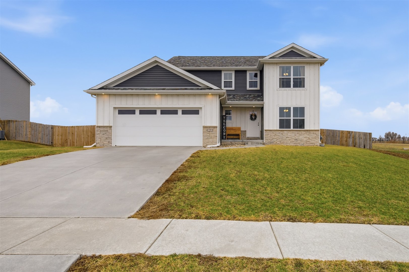 Welcome to Rock Creek in Carlock - a modern farmhouse-style home built in 2022 that looks just as good in person as it does at sunset. From the moment you pull up, the board-and-batten exterior, stone accents, and two-car garage make a strong first impression. Step inside and the quality of the build is immediately evident - rich hardwood-style flooring, crown molding in the main living areas, and an open layout that connects every space naturally. The kitchen is the heart of the main floor, featuring crisp white shaker cabinets, subway tile backsplash, pendant lighting over the island, stainless steel gas range, and clean white quartz-style countertops. It opens directly into the dining area, where a sliding glass door leads straight out to the deck - making indoor-outdoor flow effortless. A dedicated main-floor office with crown molding, hardwood floors, and a large window is a genuine work-from-home space, not an afterthought. First-floor laundry rounds out the main level. Upstairs, four bedrooms including a primary suite with private bath and walk-in closet. The secondary bedrooms are generously sized with hardwood-style flooring and great natural light. The finished basement adds a fifth bedroom, full bathroom, and a large rec area - ideal for guests, a playroom, or a home gym. Outside is where this property truly separates itself. The covered deck is built to last - full wood frame with a metal roof overhead, plenty of room for a dining set and a grill, and open views across the backyard. And that backyard? It's enormous. Fully fenced, flat, and wide open, with an above-ground pool already in place and room left over for a swing set, a garden, a fire pit, or all three. Unit 5 schools. Quick access to I-74, Rivian, and Bloomington-Normal. Barely three years old with nothing to do but move in. This one has the space, the finishes, and the outdoor setup that makes it a perfect place to call home.
