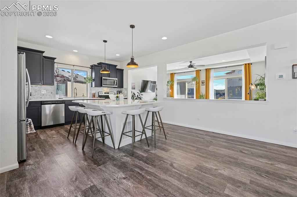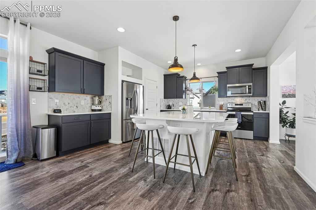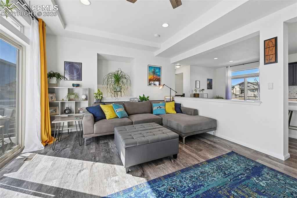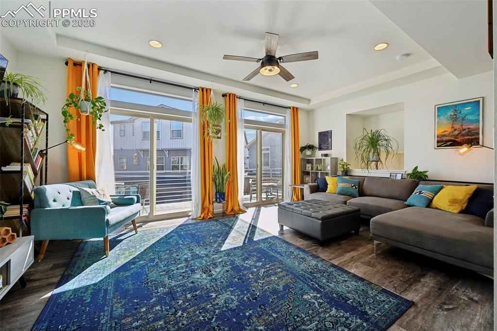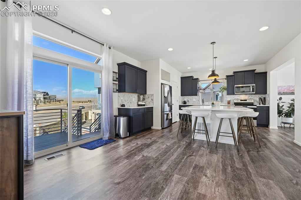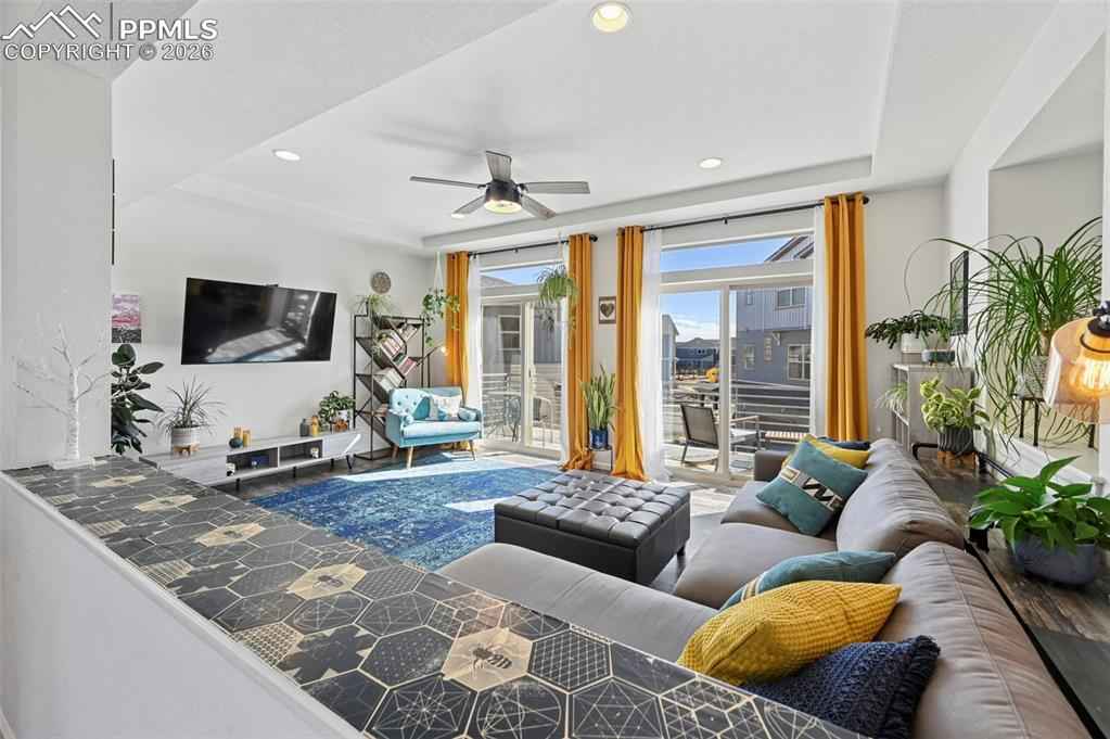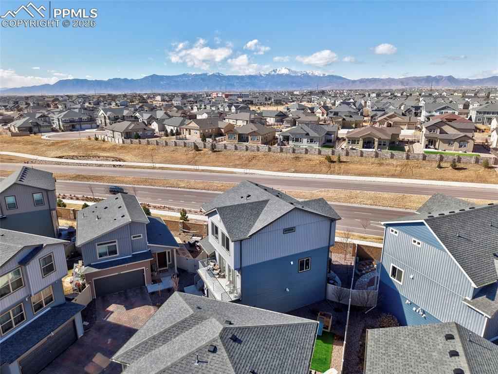 This absolutely gorgeous home features a stunning kitchen, 3 bedrooms, two living rooms, 3.5 bathrooms, and a 2 car garage in the sought after Banning Lewis Ranch community! Enter through the front door and walk up to the second level with open concept living room with double sliding door walk out access to the front deck, dining and kitchen area, perfect for entertaining guests. Spacious kitchen provides generous cabinet storage and counter space. Kitchen also features oversized barstool height center island with beautiful countertops, stainless steel appliances, and pantry. Just beyond the dining area walk through the sliding glass doors to the rear deck with the most breathtaking view of Pikes peak. Back down to the main level featuring a family room, full bath, and space that is currently being utilized as an exercise room but has many possibilities including another bedroom if needed. The main floor is level with the garage and has walkout access to the rear yard. Upstairs features all bedrooms, two full bath, and laundry on the same level. Master bedroom includes walk-in closet and gorgeous master bath with dual vanity. Bedrooms 2 and 3 are spacious and provide ample light through their picturesque windows. Enjoy your summer evenings barbecuing or playing games in the fully fenced rear yard. This fabulous home is located in the amazing Banning Lewis Ranch community with amenities galore. Walking distance to schools, hiking/biking trails, pools/parks, pickle ball courts and dog park. Community includes neighborhood schools, over 75 acres of parks/trails/open space, tennis courts, basketball court, rock climbing parks, zip-lines, access to pools, splash pad, water park, and dog park. Recreation center houses a fitness center and also regularly hosts classes and events for all ages. In the summer months, catch a neighborhood concert, festival, food trucks, farmers market or enjoy other regular community events. This community has it all.