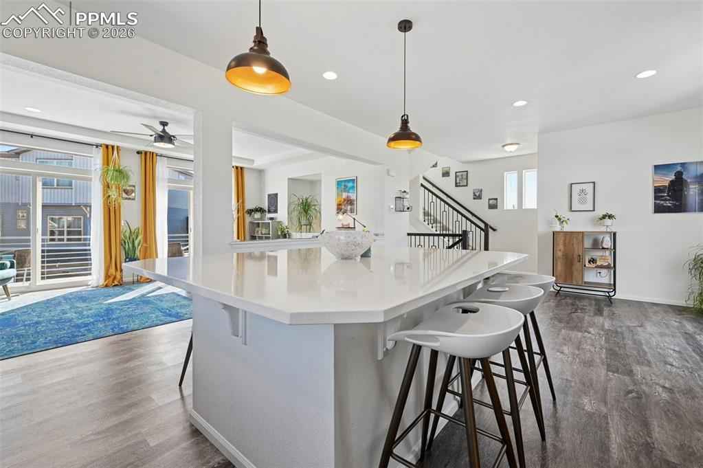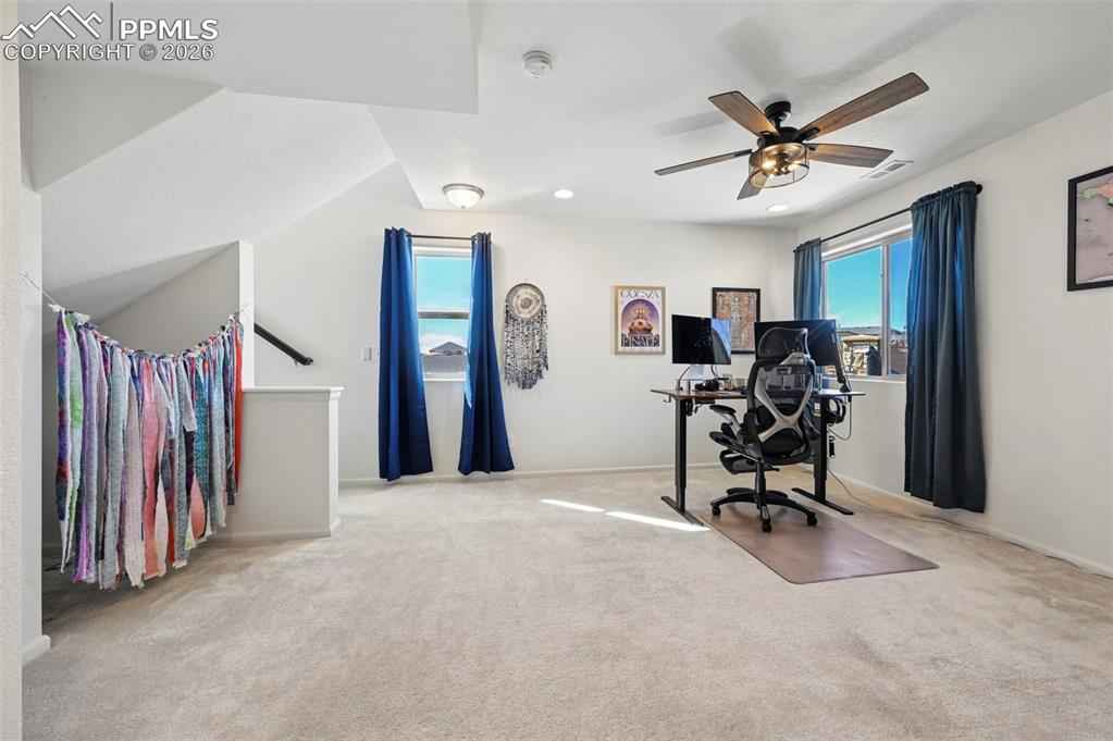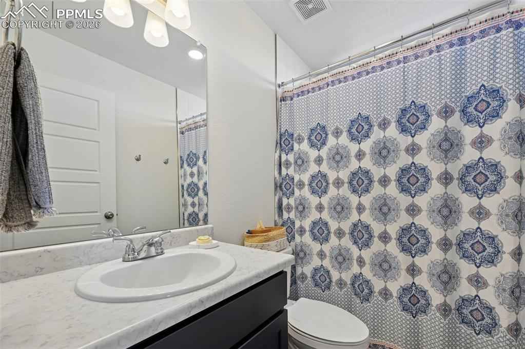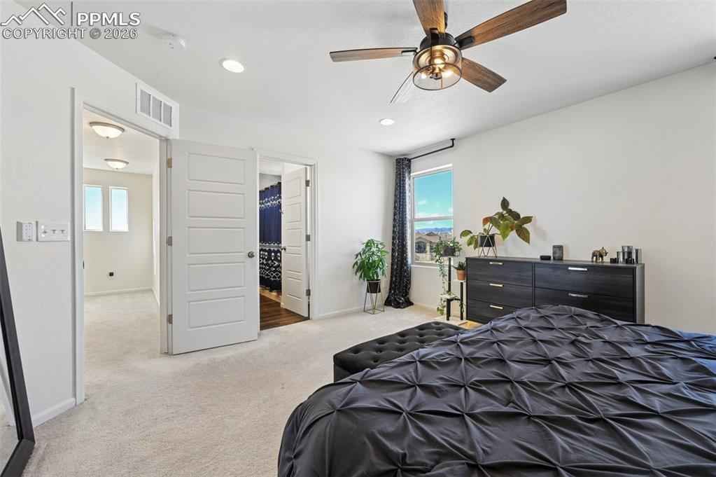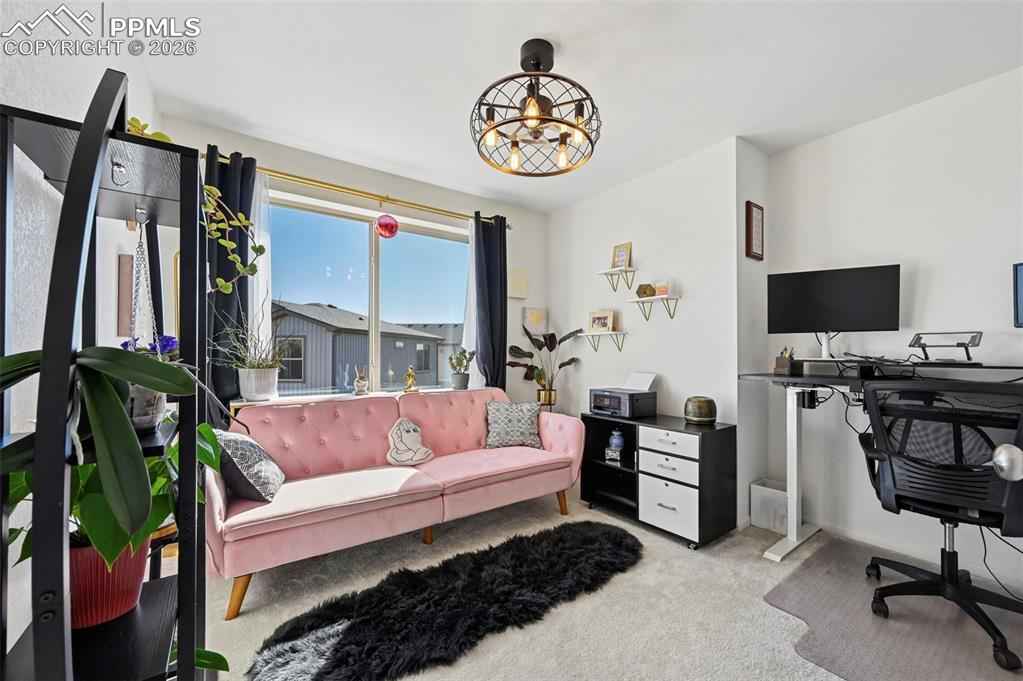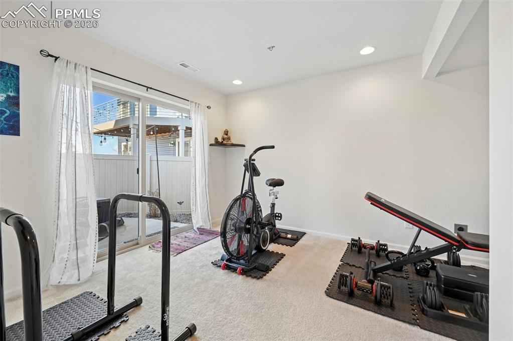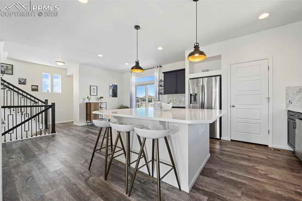 This absolutely gorgeous home features a stunning kitchen, 3 bedrooms, two living rooms, 3.5 bathrooms, and a 2 car garage in the sought after Banning Lewis Ranch community! Enter through the front door and walk up to the second level with open concept living room with double sliding door walk out access to the front deck, dining and kitchen area, perfect for entertaining guests. Spacious kitchen provides generous cabinet storage and counter space. Kitchen also features oversized barstool height center island with beautiful countertops, stainless steel appliances, and pantry. Just beyond the dining area walk through the sliding glass doors to the rear deck with the most breathtaking view of Pikes peak. Back down to the main level featuring a family room, full bath, and space that is currently being utilized as an exercise room but has many possibilities including another bedroom if needed. The main floor is level with the garage and has walkout access to the rear yard. Upstairs features all bedrooms, two full bath, and laundry on the same level. Master bedroom includes walk-in closet and gorgeous master bath with dual vanity. Bedrooms 2 and 3 are spacious and provide ample light through their picturesque windows. Enjoy your summer evenings barbecuing or playing games in the fully fenced rear yard. This fabulous home is located in the amazing Banning Lewis Ranch community with amenities galore. Walking distance to schools, hiking/biking trails, pools/parks, pickle ball courts and dog park. Community includes neighborhood schools, over 75 acres of parks/trails/open space, tennis courts, basketball court, rock climbing parks, zip-lines, access to pools, splash pad, water park, and dog park. Recreation center houses a fitness center and also regularly hosts classes and events for all ages. In the summer months, catch a neighborhood concert, festival, food trucks, farmers market or enjoy other regular community events. This community has it all.
