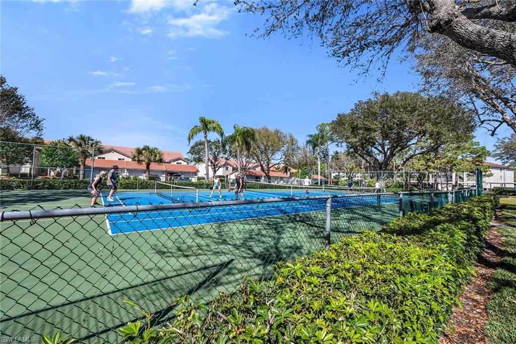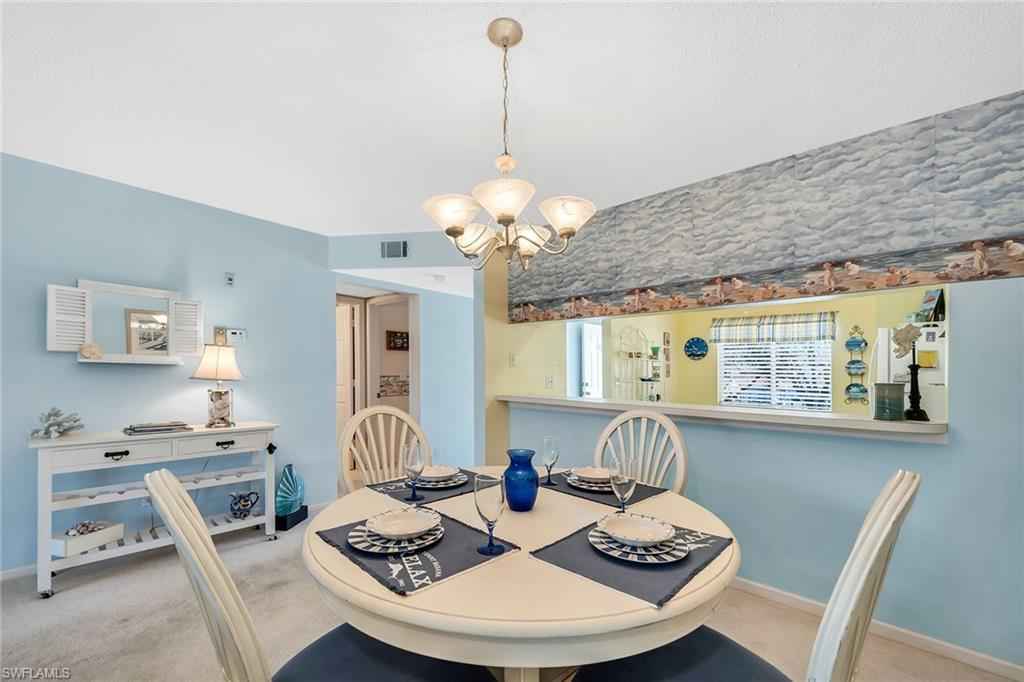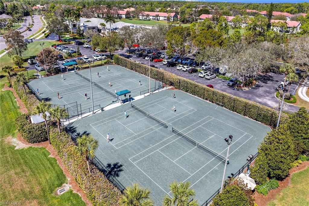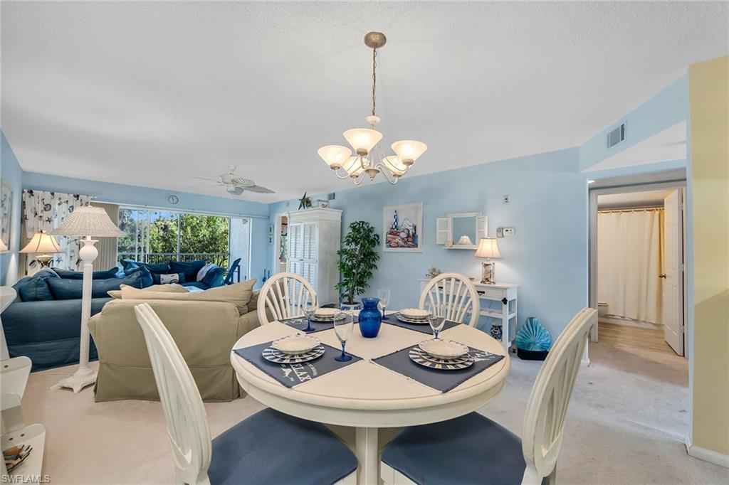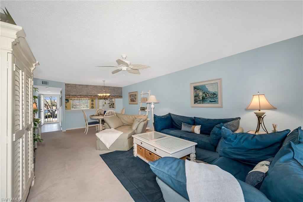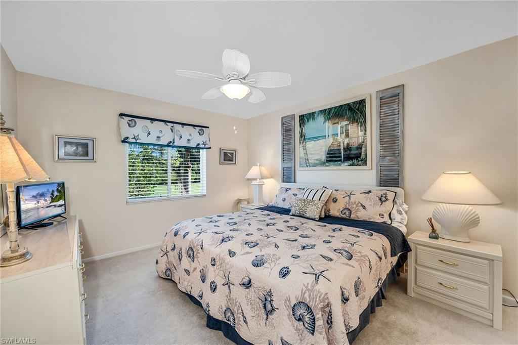 Positioned within Chatham Square at Glen Eagle, this inviting residence offers a sought-after bundled golf membership along with tranquil lake and golf course views. Enjoy tranquil views from your private screened lanai overlooking the lush fairways and sparkling lake, creating a peaceful backdrop for everyday living and relaxed outdoor enjoyment. With a desirable second-floor vantage point and a dedicated carport space, this two-bedroom, two-bath condominium presents an exceptional opportunity to embrace Naples golf lifestyle. The thoughtfully designed floor plan features a bright and open living and dining area with direct lanai access, allowing the beautiful lake and golf course views to become part of your daily experience. A formal dining space flows seamlessly into the living room, making the layout ideal for relaxed evenings and entertaining guests. The screened lanai, complete with a ceiling fan, provides comfortable outdoor living year-round while capturing sweeping views of the course and water. The kitchen is functional and inviting, offering a convenient pass-through window to the living room, a pantry for added storage, and a charming breakfast area set by a window with a ceiling fan. Appliances include a range, microwave and refrigerator/freezer, providing everything needed for effortless meal preparation. The primary suite serves as a comfortable retreat, featuring a ceiling fan and golf course views. The en-suite bath includes a sink vanity with a framed mirror and a shower-tub combination. The guest bedroom is thoughtfully positioned adjacent to a full bath with a shower-tub combo and includes ceiling fans for added comfort, making it ideal for visitors or flexible use as a home office. Residents of Glen Eagle Golf & Country Club enjoy an active, amenity-rich lifestyle centered around the 18-hole championship course. Additional offerings include tennis courts, a fitness center, resort-style pool, clubhouse dining and a vibrant year-round social calendar. Ideally in South Naples, this community is just minutes from the white sand beaches of the Gulf and renowned destinations of Old Naples, Fifth Avenue South, Third Street South, Naples Pier, Waterside Shops, Artisx2014;Naples, Venetian Bay, Bayfront and Mercato, offering the best of Naples living.