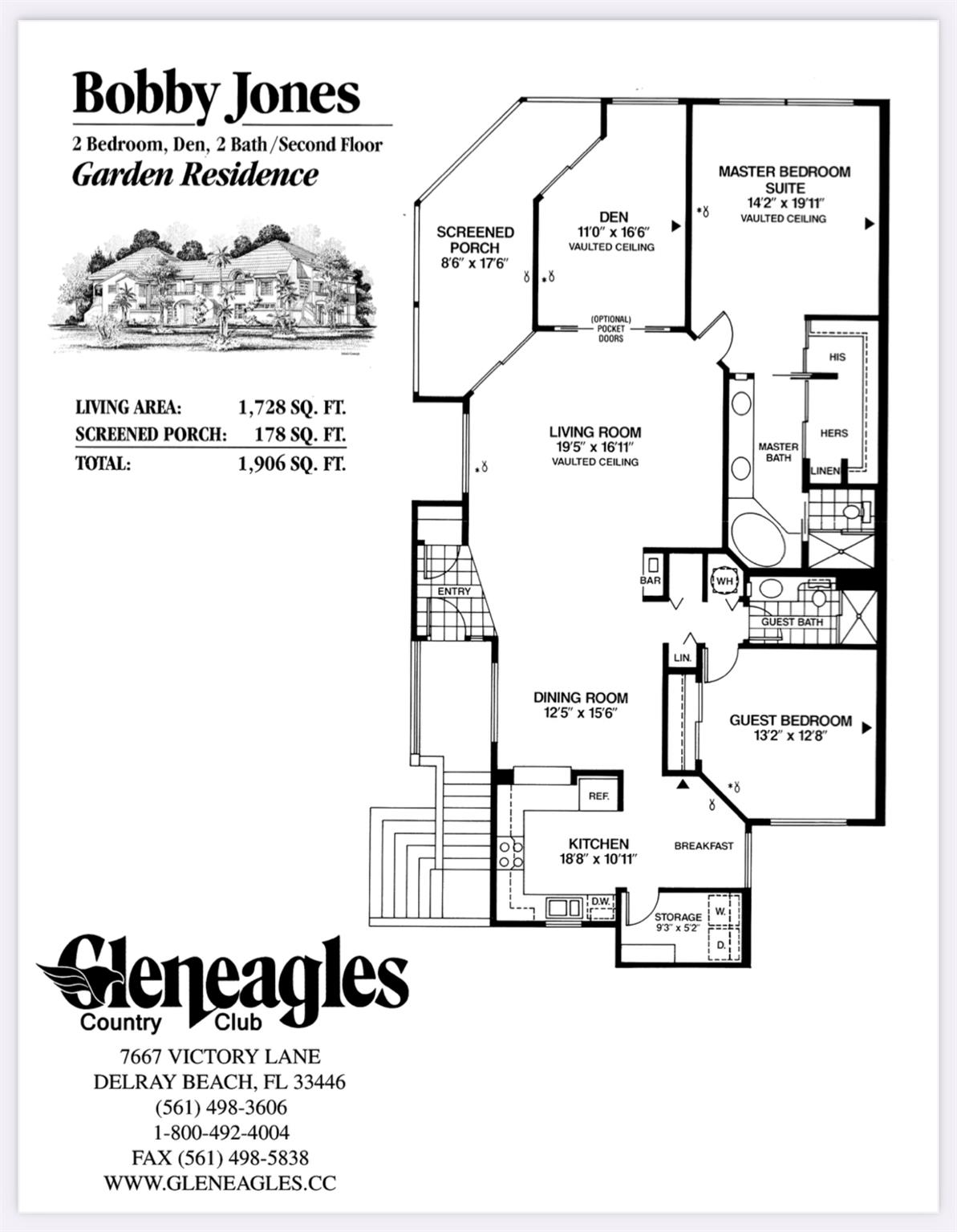 Embrace resort-style living and a Country Club lifestyle in the desirable Clunie enclave of Gleneagles, close to everything wonderful that Delray and Boca have to offer! Spacious second level Bobby Jones residence is not only one of the largest floor plans available, but also offers SWEEPING GOLF VIEWS of DOUBLE-WIDE FAIRWAYS, 3rd & 6th greens, and 4th tee! Nearly 2,000 total square feet, vaulted ceilings, 2 bedrooms, 2 baths, den, wrap-around balcony, and convenient personal parking space at your doorstep with plenty of guest spots. Safety and security are top priorities with two manned guard gates and 24-hour mobile patrols ensuring your comfort. Gleneagles Country Club is the ultimate destination for both seasonal and full-time residents looking to live life to the fulles