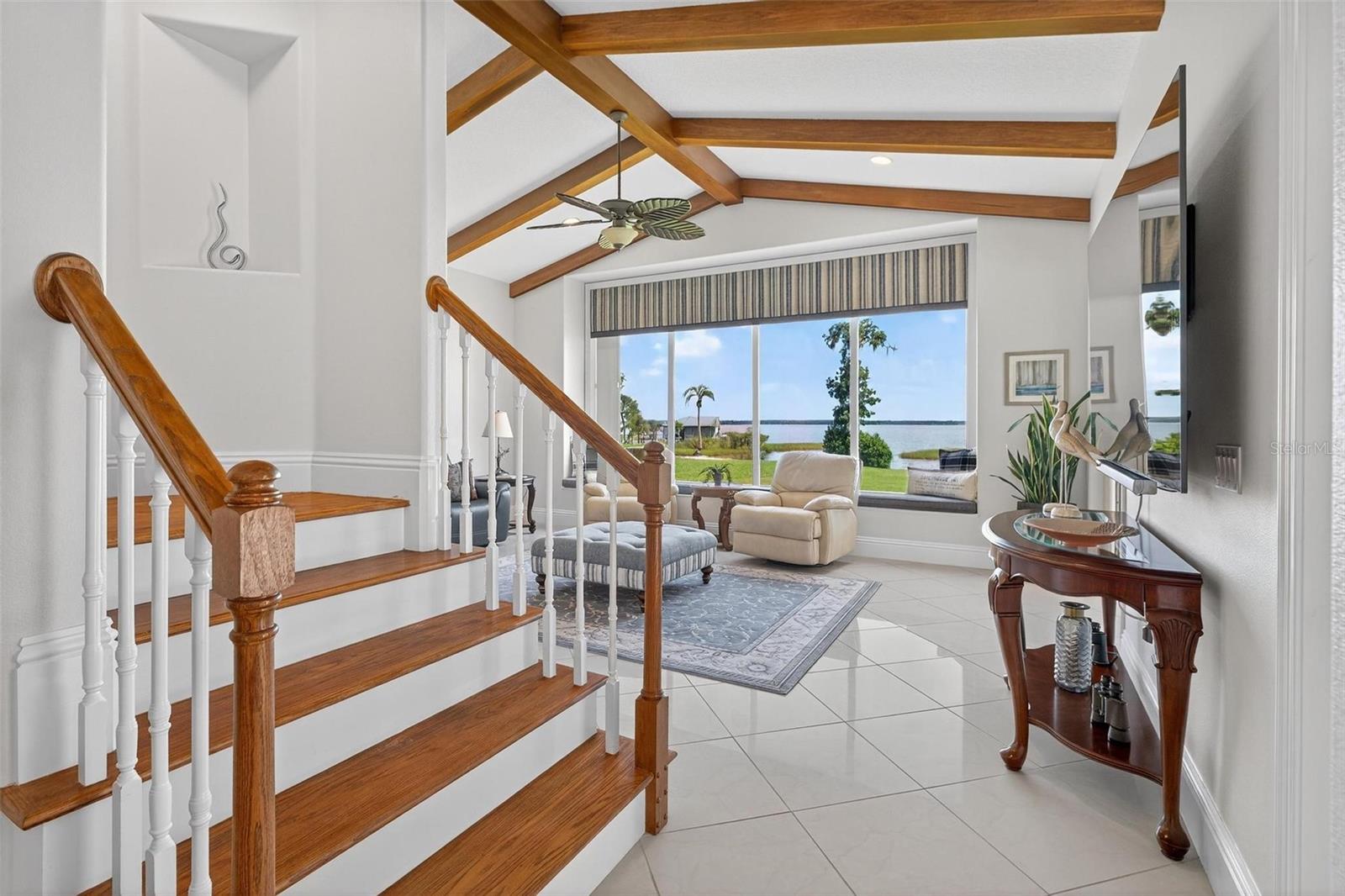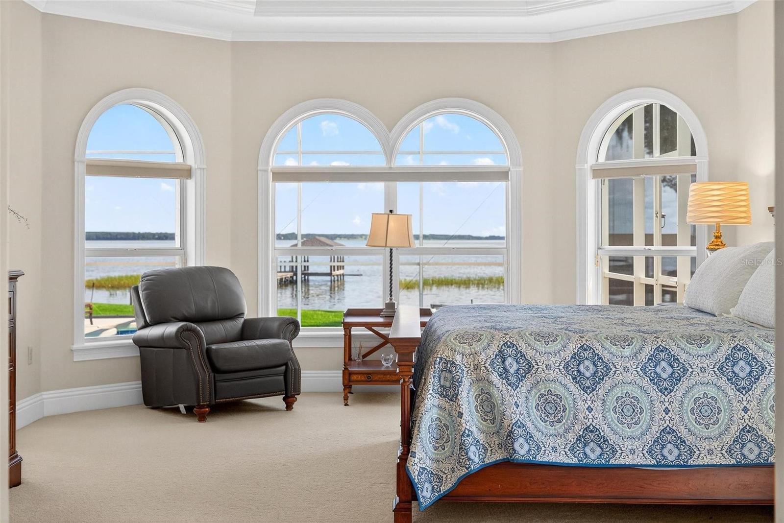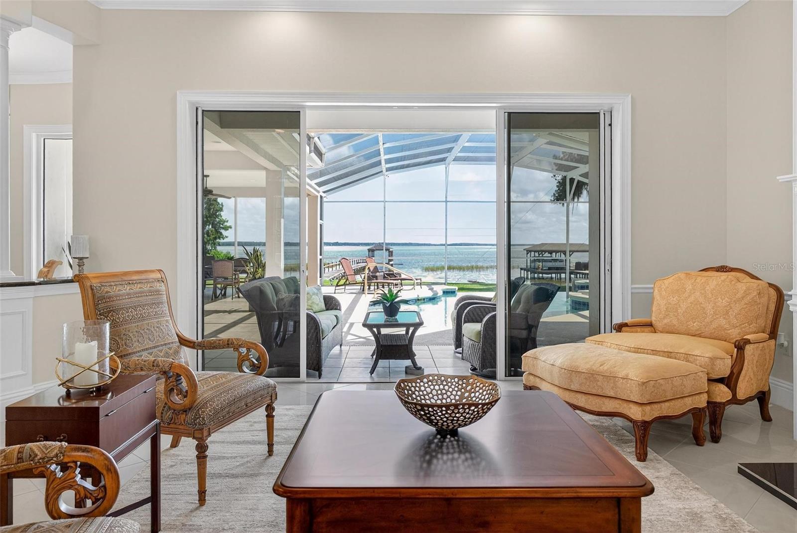 Luxury Lakefront Estate on Lake Harris. Offered to the discerning buyer seeking the optimum in waterfront living. This alluring custom estate nestled on 0.83 acres with 105 feet of unobstructed shoreline directly on the inviting waters of Lake Harristhe largest of the renowned Harris Chain of Lakes, which is the largest chain in Florida. Located in the desirable Lakes & Springs community, this private executive retreat offers 4,288 square feet of elegant, yet functional living space, featuring four oversized en-suite bedrooms (three on the main level), a private home office, and captivating panoramic views stretching over five miles of open water. The estate combines timeless craftsmanship and refined updates, including a new roof in 2024, as well as fresh interior and exterior paint. Inside, the residence boasts a gracious owners suite with sweeping lake views, dual walk-in closets, and a spa-style bathroom complete with a walk-in shower and dual vanities. The formal living room with a gas fireplace offers sophistication and warmth, while the chefs kitchen is appointed with high-end appliances, custom cabinetry, and expansive sightlines over the lake. Multiple living areas include a second family room with mitered glass sliding doors that open seamlessly to the pool and outdoor entertaining area. Upstairs, a fully equipped entertainment suite with kitchenette opens via French doors to a stunning 30-foot balcony offering unrivaled lake vistas. The outdoor living experience is equally exceptional, centered around a dramatic infinity-edge saltwater pool with a whirlpool spa, both heated and fully Wi-Fi controlled via smartphone. The expansive screened enclosure includes multiple seating and dining zones perfect for entertaining, all while savoring unobstructed views of the lake and direct access to your private boat dock. With daily sunrises and sunsets, along with rich birdlife and natural surroundings, the setting offers tranquility and spectacle in equal measure. Situated on a quiet cul-de-sac just minutes from the iconic Yalaha German Bakery & Beer Garden, and 10 minutes from Mission Inn Resorts world-class golf, spa, and dining, the home is also a short drive to Lakeridge Winery, The Villages, and charming Mount Dora. Downtown Orlando is just 45 minutes away, with convenient access to both Orlando International (MCO) and Sanford (SFB) airports within an hours drive. This home is a rare offeringone that blends privacy, elegance, and recreation in an idyllic lakefront setting. Whether you are seeking a peaceful escape, a grand seasonal retreat, or your forever home, 7303 Birds Nest Court delivers an unmatched comfortable and quality lifestyle. Come take a look!